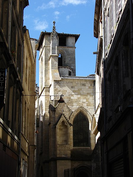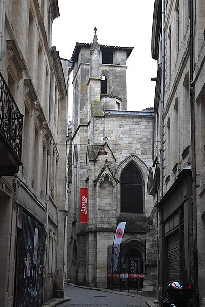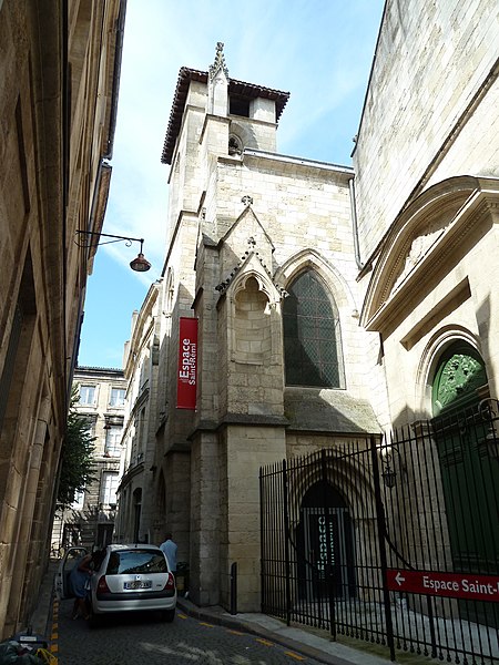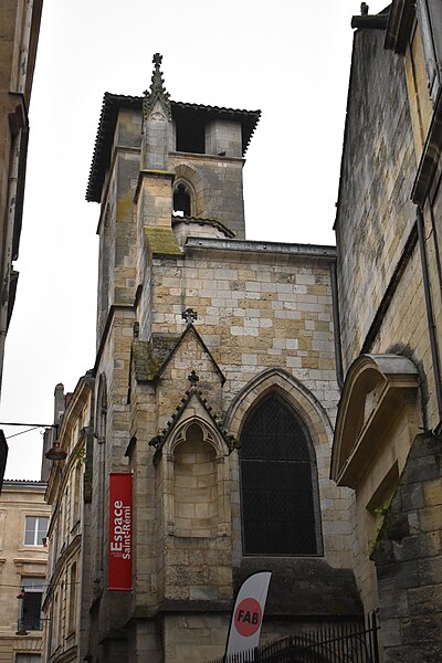 L’église Saint-Rémi, située rue Jouannet dans le quartier Saint-Pierre à Bordeaux (Gironde), est aujourd’hui intégrée à un îlot de vieilles maisons ; seule une partie de la façade et le clocher en saillie restent visibles depuis la rue. Selon les sources, l’édifice conserve des éléments romans attribués au XIe siècle et a fait l’objet de reconstructions aux XIVe et aux XVe–XVIe siècles, donnant lieu à un vaste bâtiment de la fin du XVe siècle. Le clocher, bâti au XIVe siècle, est en partie dérasé. L’église est orientée et organisée suivant un plan allongé comprenant deux grandes nefs, chacune terminée par une abside polygonale, et deux nefs latérales plus étroites. Entre les deux chevets se trouve une salle voûtée qui servait de sacristie, surmontée d’une chambre accessible par un escalier aménagé dans l’angle d’un contrefort. Les voûtements présentent des dispositions particulières : la nef sud n’appuie qu’une fois sur un côté et trois fois sur l’autre, et la voûte du chevet de la grande nef nord a été démolie jusqu’à l’arc triomphal. L’intérieur a été profondément transformé par l’installation de plusieurs planchers et cloisons en bois ; il ne subsiste de l’ancienne configuration qu’une travée occidentale, accompagnée du clocher de la même époque. L’édifice mesure environ quarante mètres de longueur sur trente-quatre mètres de largeur ; des caveaux existent sous le bas-côté méridional et sous la sacristie, et de nombreux tombeaux, notamment sous les absides, abritent des membres de vieilles familles bordelaises. En 1866, des fouilles effectuées à l’extrémité orientale du bas-côté sud ont mis au jour une salle souterraine ornée d’une mosaïque gallo-romaine ; des fragments de peinture murale ont par ailleurs été découverts au niveau du chevet nord et du mur entourant la sacristie. L’église a été implantée à proximité d’un mur romain et, selon la tradition, occuperait l’emplacement d’un ancien temple dédié à Jupiter. Fermée au culte durant la Révolution française, sa circonscription fut partagée en 1791 entre trois nouvelles paroisses — Saint-Dominique (actuelle église Notre‑Dame), Saint-Louis des Chartrons (chapelle des Carmes) et Saint-Martial (Bacalan) — puis l’édifice fut vendu comme bien national le 13 février 1792 pour 107 088 francs 87 centimes. Durant près de deux siècles, il connut des usages variés (magasin à fourrage, magasin des douanes, écurie, garage, réserve lapidaire du musée d’Aquitaine). Classée au titre des Monuments historiques en 1923, l’église a été réhabilitée à partir de 1998 puis transformée en espace culturel, l’Espace Saint-Rémi, à partir de 2000, dédié aux expositions et manifestations artistiques. Malgré ces aménagements, le bâtiment reste affecté par des problèmes d’humidité et des défauts de solidité. Parmi les éléments de décor ancien subsistent quelques sculptures et traces de fresques ; on note aussi que des paroissiens avaient commandé un mobilier tel qu’une chaire en bois sculptée par Cabirol, transférée par la suite à l’église Saint‑André de Bordeaux. Une nouvelle église Saint‑Rémi de la Vigne, édifiée en 1866 au 117 rue Achard, au bas Bacalan, a pris le relais du culte ; elle présente un plan basilical, une façade sobre encadrée de pilastres doriques, une porte monumentale à fronton triangulaire et un clocher de faible hauteur sur le flanc sud.