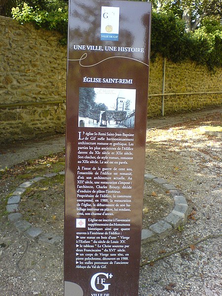 L'église Saint-Rémi, église paroissiale catholique dédiée à l'évêque Rémi de Reims, se situe à Gif-sur-Yvette dans l'Essonne, en Île-de-France. Elle est implantée sur le versant nord de la vallée de l'Yvette, un peu en aval de la confluence avec la Mérantaise, et domine l'actuel centre-ville depuis la place de l'église qui marque l'intersection de la rue Neuve, de la rue Gustave Vatonne, de la rue Alphonse Pécard et de la rue Henri Amodru. La première mention d'une église à cet emplacement apparaît en 813 dans un inventaire des revenus de l'abbaye de Saint-Germain-des-Prés ; elle était alors desservie par un prêtre nommé Warodus. L'édifice originel a été édifié au XIIe siècle, remanié au XVe siècle après avoir été ravagé pendant la guerre de Cent Ans, puis restauré au XIXe siècle. En 1859, Napoléon III offrit à la paroisse un Ecce Homo peint par Louis Dauberon en 1800, et en 1862 l'architecte Charles Brouty entreprit une importante restauration visant à unifier le style de l'édifice en masquant certains arcs d'origine par des moulures en plâtre inspirées des profils gothiques du XVe siècle. L'église a été inscrite au titre des monuments historiques le 21 décembre 1938. Une campagne de restauration lancée en 1985 et conduite par Thierry Mariage, architecte des Bâtiments de France, a duré cinq ans ; elle a porté sur l'aménagement des abords, l'assainissement du terrain, la réfection de la couverture du clocher, la restauration des façades en pierre meulière et la suppression des revêtements néogothiques intérieurs, ce qui a permis de faire apparaître des éléments d'origine des XIIe et XIIIe siècles. Ces travaux ont également mis au jour une litre funéraire de la famille Mérault, seigneurs de Gif entre 1657 et 1767, des croix de consécration attestant la bénédiction de l'église en juillet 1561, ainsi qu'une statue polychrome féminine retrouvée sans tête derrière une cloison de plâtre. L'édifice est construit en meulière et en grès ; son architecture mêle un noyau roman, un développement gothique lié aux remaniements du XVe siècle et des interventions néogothiques du XIXe siècle. Le clocher, renforcé par des contreforts et percé de baies géminées, conserve un caractère roman tandis que le reste du bâtiment présente majoritairement des traits gothiques. Le plan est particulier : la nef est orientée ouest–est mais le portail se trouve sur la façade méridionale, marquée par quatre pignons distincts soutenus par des contreforts. Quatre baies percent chaque façade latérale de la nef et une baie plus importante ouvre sur le chevet plat. La nef est voûtée par quatre ogives appuyées sur des piliers à chapiteaux cubiques qui séparent les bas-côtés. À l'intérieur, la litre funéraire des seigneurs de Mérault figure en haut des piliers, la croix de consécration de juillet 1561 se trouve à proximité, et l'église conserve une Vierge à l'Enfant en bois du XVIIIe siècle ainsi que des stalles en bois sculpté du XVe siècle, classées au titre des monuments historiques depuis le 20 février 1915. Les photographies associées montrent la place de l'église et la façade méridionale, le clocher, l'entrée latérale et le panneau explicatif installé devant l'édifice. Des articles liés évoquent le diocèse d'Évry-Corbeil-Essonnes et la liste des monuments religieux de l'Essonne, et des ressources en ligne telles que Mérimée, Clochers de France, GCatholic.org et l'Observatoire du patrimoine religieux fournissent des informations complémentaires.