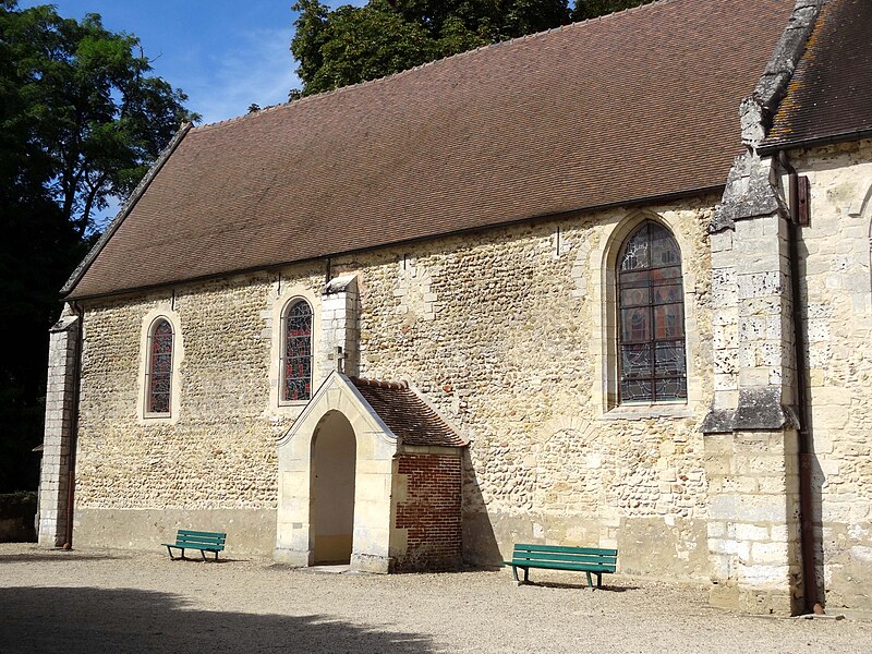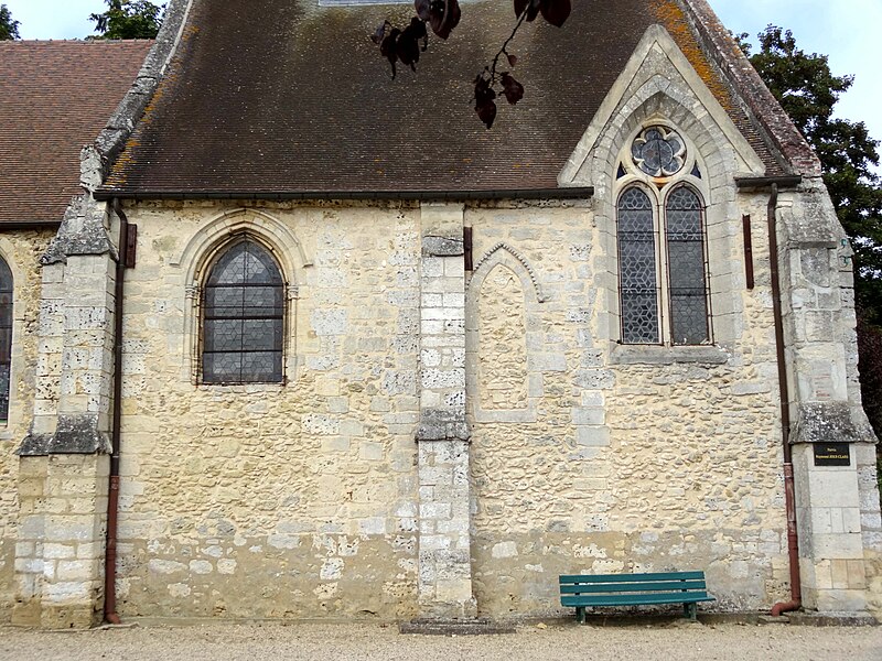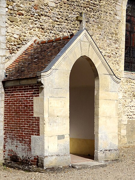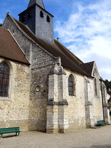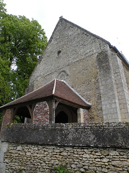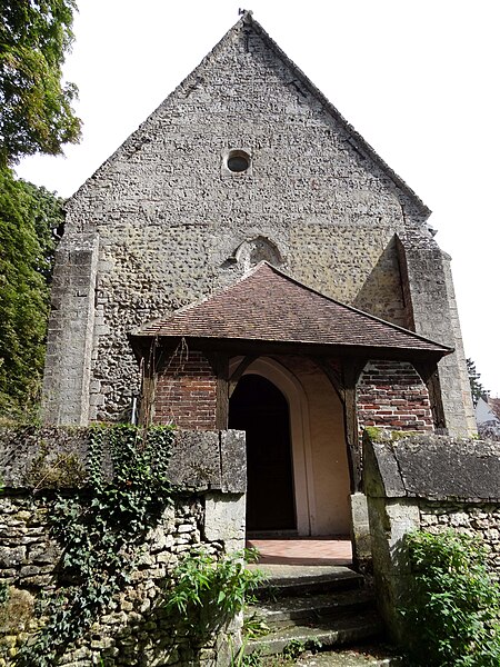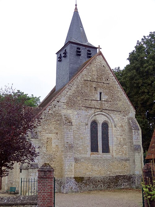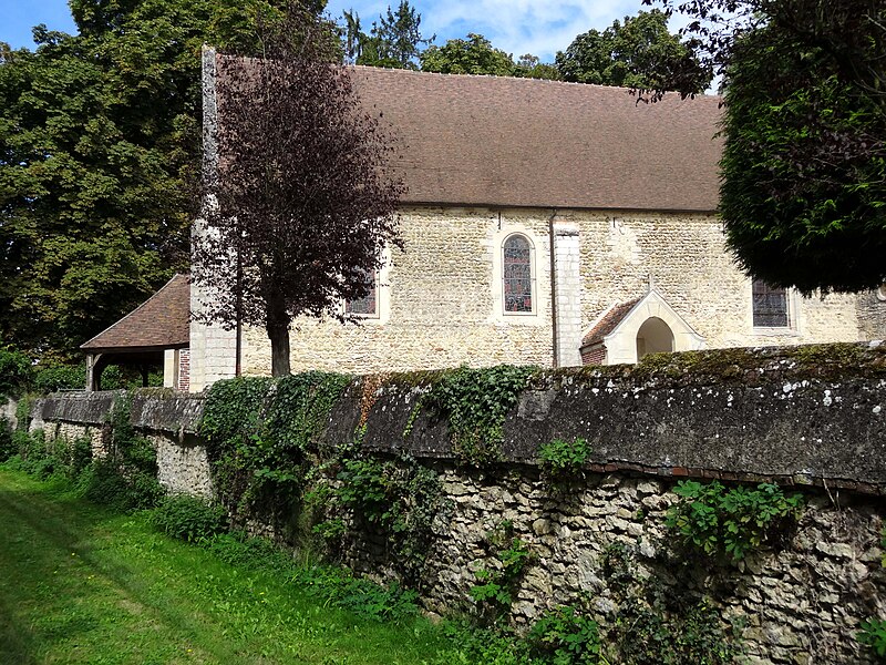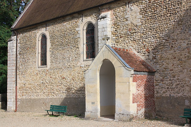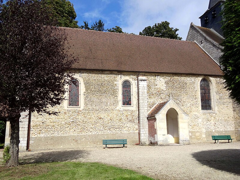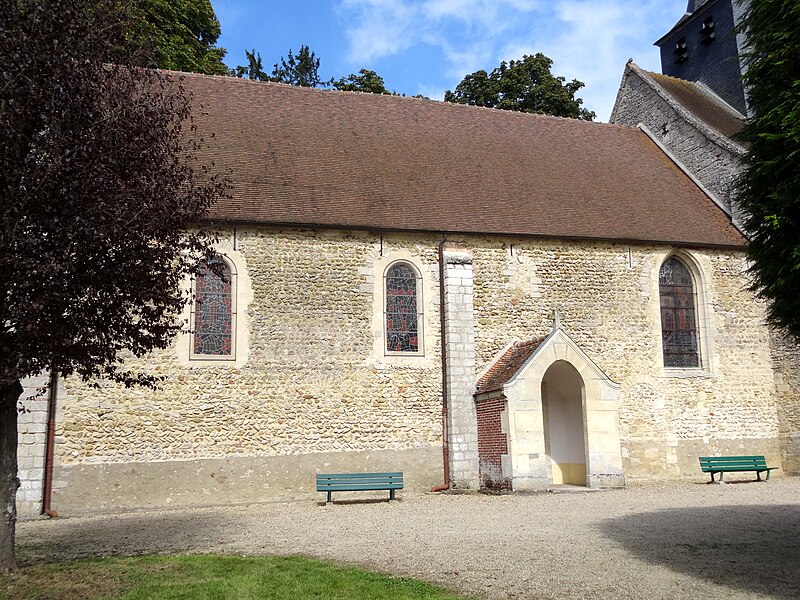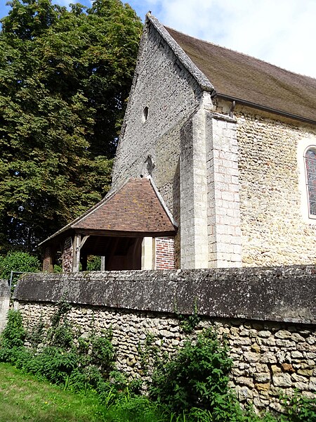 L'extérieur témoigne d'un usage important de moellons de silex, employé notamment en opus spicatum sur la moitié basse du mur sud, tandis que la pierre de taille est réservée aux contreforts, chaînages et entourages de baies. La façade occidentale est épaulée par contreforts et percée d'un oculus singulier taillé dans un bloc unique ; le portail occidental a été remanié en arc parabolique sans tympan et le porche ouest est en charpente avec remplissages de briques évoquant le colombage. Le porche méridional, de facture remaniée, possède un petit pignon orné d'une croix en antéfixe et une entrée en arc parabolique ; le portail méridional en anse de panier, plus ancien, paraît de style XVIe siècle. Les parties orientales présentent des contreforts saillants et divers ornements de fenêtres, dont des têtes de clous et une tête grimaçante au chevet.