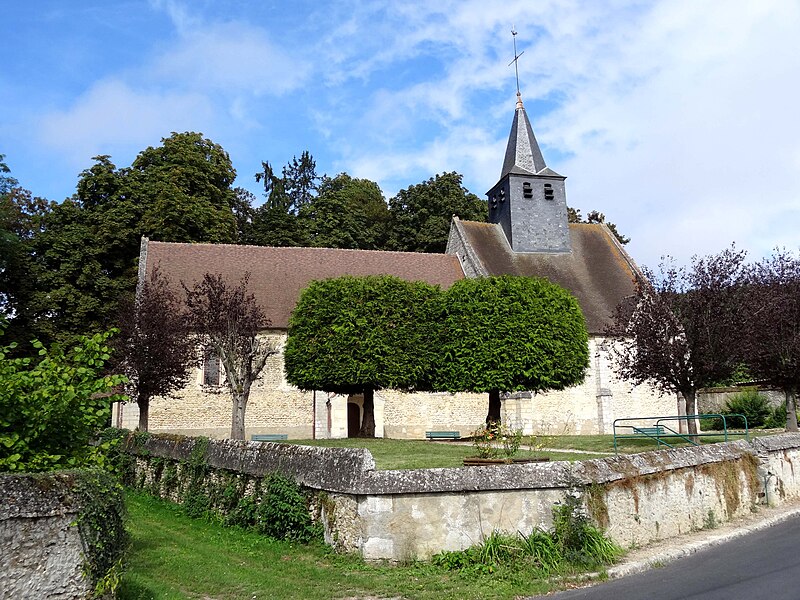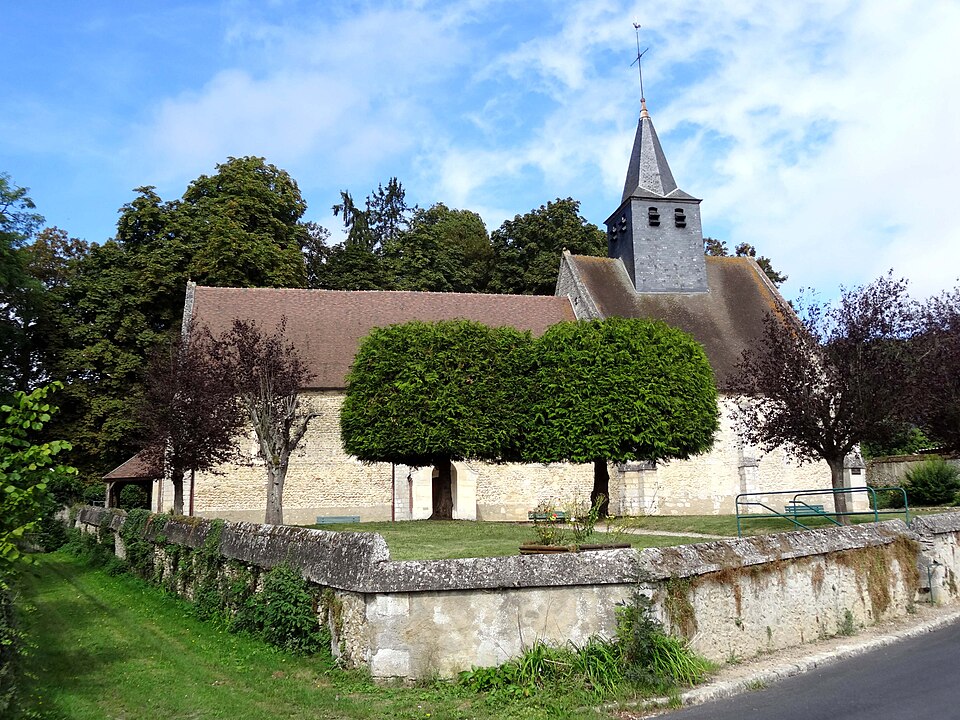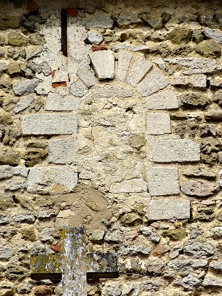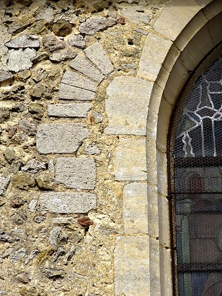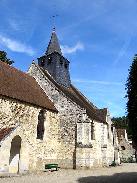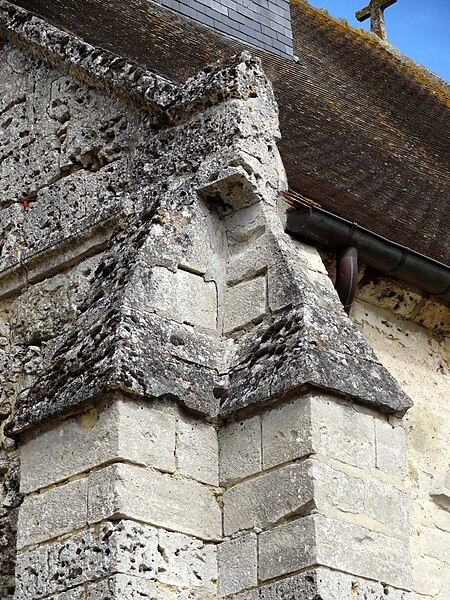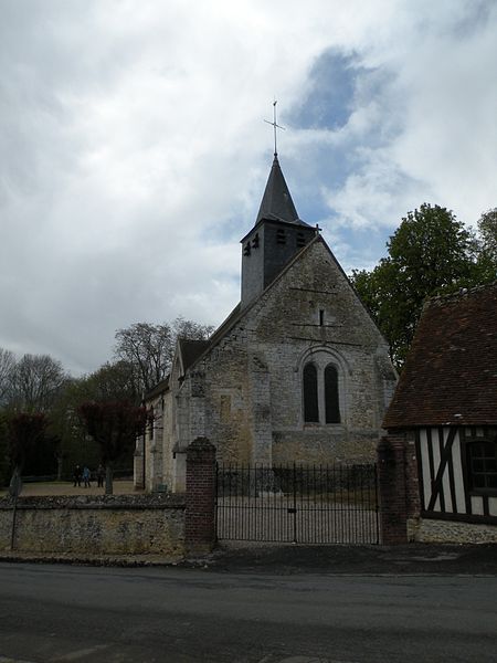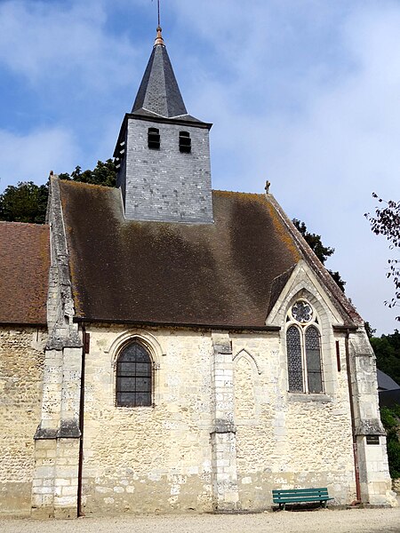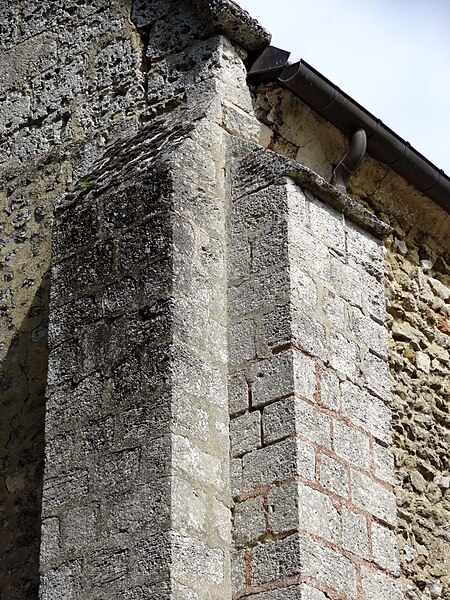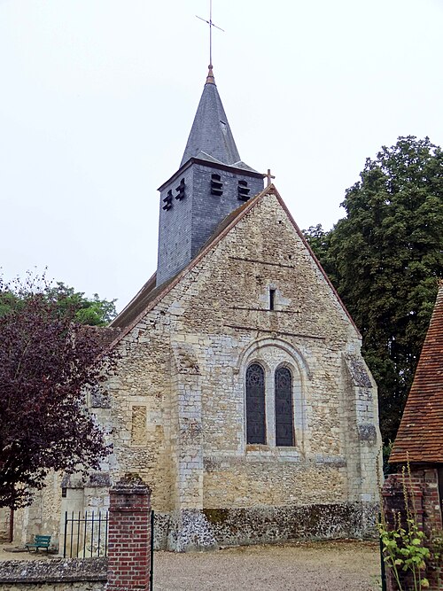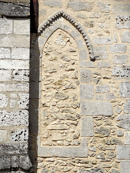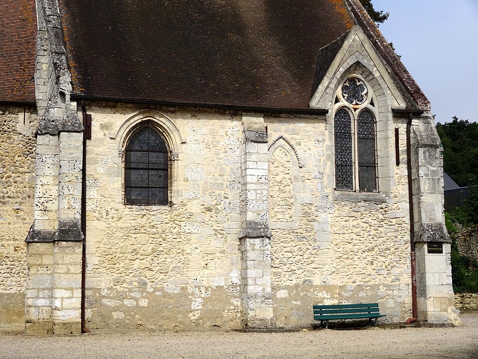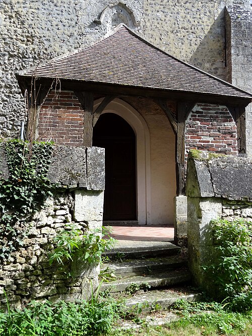 L'extérieur témoigne d'un usage important de moellons de silex, employé notamment en opus spicatum sur la moitié basse du mur sud, tandis que la pierre de taille est réservée aux contreforts, chaînages et entourages de baies. La façade occidentale est épaulée par contreforts et percée d'un oculus singulier taillé dans un bloc unique ; le portail occidental a été remanié en arc parabolique sans tympan et le porche ouest est en charpente avec remplissages de briques évoquant le colombage. Le porche méridional, de facture remaniée, possède un petit pignon orné d'une croix en antéfixe et une entrée en arc parabolique ; le portail méridional en anse de panier, plus ancien, paraît de style XVIe siècle. Les parties orientales présentent des contreforts saillants et divers ornements de fenêtres, dont des têtes de clous et une tête grimaçante au chevet.