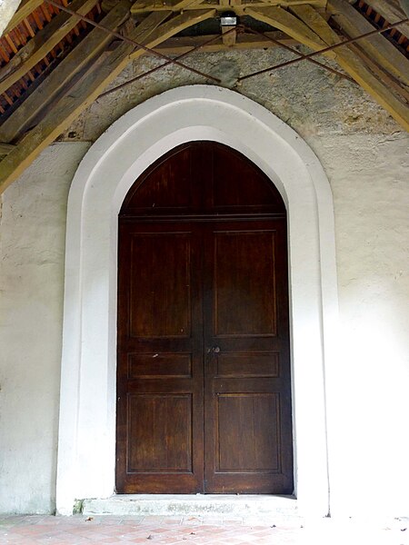 L'église est orientée et présente un plan simple mais non symétrique : un porche devant le portail occidental, une nef unique lambrissée, un chœur de deux travées dans l'axe de la nef, un collatéral au sud et un chevet plat. Une cage d'escalier hors-œuvre flanque le chœur au nord et un clocher en charpente, coiffé d'une flèche octogonale, s'élève au-dessus de la première travée du chœur ; l'ensemble est couvert d'ardoise. La longueur totale est de 35 m, dont plus des deux tiers relèvent de la nef. La nef, bien que simple dans son plan, est spacieuse et peut accueillir plus de deux cents fidèles ; son lambris rustique rapproche la facture d'exemples locaux. On distingue six entraits visibles de la charpente, disposés à équidistance mais sans correspondance précise avec des travées.