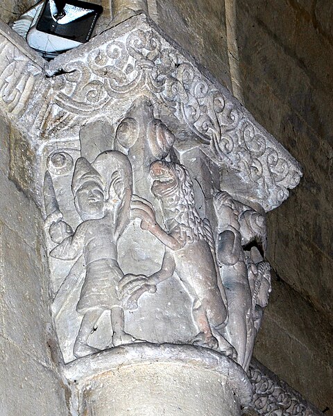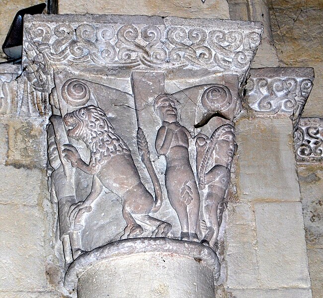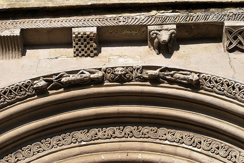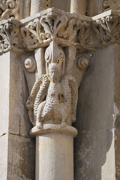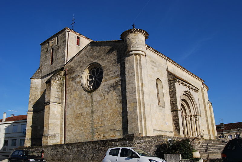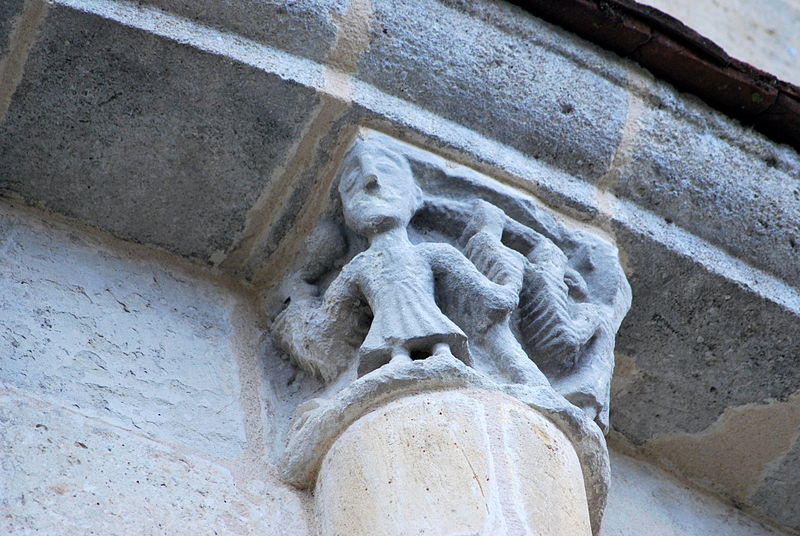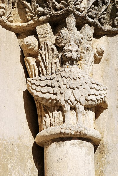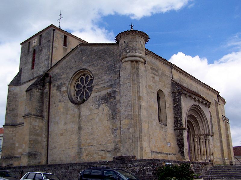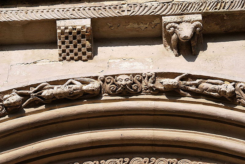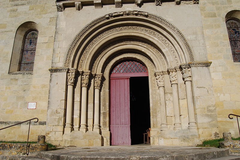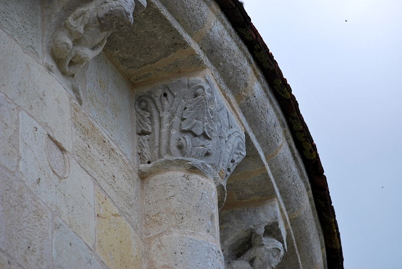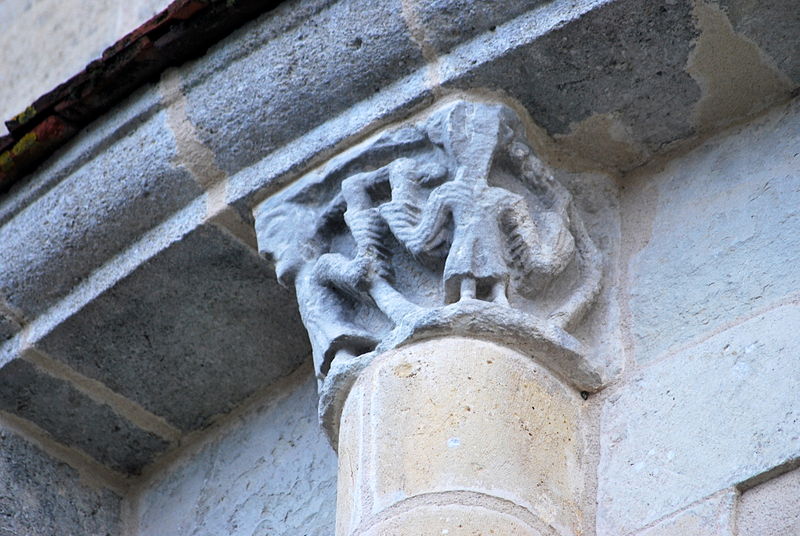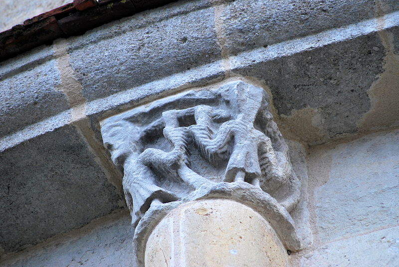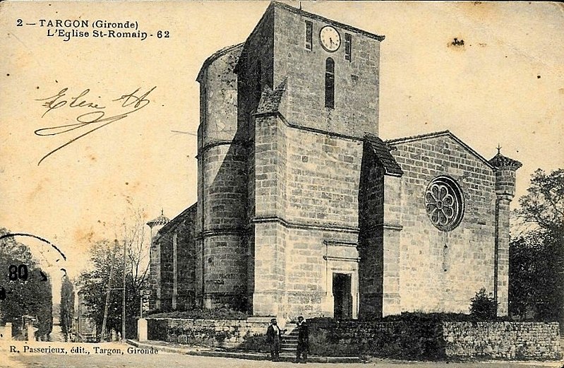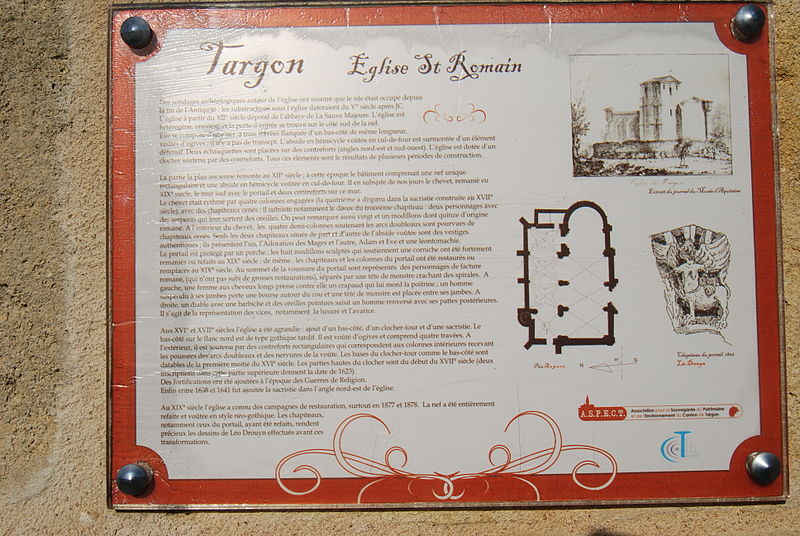 L'église Saint-Romain se situe à Targon (Gironde), sur la place centrale en face de la mairie, à l'intersection des routes départementales D11 et D237. Peut-être d'origine templière, elle a été édifiée en style roman au XIIe siècle et dépendait de l'abbaye de La Sauve-Majeure dès cette époque. À l'origine, l'édifice comprenait une nef unique rectangulaire et une abside en hémicycle voûtée en cul-de-four, avec une porte sur le côté sud. L'église a été fortifiée et agrandie aux XVe siècles : on note l'ajout d'un bas-côté gothique, la construction d'un clocher-tour vers 1623 et l'établissement d'une sacristie vers 1640. La partie basse du clocher est datée du XVIe siècle ; l'étage supérieur, qui porte l'inscription 1673, correspond à une reprise au XVIIe siècle. Le clocher abrite trois cloches, la plus ancienne étant fondue en 1505 ou 1517. Pendant les Guerres de religion, le chevet a été surélevé et aménagé en chambre forte pourvue de meurtrières, et des échauguettes de type « poivrière » aux angles nord-est et sud-ouest datent de la Renaissance. Des campagnes de restauration et de transformation ont eu lieu aux XIXe siècles, notamment en 1859, 1877 et 1878, avec une intervention supplémentaire en 1897 sur certains chapiteaux et fenêtres ; le cimetière et sa croix ont été déplacés au XIXe siècle. L'édifice a été inscrit au titre des monuments historiques par arrêté du 21 décembre 1925. Le clocher fortifié et plusieurs vestiges romans caractérisent encore l'église : chapiteaux historiés du XIIe siècle représentant notamment Adam et Ève, un agneau accolé à une croix et l'Adoration des Mages. Le portail occidental s'ouvre en plein cintre, précédé de piédroits cantonnés de colonnes et de voussures en retrait ; les chapiteaux et les arcs conservent des sculptures romanes, parfois remaniées. Les modillons, les chapiteaux et les colonnes du portail ont été en grande partie refaits au XIXe siècle, mais une métope romane authentique représentant un bûcheron en action a été préservée à l'angle oriental. La voussure porte des personnages et une clef figurant un masque diabolique qui semble résulter d'un ajout postérieur ; deux couples nus encadrent ce démon dans une scène où figurent un homme étendu sous un démon, une femme juchée sur un homme avec une tête entre ses jambes et une grenouille qui tète son sein — représentations interprétées comme allégories de la cupidité, de la colère et de la luxure. Sous la corniche du chevet se trouvent une vingtaine de modillons et quatre corbeilles ; trois chapiteaux présentent une décoration végétale soignée tandis qu'un chapiteau historié nord-est montre deux petits hommes tunicés écoutant un serpent, image de l'influence du Malin. On compte vingt et un modillons, dont quinze d'origine et huit en assez bon état, figurant des sujets variés souvent jugés provocants au XIXe siècle : un homme ithyphallique, un acrobate, un tonneau de vin, une femme exhibant ses organes génitaux, un couple nu, un lièvre et un fou chantant. Les chapiteaux de l'arc triomphal offrent deux grandes compositions complémentaires : au nord, l'Adoration des Mages, œuvre des ateliers de La Sauve-Majeure, montre la Vierge et l'Enfant entourés des mages et, sur une face, Hérode coiffé d'une tour brandissant un glaive ; au sud, la Chute d'Adam et Ève réunit la tentation et l'expulsion, avec le serpent, le fruit, les feuilles de figuier et, sur une autre face, la dureté de la vie symbolisée par un homme armé combattant un lion. Les chapiteaux des fenêtres du presbytérium ont été partiellement conservés ou refaits lors de la restauration de 1897 : la fenêtre méridionale conserve un agneau crucifère dont un côté paraît authentique, et un lion cracheur de rinceaux oppose le Mal au Bien. Les autres chapiteaux présentent des motifs végétaux, des pignes de pin, des oiseaux, des paons picorant une hostie et des colombes buvant à un calice eucharistique, tandis que des masques malfaisants crachent des rinceaux dans la fenêtre nord ; plusieurs éléments résultent des interventions de 1897. L'intérieur conserve un bénitier, une chaire, l'orgue, le sanctuaire et une chapelle nord ; les vitraux sont l'œuvre du peintre-verrier bordelais Gustave Pierre Dagrant. L'église abrite aussi un gisant du XVIe siècle provenant de la commanderie de Montarouch, attribué à un chevalier anonymé et déplacé en raison de l'état de conservation de l'ancienne église templière ; il est aujourd'hui dissimulé par le nouvel orgue.