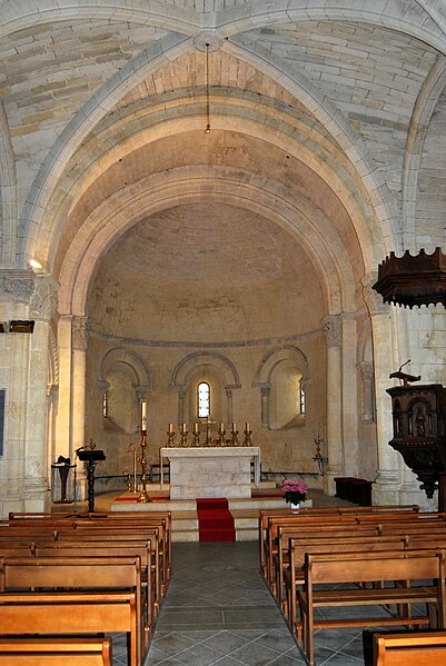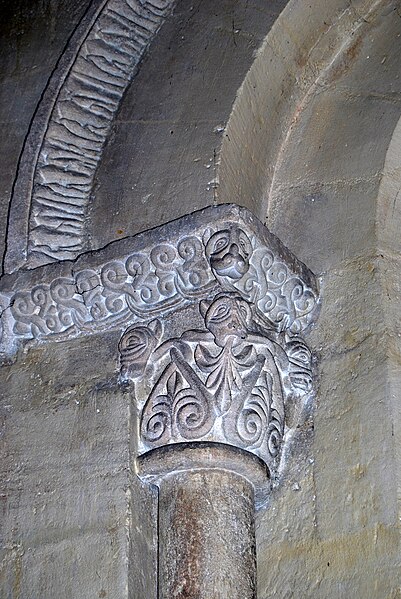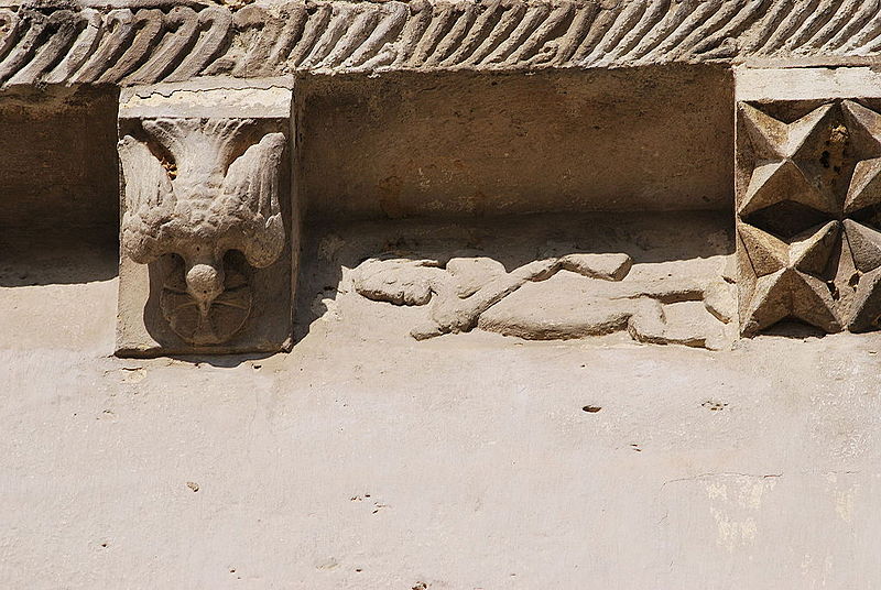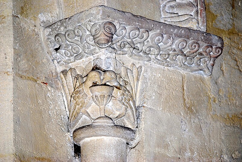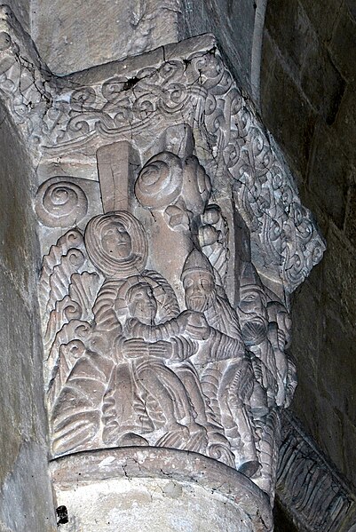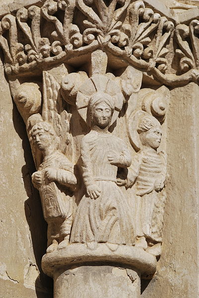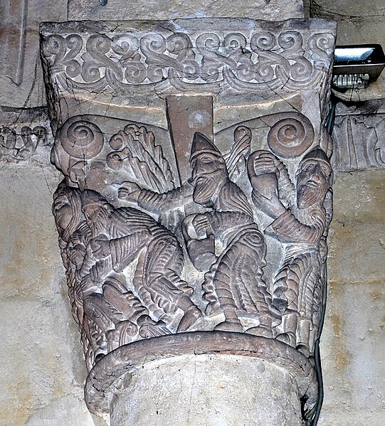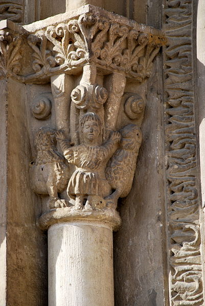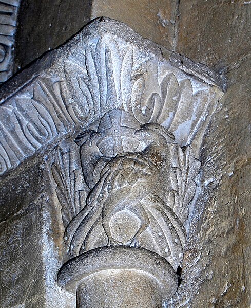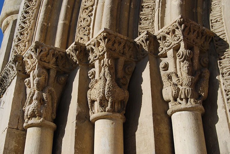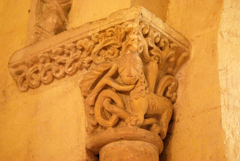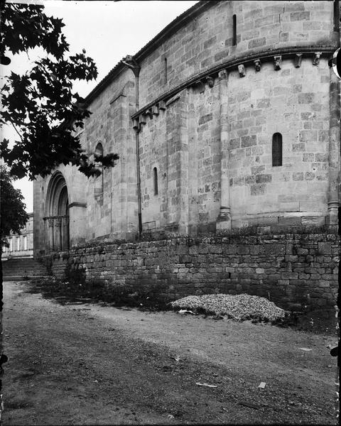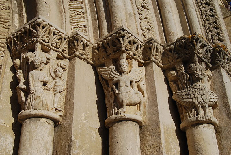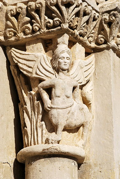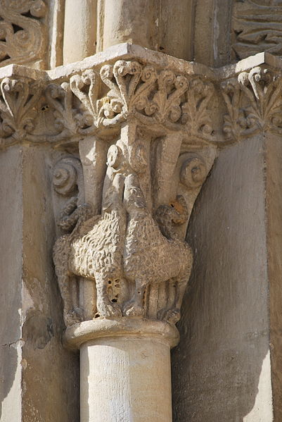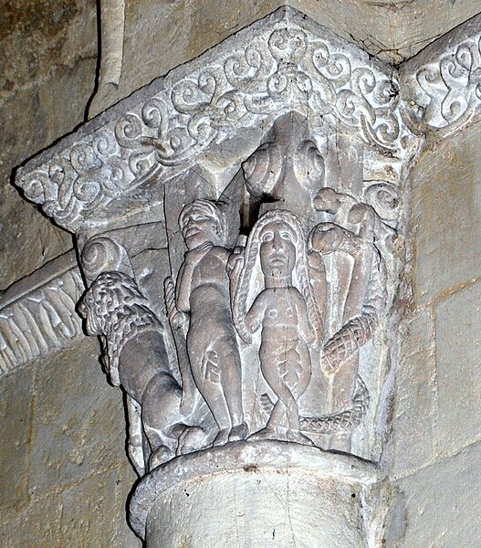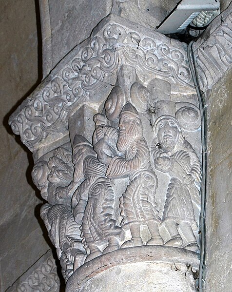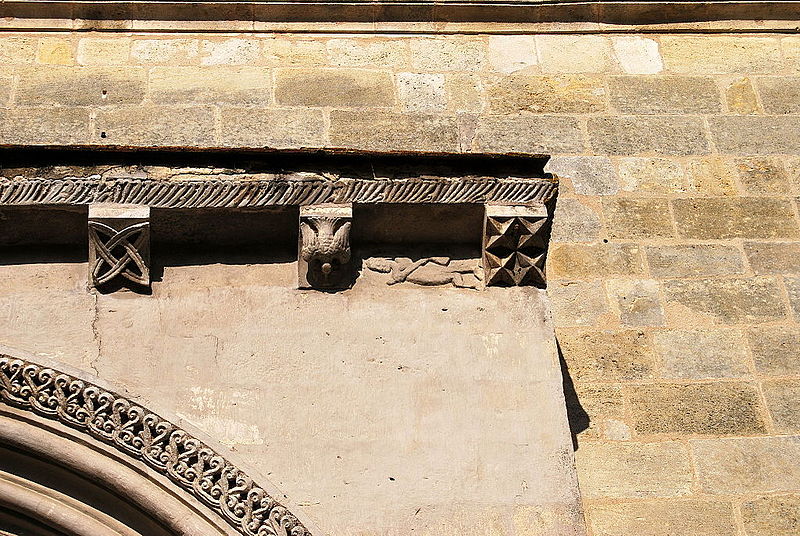 L'église Saint-Romain se situe à Targon (Gironde), sur la place centrale en face de la mairie, à l'intersection des routes départementales D11 et D237. Peut-être d'origine templière, elle a été édifiée en style roman au XIIe siècle et dépendait de l'abbaye de La Sauve-Majeure dès cette époque. À l'origine, l'édifice comprenait une nef unique rectangulaire et une abside en hémicycle voûtée en cul-de-four, avec une porte sur le côté sud. L'église a été fortifiée et agrandie aux XVe siècles : on note l'ajout d'un bas-côté gothique, la construction d'un clocher-tour vers 1623 et l'établissement d'une sacristie vers 1640. La partie basse du clocher est datée du XVIe siècle ; l'étage supérieur, qui porte l'inscription 1673, correspond à une reprise au XVIIe siècle. Le clocher abrite trois cloches, la plus ancienne étant fondue en 1505 ou 1517. Pendant les Guerres de religion, le chevet a été surélevé et aménagé en chambre forte pourvue de meurtrières, et des échauguettes de type « poivrière » aux angles nord-est et sud-ouest datent de la Renaissance. Des campagnes de restauration et de transformation ont eu lieu aux XIXe siècles, notamment en 1859, 1877 et 1878, avec une intervention supplémentaire en 1897 sur certains chapiteaux et fenêtres ; le cimetière et sa croix ont été déplacés au XIXe siècle. L'édifice a été inscrit au titre des monuments historiques par arrêté du 21 décembre 1925. Le clocher fortifié et plusieurs vestiges romans caractérisent encore l'église : chapiteaux historiés du XIIe siècle représentant notamment Adam et Ève, un agneau accolé à une croix et l'Adoration des Mages. Le portail occidental s'ouvre en plein cintre, précédé de piédroits cantonnés de colonnes et de voussures en retrait ; les chapiteaux et les arcs conservent des sculptures romanes, parfois remaniées. Les modillons, les chapiteaux et les colonnes du portail ont été en grande partie refaits au XIXe siècle, mais une métope romane authentique représentant un bûcheron en action a été préservée à l'angle oriental. La voussure porte des personnages et une clef figurant un masque diabolique qui semble résulter d'un ajout postérieur ; deux couples nus encadrent ce démon dans une scène où figurent un homme étendu sous un démon, une femme juchée sur un homme avec une tête entre ses jambes et une grenouille qui tète son sein — représentations interprétées comme allégories de la cupidité, de la colère et de la luxure. Sous la corniche du chevet se trouvent une vingtaine de modillons et quatre corbeilles ; trois chapiteaux présentent une décoration végétale soignée tandis qu'un chapiteau historié nord-est montre deux petits hommes tunicés écoutant un serpent, image de l'influence du Malin. On compte vingt et un modillons, dont quinze d'origine et huit en assez bon état, figurant des sujets variés souvent jugés provocants au XIXe siècle : un homme ithyphallique, un acrobate, un tonneau de vin, une femme exhibant ses organes génitaux, un couple nu, un lièvre et un fou chantant. Les chapiteaux de l'arc triomphal offrent deux grandes compositions complémentaires : au nord, l'Adoration des Mages, œuvre des ateliers de La Sauve-Majeure, montre la Vierge et l'Enfant entourés des mages et, sur une face, Hérode coiffé d'une tour brandissant un glaive ; au sud, la Chute d'Adam et Ève réunit la tentation et l'expulsion, avec le serpent, le fruit, les feuilles de figuier et, sur une autre face, la dureté de la vie symbolisée par un homme armé combattant un lion. Les chapiteaux des fenêtres du presbytérium ont été partiellement conservés ou refaits lors de la restauration de 1897 : la fenêtre méridionale conserve un agneau crucifère dont un côté paraît authentique, et un lion cracheur de rinceaux oppose le Mal au Bien. Les autres chapiteaux présentent des motifs végétaux, des pignes de pin, des oiseaux, des paons picorant une hostie et des colombes buvant à un calice eucharistique, tandis que des masques malfaisants crachent des rinceaux dans la fenêtre nord ; plusieurs éléments résultent des interventions de 1897. L'intérieur conserve un bénitier, une chaire, l'orgue, le sanctuaire et une chapelle nord ; les vitraux sont l'œuvre du peintre-verrier bordelais Gustave Pierre Dagrant. L'église abrite aussi un gisant du XVIe siècle provenant de la commanderie de Montarouch, attribué à un chevalier anonymé et déplacé en raison de l'état de conservation de l'ancienne église templière ; il est aujourd'hui dissimulé par le nouvel orgue.