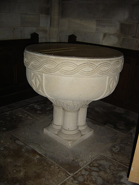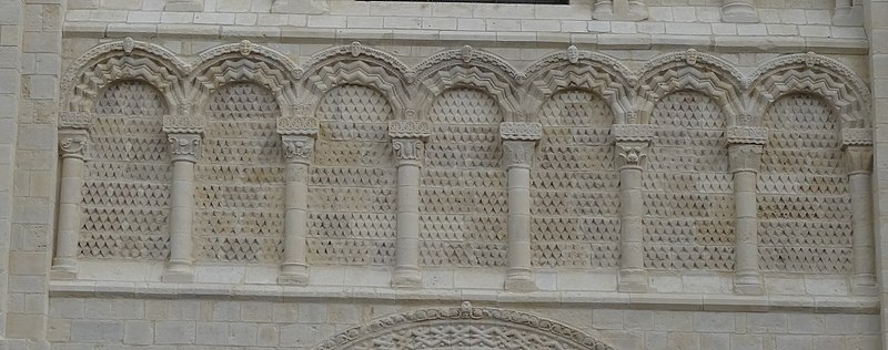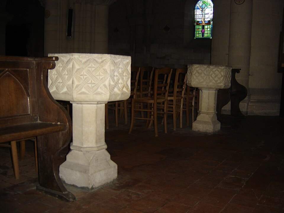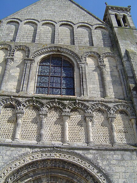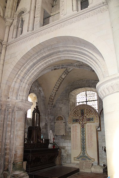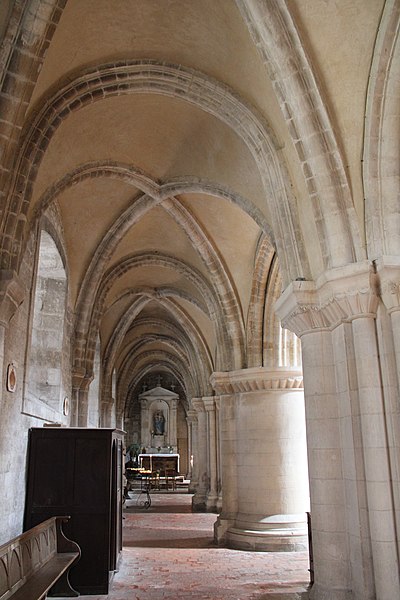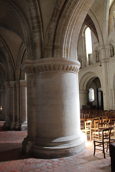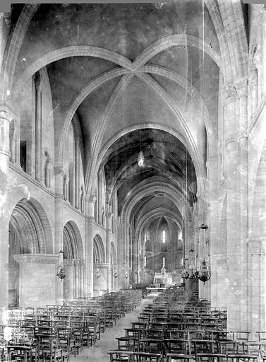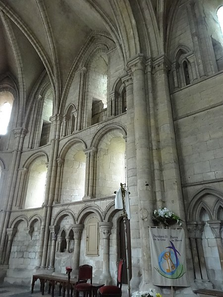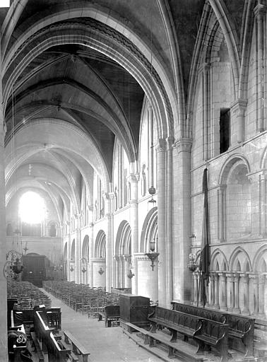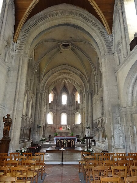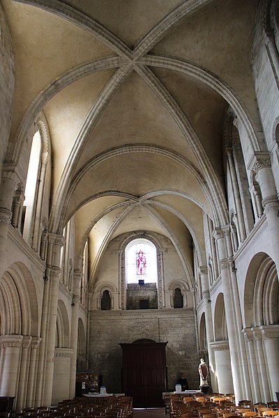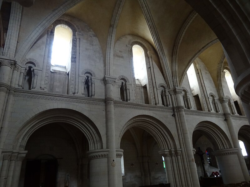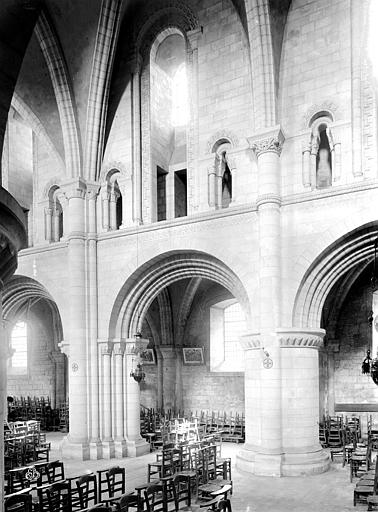L'intérieur a été largement remanié au XIXe siècle dans un style néo-roman, la nef comportant six travées et ne conservant que quelques éléments du XIIe siècle, notamment la partie inférieure des piliers du mur occidental et un petit accès menant au clocheton. L'alternance de piles fortes cruciformes et de piles faibles circulaires, qui reçoivent respectivement ogives, doubleaux et demi-colonnes, structure la nef ; au-dessus des arcades s'ouvrent de hautes fenêtres en plein cintre ornées de frettes crénelées, encadrées par les petites baies romanes qui donnent accès à une coursière de circulation en hauteur. Les voûtes, rétablies au XIXe siècle, comprennent deux voûtes sexpartites et, près du chœur, des fausses voûtes d'ogives en bois ; le décor géométrique de tores, chevrons, bâtons brisés, godrons et cordons perlés a été restauré ou recréé à cette époque.