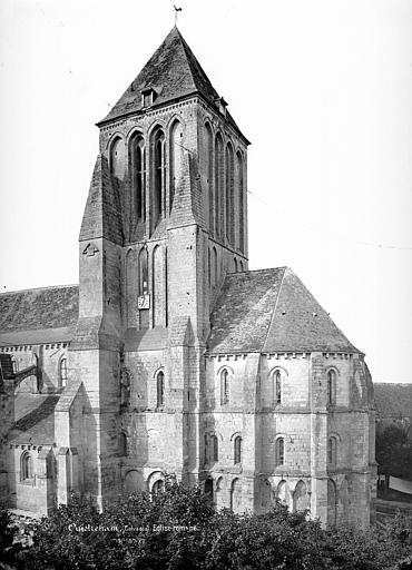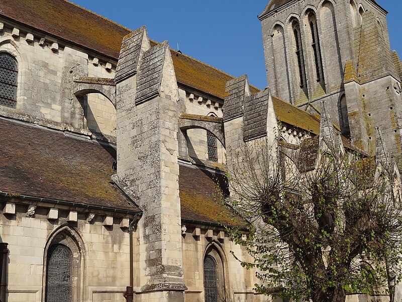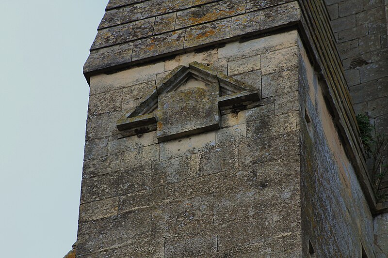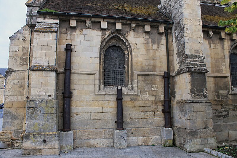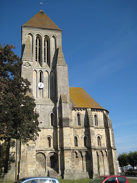 Les murs gouttereaux de la nef sont renforcés d'arcs-boutants ajoutés ultérieurement et seul le mur nord a conservé les arcatures d'origine. La tour, massive et épaulée au sud par deux importants contreforts couronnés d'une flèche de pierre, s'appuie sur deux travées d'avant-chœur aux baies en plein cintre ; les niveaux supérieurs mêlent lancettes et arcatures en arc brisé et le toit est souligné d'une frise de trèfles. Le chevet, légèrement plus étroit que la nef, comporte trois niveaux : un soubassement percé de baies aveugles étroites en arc brisé et deux étages supérieurs percés de fenêtres allongées, seules celles du troisième niveau étant en arc brisé.