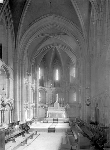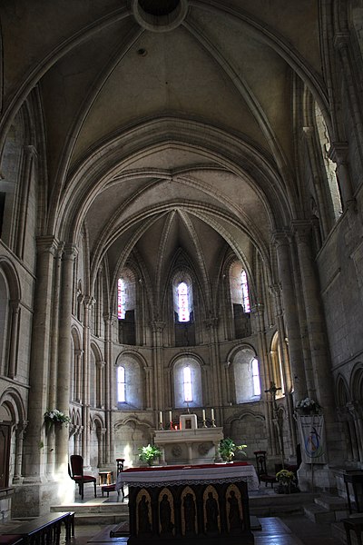 Le chœur, construit entre la fin du XIIe et le début du XIIIe siècle, présente sur ses trois étages un mélange d'arcatures et de baies en plein cintre ou en arc brisé, des chapiteaux à crochets ainsi que des tailloirs et socles ronds annonçant l'émergence du gothique normand. Un cordon mouluré en tore ceint chaque étage et assure la continuité de l'ensemble ; la coursière du deuxième étage prolonge celle de la nef et fait le tour du chœur, accessible par un escalier dissimulé dans un pilier côté sud. L'avant-chœur porte la tour des cloches, dont l'anneau central et les trous visibles autour permettaient autrefois d'actionner la clé de la voûte sexpartite qui couvre les deux travées ; le chœur est voûté en quadripartite et se termine par une abside percée de deux rangées de trois baies au-dessus d'arcs surbaissés trilobés.