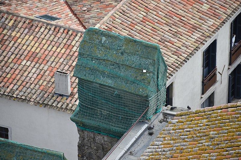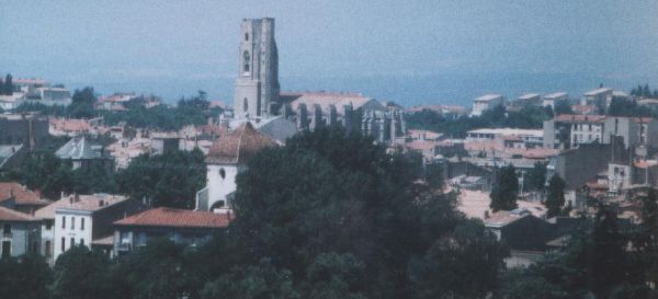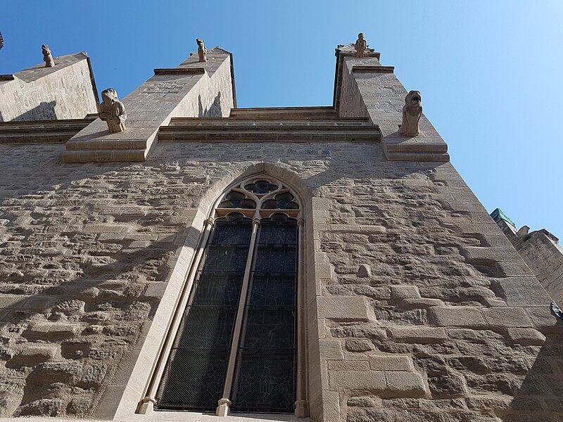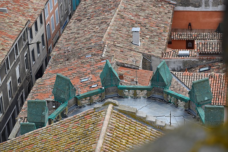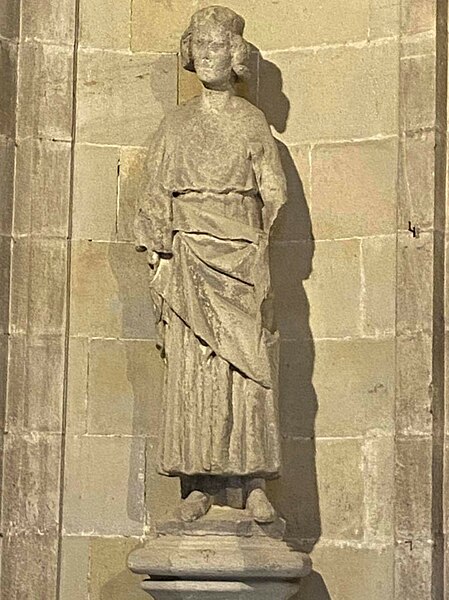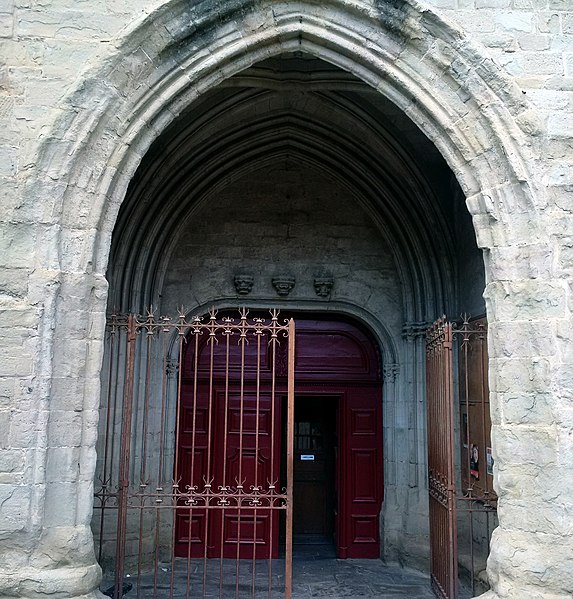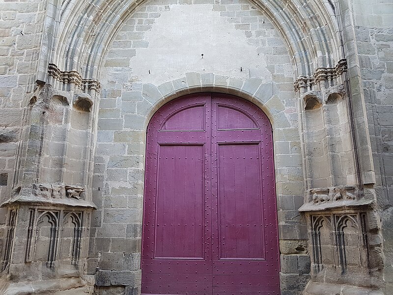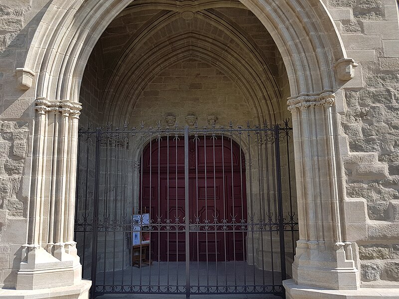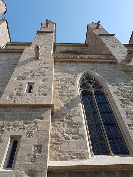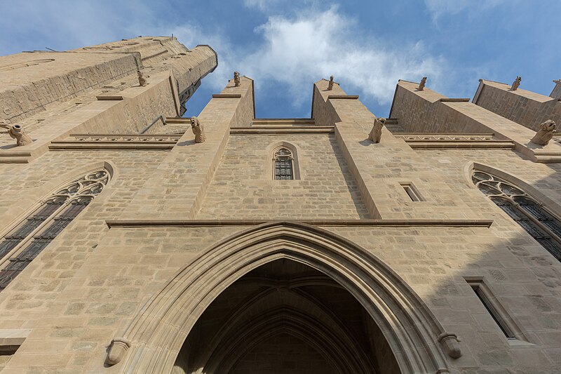 La tour-clocher, élevée à partir des années 1320 puis prolongée au XVe siècle, présente une base carrée transformée en plan octogonal sur ses étages supérieurs et culmine à 54 mètres ; on y accède par un escalier de 232 marches. Cette tour a servi de point de guet et a joué un rôle dans des opérations géodésiques historiques. La façade occidentale et le portail monumental, récemment restaurés, comportaient autrefois quatre statues en pied aujourd'hui déposées dans le narthex et représentant saint Vincent, deux apôtres et saint Louis.