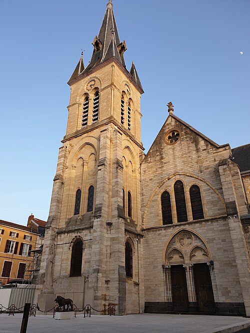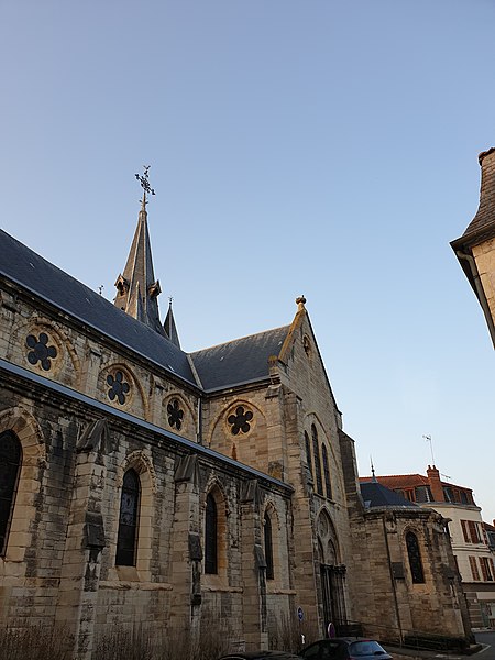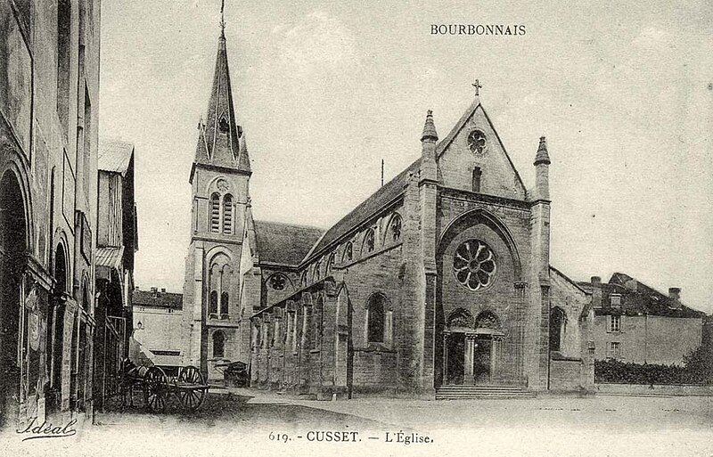 L'église Saint-Saturnin, édifice principal du centre-ville de Cusset (Allier), a été édifiée entre 1857 et 1867 sur l'emplacement d'une ancienne église romane remaniée au cours du gothique. En 1857 la municipalité jugea l'ancienne église délabrée et trop exiguë et confia les plans à l'architecte parisien Jean-Baptiste Lassus, qui s'inspira du gothique du XIIIe siècle ; après son décès, Hugues Batilliat reprit la direction des travaux de 1861 à 1867. Construite en pierre calcaire locale, elle adopte un plan basilical : une nef de six travées, deux bas-côtés, un transept non saillant et un chœur avec déambulatoire et chapelles rayonnantes. Le clocher carré, surmonté d'une flèche, est adossé au transept Ouest ; sa construction a reçu un financement de Napoléon III, qui fréquentait la station thermale voisine et visita Cusset en 1861 ou 1862. L'orientation de l'édifice vers le nord résulte de la densité du tissu urbain au moment de la construction. À l'intérieur, les voûtes d'ogives élevées retombent sur de massives colonnes circulaires ornées de chapiteaux au décor varié, tandis que les culots de retombée des arcs s'inspirent des croquis de Villard de Honnecourt. Les parties hautes de la nef sont percées d'oculus à remplage en rosace et les bas-côtés s'éclairent par des baies en arc brisé. Des tympans sculptés, extérieurs et intérieurs, représentent notamment la bénédiction d'une cloche par saint Saturnin et le roi David jouant de la harpe. Les vitraux, réalisés par Émile Thibaud, offrent une iconographie diversifiée. Le mobilier fixe comprend des éléments néo-gothiques en bois ciré, tels que la chaire, les confessionnaux, le meuble de sacristie et l'escalier suspendu menant à la tribune. La première messe eut lieu le 15 août 1867 et l'église fut consacrée le 16 mai 1868 par l'évêque de Moulins, monseigneur de Dreux-Brézé. L'ensemble de l'édifice, ainsi que ses autels, sa chaire et les autres éléments fixes, a fait l'objet d'une inscription au titre des monuments historiques par arrêté du 26 février 2013.