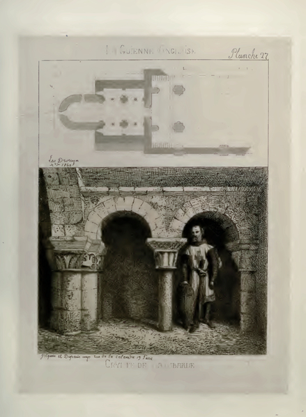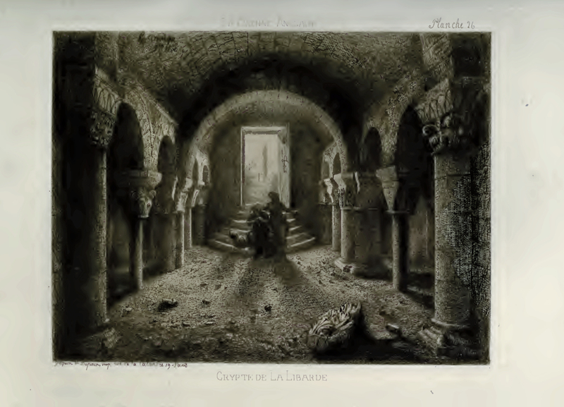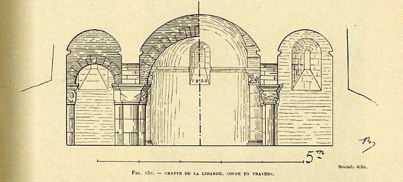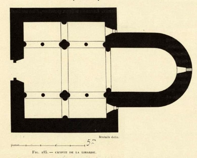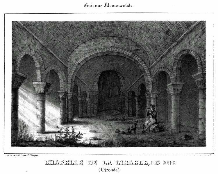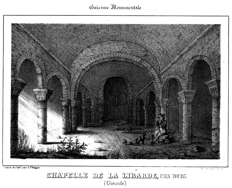 L'église de la Libarde, dédiée à saint Saturnin, se situe dans le lieu-dit La Libarde, à un kilomètre au nord du village de Bourg (Gironde). Autrefois paroisse indépendante jusqu'à la Révolution, elle fait aujourd'hui partie de la commune de Bourg ; il ne subsiste de l'édifice primitif que des fondations et surtout une crypte intacte dont les dernières modifications remontent à la seconde moitié du XIe siècle. La crypte, la totalité des vestiges et l'enclos du cimetière ont été inscrits aux Monuments historiques en 1965. Selon Léo Drouyn et des documents anciens, l'église romane du XIIe siècle comprenait une nef centrale flanquée de bas-côtés et un sanctuaire situé au-dessus de la crypte ; elle aurait été édifiée sur le site d'une villa gallo-romaine, la crypte pouvant être le vestige d'une chapelle carolingienne ou d'un temple antérieur. L'église connut plusieurs événements et transformations : elle fut incendiée avant la fin du XIIe siècle, fit l'objet de remaniements au XVIIe siècle — la nef étant alors séparée du chœur par douze marches — et ses fresques intérieures furent retirées par une ordonnance de l'archevêque en 1669. Au XVIIIe siècle un titre décrit un édifice pourvu de deux ailes et d'une grande voûte centrale soutenue par des colonnes ; la foudre détruisit la façade ouest en 1765, l'église fut pillée après 1789 et rasée en 1823. La crypte, rare en Gironde comme celles de Saint-Seurin à Bordeaux, Saint-Christophe de Baron et Saint-Cyr de Saint-Ciers-d'Abzac, se compose d'une nef et de deux bas-côtés, chacun formé de deux travées voûtées en berceau, et se prolonge vers l'est par une abside semi-circulaire qui contient un sanctuaire élevé d'une marche. L'espace voûté repose sur un dispositif de piliers composés de quatre colonnes accouplées formant un plan en quatre-feuilles, tandis que des colonnes engagées portent les arcs et l'arc triomphal en plein cintre ; l'ensemble est parcouru par de petites fenêtres étroites éclairant l'abside et les extrémités orientales des bas-côtés. De dimensions modestes, la crypte présente une nef longue de 5,40 m (10 m avec l'abside), une largeur totale de 6,25 m, une nef centrale de 2,80 m, une hauteur sous voûte de 3,10 m et des arcs séparateurs mesurant 1,83 m. Les murs et les voûtes portaient à l'origine une décoration polychrome géométrique, aujourd'hui masquée par des badigeons, et l'abside comporte une petite piscine liturgique incrustée dans la maçonnerie. Vingt-trois chapiteaux sculptés ornent la crypte : trois chapiteaux encadrant la porte et ceux de l'arc triomphal sont romans, liés à la restauration du XIIe siècle, tandis que dix-huit chapiteaux de la nef et des bas-côtés sont beaucoup plus anciens, peut‑être carolingiens ou gallo-romains ; leurs décors végétaux et figurés (lions, personnages, oiseaux ou griffons) présentent des affinités avec des ensembles pré-romans des environs. La crypte, tombée dans l'oubli, fut redécouverte au moment du démantèlement de l'église en 1823 et étudiée au XIXe siècle par des savants locaux et des membres de la Société pour la conservation des monuments historiques. Des travaux de sauvegarde ont été entrepris dès le milieu du XIXe siècle, puis régulièrement entretenus, malgré des problèmes d'humidité et d'infiltrations signalés en 1860 ; des études et opérations d'assainissement ont été menées au début du XXIe siècle, avec une première phase programmée en 2007. Les interventions plus récentes, notamment l'installation d'un drainage en 2011 et la restauration intérieure de 2013, ont mis au jour une nécropole du haut Moyen Âge avec sarcophages mérovingiens et plusieurs sépultures, ainsi que des inhumations datées de la première moitié du XVIIe siècle, révélant l'importance archéologique du site.