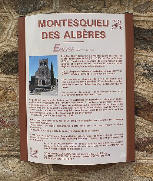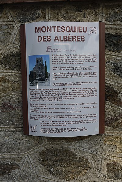 L'église Saint-Saturnin de Montesquieu-des-Albères, paroissiale du village des Pyrénées-Orientales, illustre l'architecture romane du Roussillon au début du XIIe siècle par l'équilibre de ses volumes bas et la sobriété de sa composition, ponctuée de quelques détails ornementaux tels que le décor lombard du chevet et un portail ajouté postérieurement. Elle se situe à la périphérie du village, en contrebas de l'ancien château de Montesquieu. Consacrée le 10 juin 1123 par l'évêque d'Elne, l'édifice a connu des remaniements et des adjonctions au fil des siècles tout en conservant approximativement son aspect d'origine. L'église présente une nef unique orientée à l'est, fermée par une abside en cul-de-four ornée extérieurement d'arcatures lombardes; la couverture se fait par une voûte en berceau plein cintre. La majeure partie de l'édifice date des XIe et XIIe siècles ; les chapelles du transept sont gothiques et datées du XIVe siècle. Le clocher-tour, élevé au XIIIe siècle, repose sur la base d'un ancien clocher-mur du XIe siècle. Le portail principal, en plein cintre sur le côté occidental, est réalisé en marbre blanc de Céret et la porte porte des volutes en fer forgé d'époque romane. La documentation iconographique et mobilière mentionne notamment des vues du portail et de la face sud ainsi que des plaques et monuments funéraires, parmi lesquels la plaque de Pierre Bergoïoni (XIIIe siècle), celles d'Arnaud Guillaume de Montesquieu (1324-1374) et de sa mère (décédée en 1324), et la plaque et le monument funéraire de Guillaume Joer (décédé en 1298).