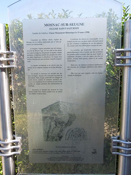 L'église Saint-Saturnin, église catholique située à Mosnac en Charente-Maritime, est un édifice essentiellement roman. L'abside constitue l'élément le plus richement sculpté, avec des métopes ornées de palmettes et de rinceaux, des modillons et une arcature. La façade se distingue par un rythme d'arcatures caractéristique du style saintongeais. À l'intérieur, le chœur et la travée sous le clocher présentent des chapiteaux sculptés de griffons et de lions, et le mur sud de la nef conserve des colonnes aux chapiteaux à feuillages en crochets, témoignant d'une belle facture romane. À la fin du Moyen Âge, une chapelle nord de trois travées voûtées d'ogives a été ajoutée ; son mur oriental est décoré de peintures dédiées à la Vierge, au-dessus d'un autel néo-gothique. C'est sans doute lors de cet agrandissement que le clocher a été surélevé et fortifié. L'édifice est classé au titre des monuments historiques en 1990.