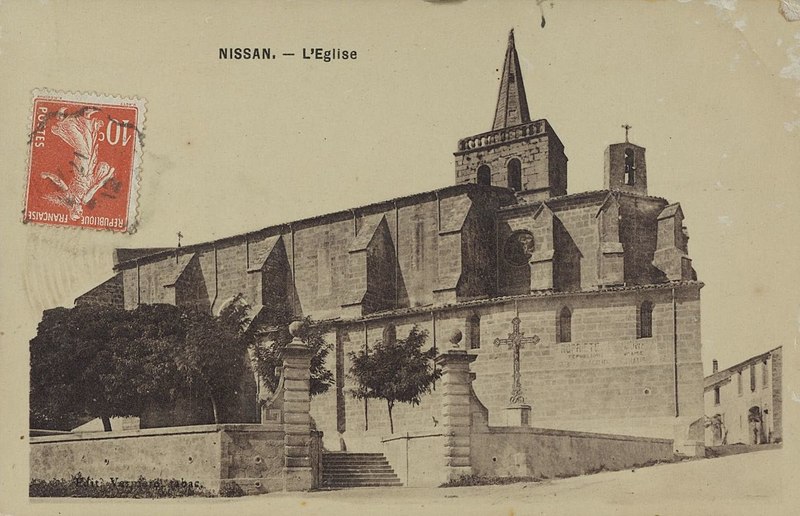 L'église Saint-Saturnin, église catholique située à Nissan-lez-Enserune (Hérault, Occitanie), est mentionnée dès 1099 dans une bulle du pape Urbain II parmi les bénéfices relevant de l'abbaye bénédictine de Psalmodi ; la paroisse dépendait du diocèse de Narbonne. L'étude architecturale attribue l'essentiel du gros œuvre à une campagne du XIVe siècle, qui comprend le chevet polygonal — incluant l'ancienne sacristie nord — la nef, le portail sud et, à l'extérieur, les bâtiments du prieuré adossés au mur du fond devenu l'actuel baptistère. L'épaisseur notable des murs nord et ouest a d'abord été interprétée comme la réutilisation des assises de l'édifice roman primitif ; le décapage intérieur n'ayant pas confirmé ce point, cette épaisseur peut aussi s'expliquer par des considérations défensives ou par la nature et la pente du terrain. Le chevet a conservé sa voûte gothique primitive, tandis qu'un arc formeret au fond constitue le seul témoin de la voûte originelle de la nef, détruite à une époque inconnue et remplacée par un plafonnage dont subsistent les trous de boulin des charpentes. Des voûtes d'arêtes en brique ont été établies en 1852. Le clocher, importante tour carrée surmontée d'une flèche pyramidale en pierre, remonte au XVIIe siècle ; la disposition de l'arcade de la nef et des assises des deux contreforts laisse penser qu'une chapelle latérale, peut‑être pourvue d'un clocher primitif, a précédé sa construction. La première chapelle sud, dans la dernière travée, a été aménagée en 1643, et les chapelles latérales voûtées en brique, la sacristie sud, la voûte du porche et l'ouverture du mur du fond datent des environs de 1850. L'ancien prieuré se trouvait à environ deux mètres au-dessous du niveau de la nef ; le bâtiment prolonge vers l'ouest l'axe de l'église et ses murs reposent sur des piliers qui, au nord et au sud, portent trois grandes arcades en arc brisé. À la hauteur du seuil des portes, des traces d'embouts et de chevrons le long de la façade indiquent la présence d'un plancher de galerie extérieure, qui pourrait correspondre à l'étage supérieur d'un cloître installé dans la cour du presbytère. Les peintures murales intérieures paraissent remonter au XIVe siècle. Le tombeau des prieurs est placé dans le chœur, au nord, sous une pierre de dallage gravée d'une croix, et quelques vestiges du prieuré restent visibles dans la cour du presbytère et à l'ouest de l'édifice. Grâce au chanoine Joseph Giry, l'église conserve plusieurs œuvres d'art : les fonts baptismaux, réutilisés dans une reconstitution de baptistère à l'ouest, une table d'autel wisigothique et une table d'autel carolingienne à lobes, de tradition narbonnaise et catalane. Sur le mur sud‑est du transept subsiste une fresque du Couronnement de la Vierge accompagnée d'anges musiciens, attribuée au XIVe siècle, et la voûte précédant cette chapelle porte les traces, partiellement effacées, des symboles des quatre évangélistes. Les grandes orgues, construites en 1834 par Prosper‑Antoine Moitessier pour la chapelle des Visitandines de Montpellier, ont été transférées à Nissan, détériorées et partiellement complétées en 1965 ; classées monument historique depuis 1984, elles conservent un double buffet — grand corps et positif dorsal — réalisé dans des tons acajou et or, dont la structure reste classique mais dont la décoration mêle éléments d'inspiration Empire, Louis‑Philippe et déjà néo‑gothique. L'église Saint-Saturnin est protégée au titre des monuments historiques par un classement du 16 février 1965 et une inscription du 23 novembre 1982.