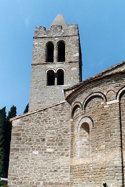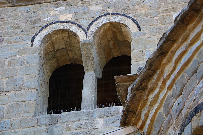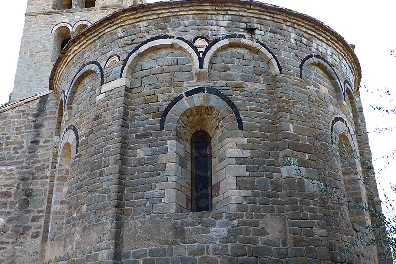 Le clocher, partiellement roman, s'élève sur trois étages au-dessus du rez-de-chaussée ; le troisième niveau diffère des deux premiers et confère à l'ensemble une silhouette évoquant le XIVe siècle. L'avant-dernier étage est percé de baies géminées en plein cintre, également mises en valeur par un cordon de basalte noir, tandis que le dernier étage présente des baies géminées ogivales et un couronnement de créneaux. À l'intérieur, l'église a aussi servi de lieu d'enregistrement musical : le groupe du musicien Christian Salès (groupe Oc) y a fait ses débuts, Salès notant en 1998 l'acoustique particulière et l'atmosphère singulière du lieu.