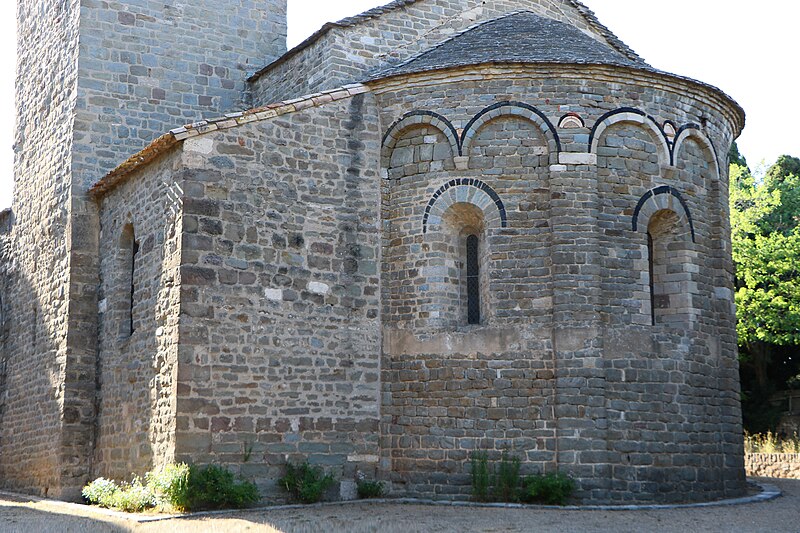 Le chevet présente un remarquable décor roman lombard : une abside unique, couverte d'ardoises, percée de trois fenêtres à simple ébrasement et ornée de bandes lombardes composées de lésènes et d'arcatures. Les arcs des fenêtres et les arcatures sont soulignés par un cordon de basalte noir ; par endroits, le basalte a été remplacé par de la brique rouge. Au-dessus de la porte basse de la nef, une croix en basalte noir, initialement dessinant une croix grecque et dont les rainures ont été rebouchées au mortier pour prendre l'aspect d'une croix pattée, pourrait renvoyer à l'implantation des Hospitaliers à Pouzols.