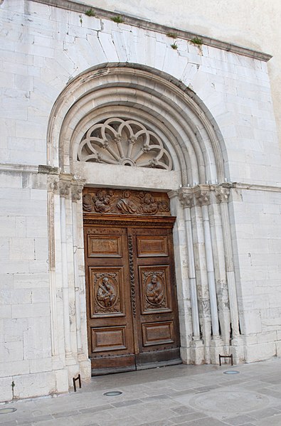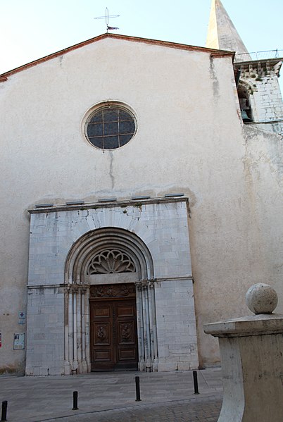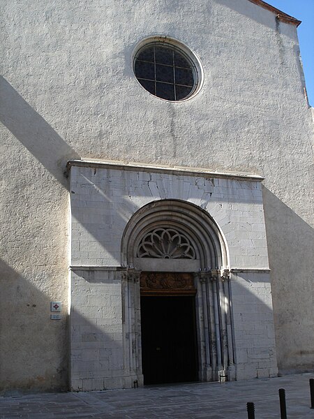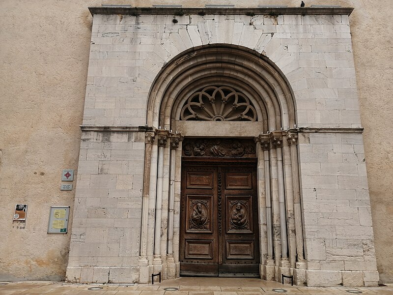 Le portail, d'inspiration romane, a fait l'objet d'une restauration au XIXe siècle. Les deux vantaux en bois, datés de la fin du XVIIe siècle, portent chacun un médaillon ovale : l'un représente saint Pierre tenant la clé, l'autre saint Paul portant l'épée, et le tympan montre le Christ entre deux anges.
