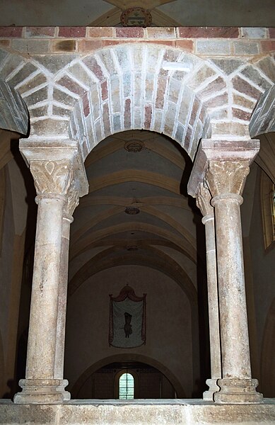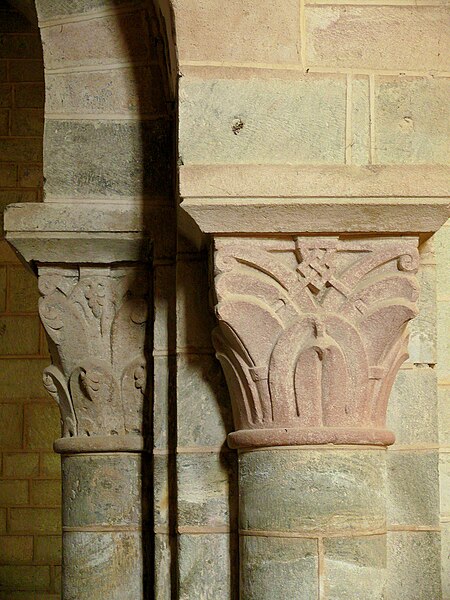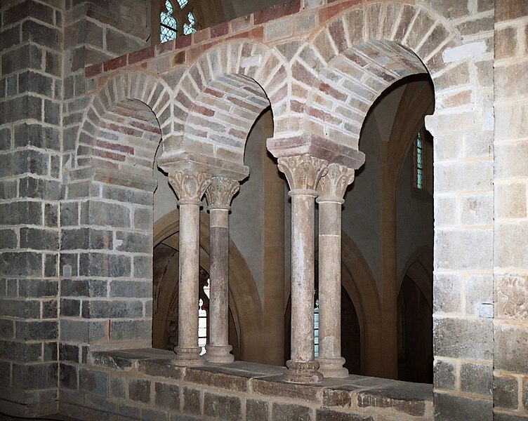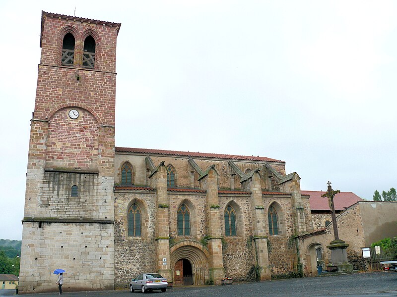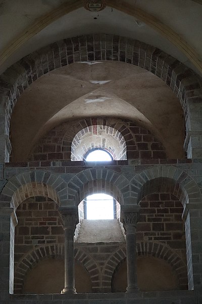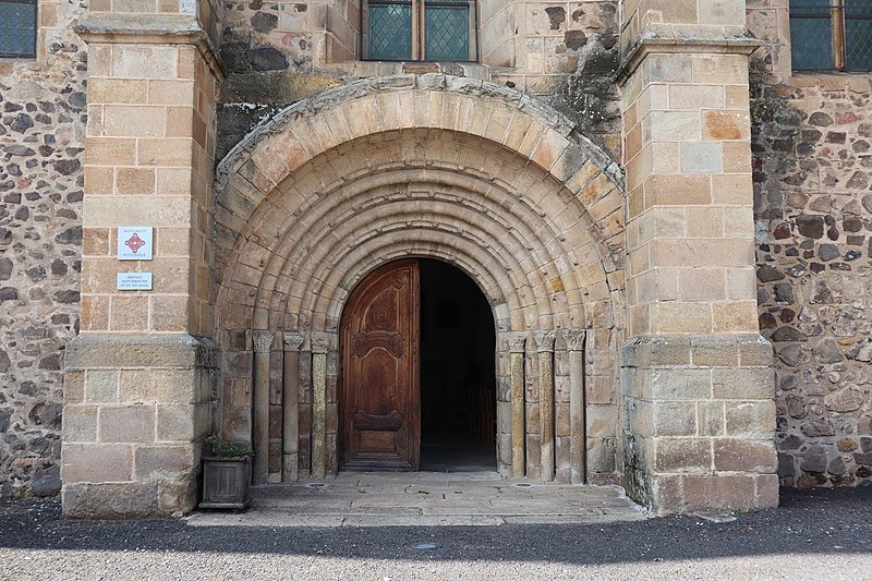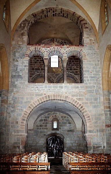 À l'intérieur, d'importantes campagnes de restauration à partir du XIIe siècle ont laissé un narthex occidental avec tribune analogue à celles des grandes églises d'Auvergne : il s'ouvre sur la nef par trois arcades en plein cintre et colonnettes géminées, comprend trois vaisseaux et comporte des niches cintrées dans le mur occidental de la tribune. On accède à la tribune par deux escaliers, l'un à vis au nord et l'autre, au sud, constitué de deux gradins se coupant à angle droit et voûté en berceau ; les chambres des cloches furent voûtées d'ogives à la fin du XIVe siècle. La nef, reconstruite au XVIe siècle au-dessus des murs latéraux romans, reçoit des fenêtres gothiques et des voûtes ogivales appuyées sur les murs romans. Le chœur présente un plan simple — une travée rectangulaire suivie d'une travée carrée — type rencontré dans des édifices des VIIe‑IXe siècles ; extérieur et appareil de moellons mêlés de pierres de taille montrent des réfections et enduits modernes qui compliquent l'analyse chronologique interne. À l'entrée du chœur, sous l'arc triomphal, sont fichées deux colonnes en marbre cipolin avec chapiteaux corinthiens d'inspiration antique ; ces éléments ont été interprétés comme remontant à l'époque mérovingienne, mais certains auteurs attribuent leur mise en place au XVe siècle. La charpente du chœur a été jugée, lors d'une étude, postérieure à la seconde moitié du XIIIe siècle.