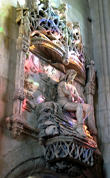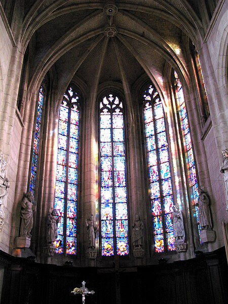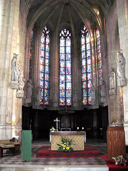 Construite en pierre, l'église présente un style gothique flamboyant et adopte un plan basilical traditionnel avec nef, transept et chœur. La nef, élancée, n'est pas éclairée par des verrières hautes mais par les baies des bas‑côtés. Le chœur et les bas‑côtés sont ornés de vitraux de style Art déco, conçus entre les deux guerres par le maître‑verrier Jacques Gruber : dix‑huit grandes verrières évoquent le Saint‑Sépulcre, traitant dans le chœur de l'histoire du peuple hébreu et de la Passion du Christ, et dans le transept et les bas‑côtés de l'histoire de la Vraie Croix et des croisades. Dans le chœur, des statues des apôtres reposent sur des consoles sculptées représentant notamment deux démons — peut‑être en rapport avec la légende de saint Jacques le Majeur et d'Hermogène — ainsi que des scènes ou attributs comme Jésus et les apôtres (console de saint Jean l'Évangéliste), l'arrestation, les clés de saint Pierre, Jésus chez Marthe et Marie de Béthanie, un martyre d'apôtre et des chrétiens martyrisés; les boiseries du chœur datent du XVIIIe siècle.