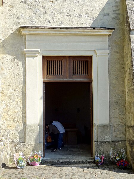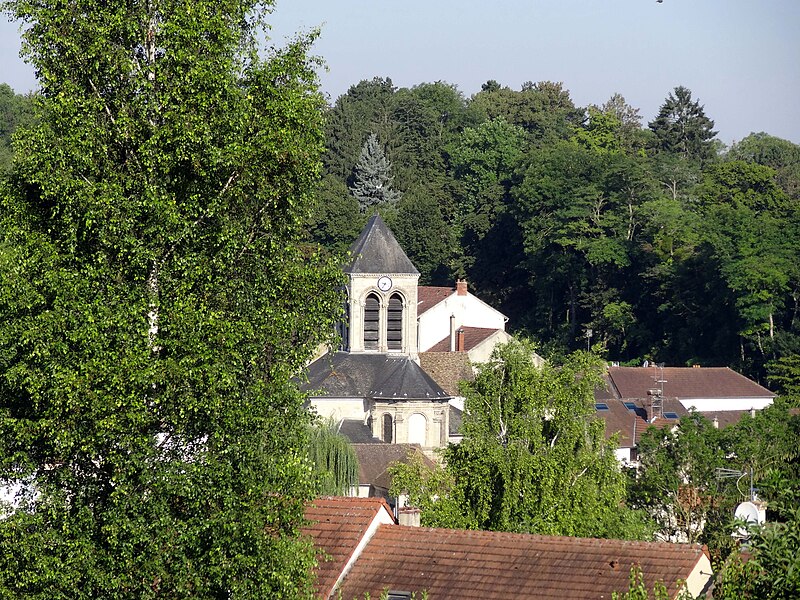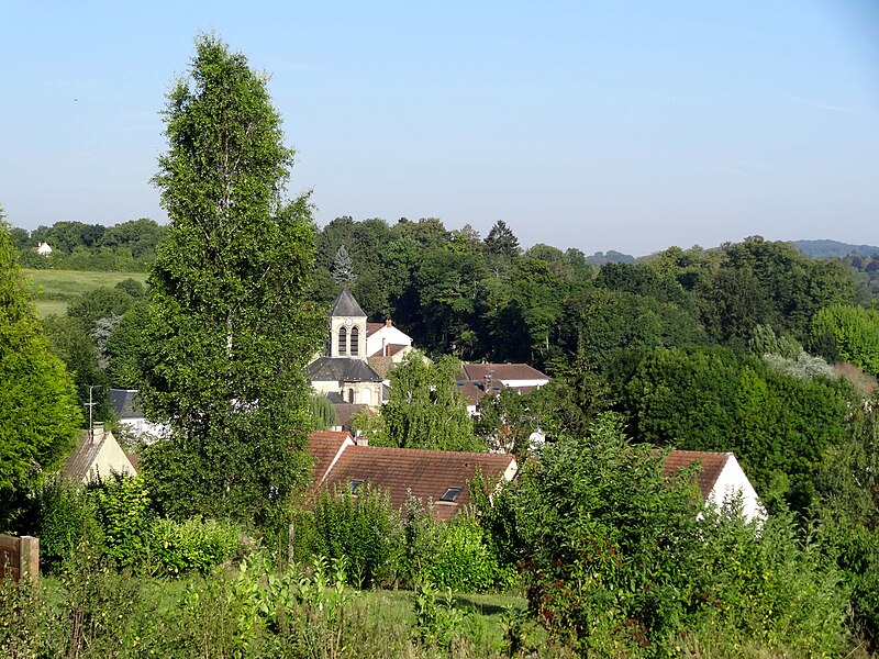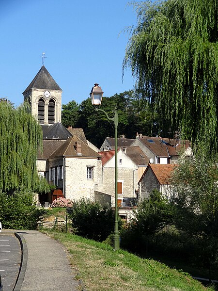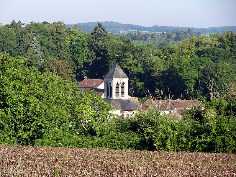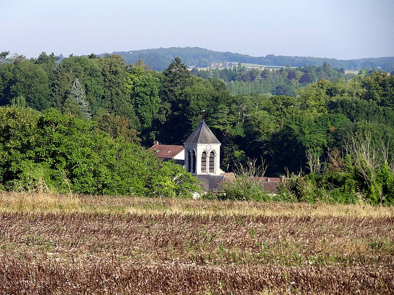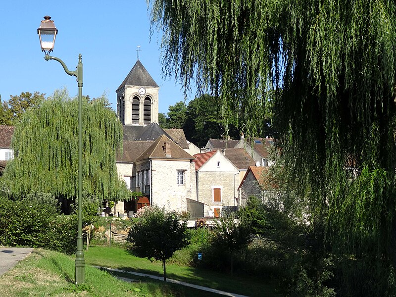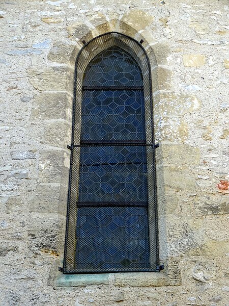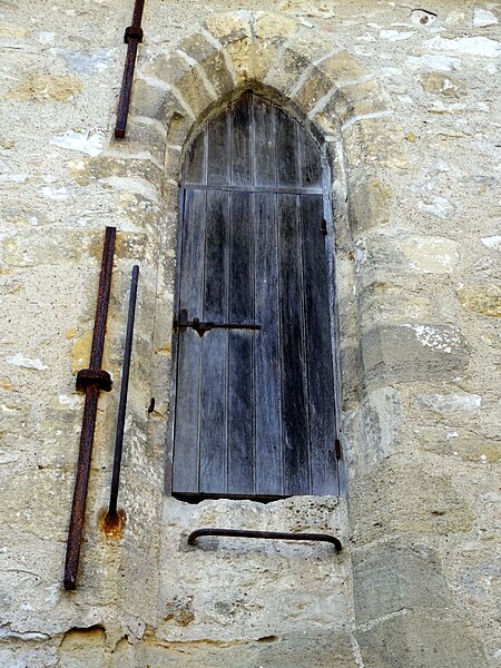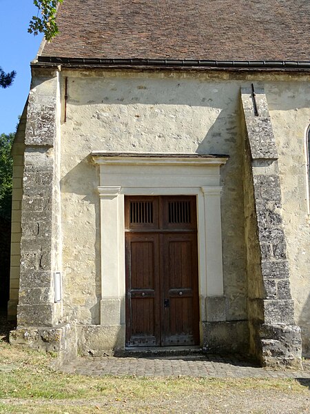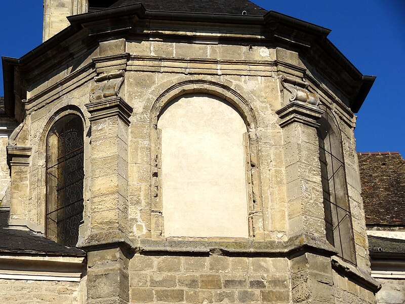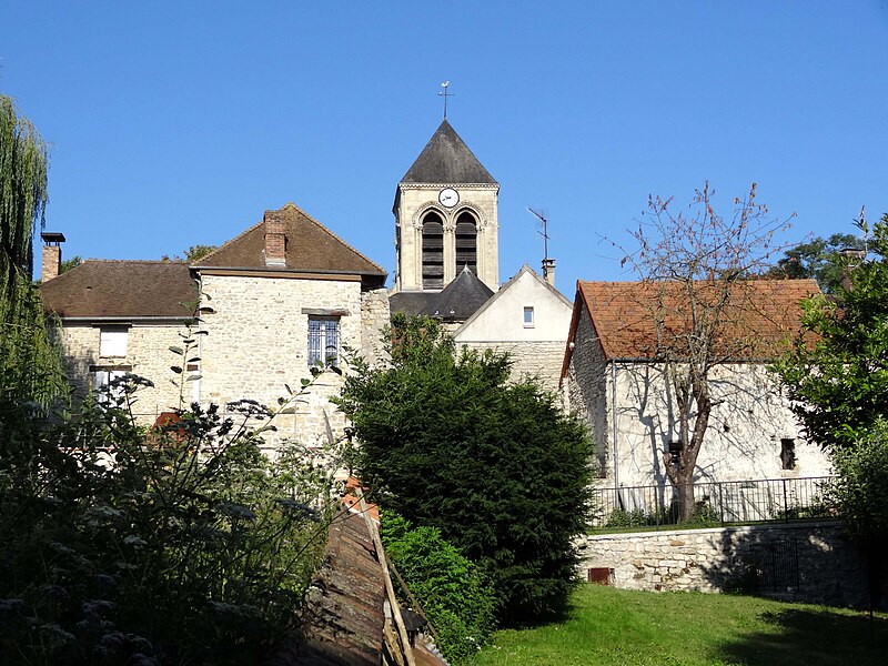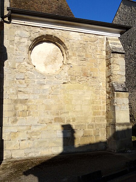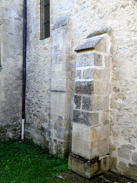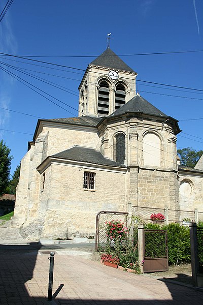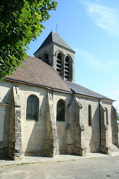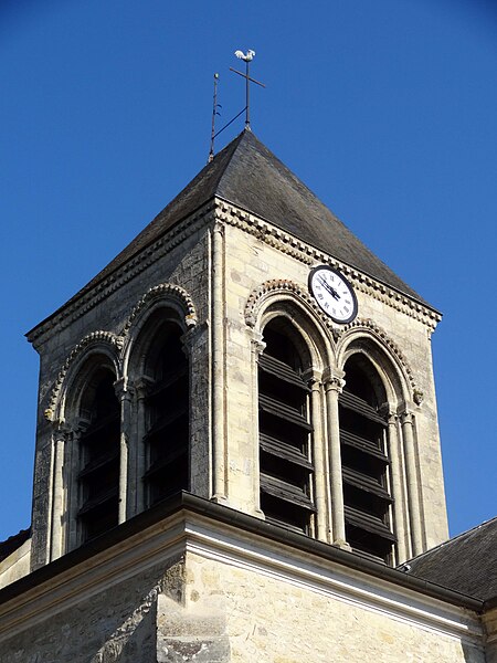 À l’extérieur, le portail du XVIIIe siècle, sobre et traité en stuc avec pilastres doriques, et les fenêtres en plein cintre du collatéral marquent des interventions postérieures ; des contreforts de différentes époques jalonnent les murs, tandis que l’abside est épaulée par des contreforts et ornée d’un entablement non sculpté et d’un décor mouluré aujourd’hui usé. Le clocher, élégant et comparé à certains modèles du Vexin, conserve des colonnettes d’angle à bases et chapiteaux à crochets, des baies géminées en arc brisé sous archivoltes toriques et une corniche décorée de billettes et de motifs en losange ; la couverture actuelle en toit à la hache ne correspond vraisemblablement pas à la forme de couverture d’origine.