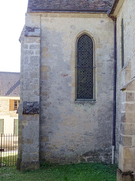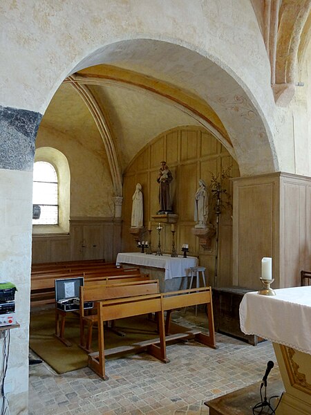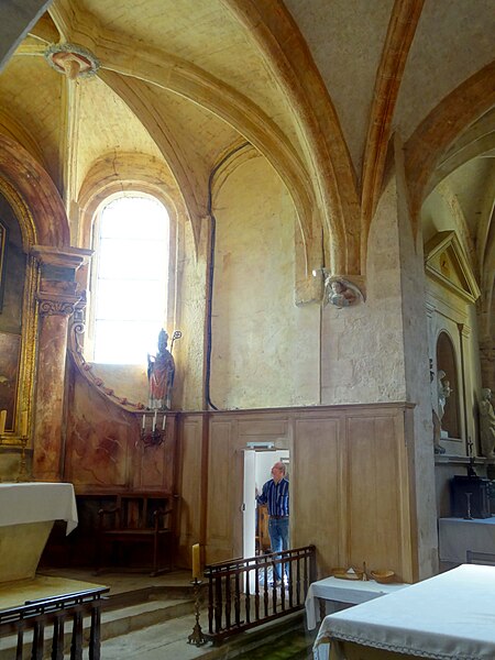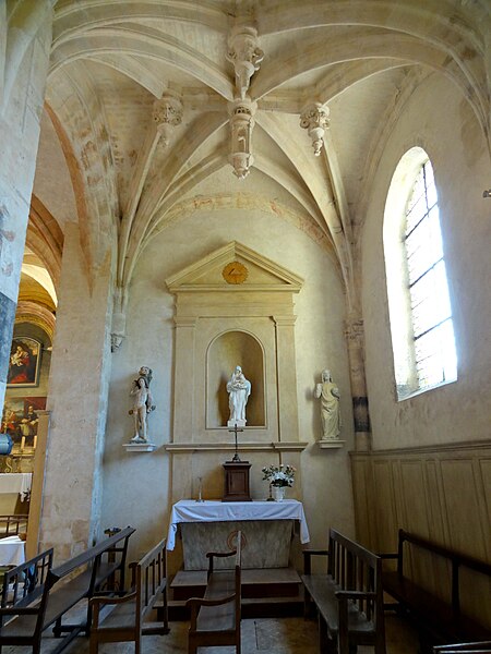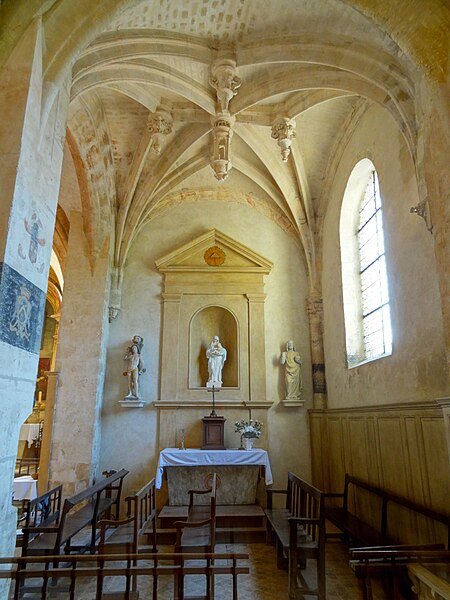 La chapelle latérale la plus basse comporte des arcades en plein cintre et une oculus oriental aujourd’hui condamné ; sa voûte, de profil proche de celle du transept, manque de formerets et retombe sur de simples tailloirs et chapiteaux. L’autre chapelle, voûtée à la même hauteur que la nef, se distingue par sa voûte à liernes et tiercerons, typique d’un flamboyant tardif, et par des clés pendantes d’influence renaissante.