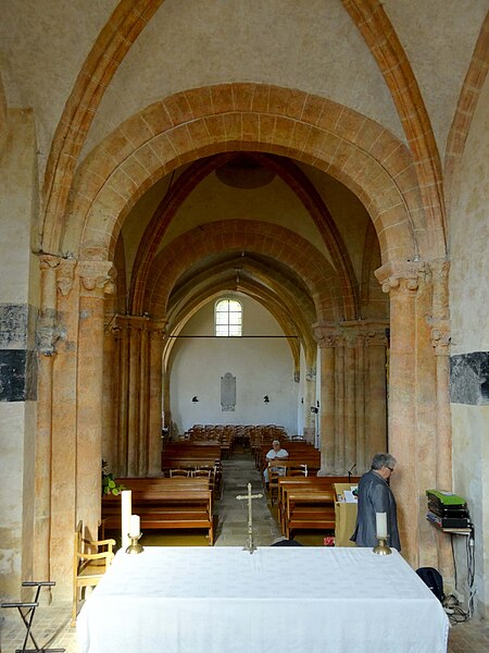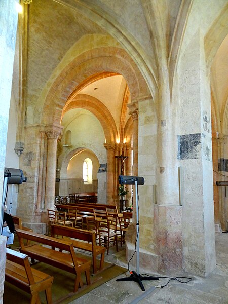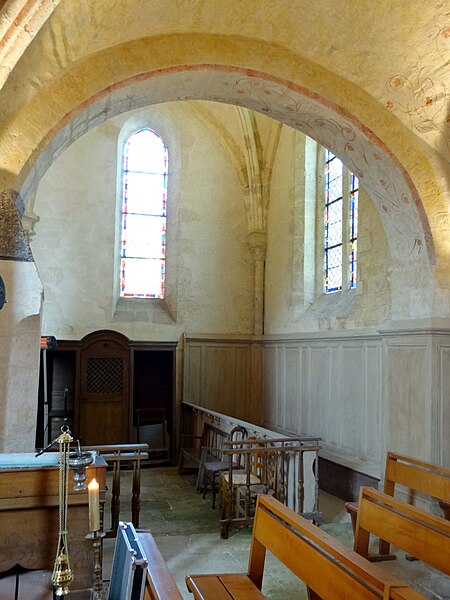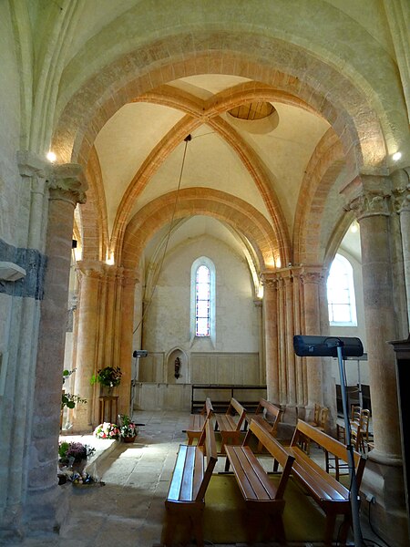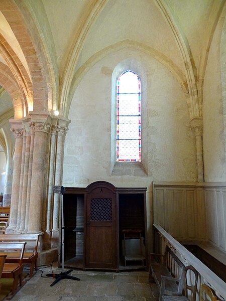 La croisée du transept est de plan carré et délimitée par quatre doubleaux en plein cintre à double rouleau, résolument romans, tandis que les chapiteaux sculptés de crochets et de feuilles polylobées appartiennent au registre gothique de la fin du XIIe siècle. Les ogives, dont le profil est issu de la transition romane‑gothique, retombent sur des tailloirs et des colonnettes logées dans les angles ; quelques lancettes d’origine et une fenêtre à remplage postérieure témoignent de l’évolution du transept entre première période gothique et style rayonnant. Des boiseries peintes et une polychromie reconstituée soulignent encore l’architecture du carré du transept.