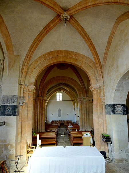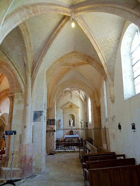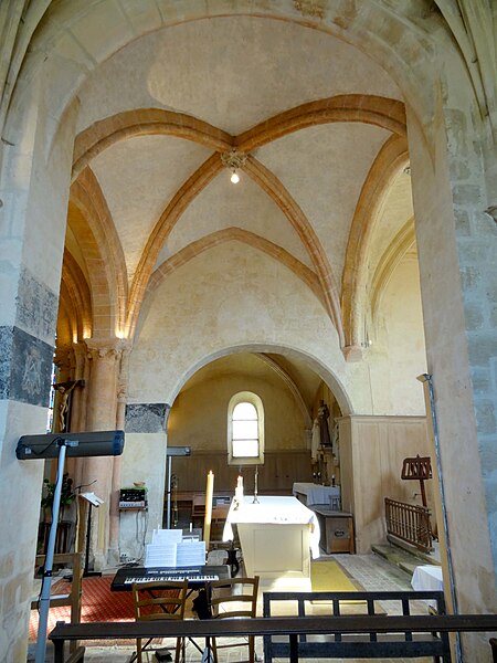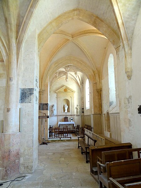 L’intérieur montre une nef et un collatéral formant un vaste espace unifié, résultat de la reconstruction flamboyante visant à agrandir la nef tout en conservant les murs extérieurs anciens. Trois doubleaux longitudinaux séparent les deux vaisseaux et reposent sur deux piliers libres ondulés à quatre renflements ; ces supports, dépourvus de bases et posés sur des socles, sont typiques des réalisations flamboyantes du Vexin. Les profils des nervures, identiques pour doubleaux et ogives, présentent des filets et moulures caractéristiques de la région, et les clés de voûte du collatéral portent des motifs floraux sculptés semblant l’œuvre d’un même atelier.