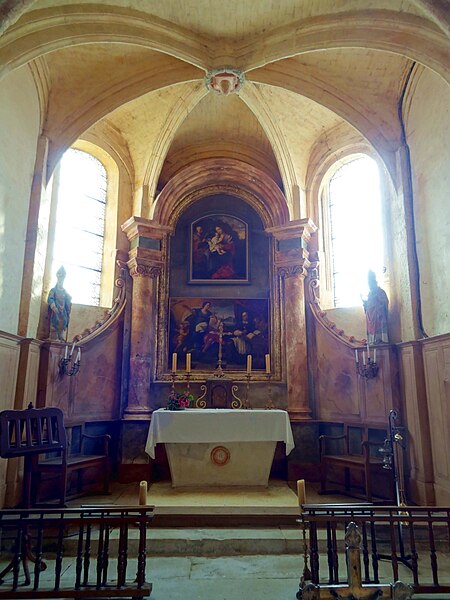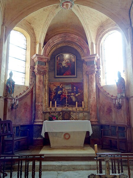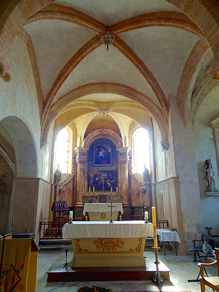 Le chœur primitif se composait vraisemblablement de la seule travée carrée, largement remaniée à la fin du flamboyant, puis prolongée par l’abside à pans coupés de facture renaissante. L’abside, globalement d’inspiration Renaissance, conserve néanmoins des ogives flamboyantes ; sa clé de voûte est ornée d’une guirlande autour d’un carré surmonté d’une pomme de pin stylisée, et la baie axiale est obturée par le retable du maître‑autel. Le retable de pierre, de style baroque, présente un corps central à colonnes ioniques et un grand cadre de bois doré dont le tableau a disparu.