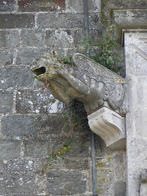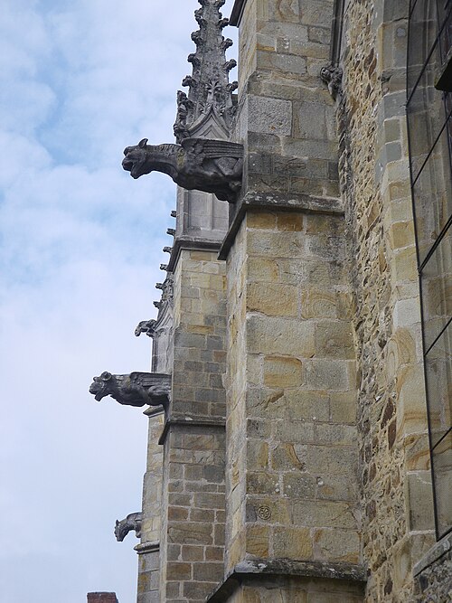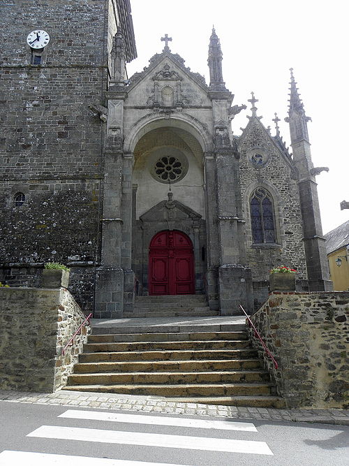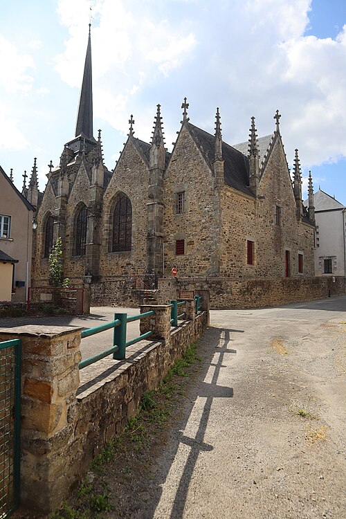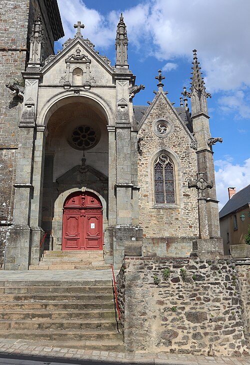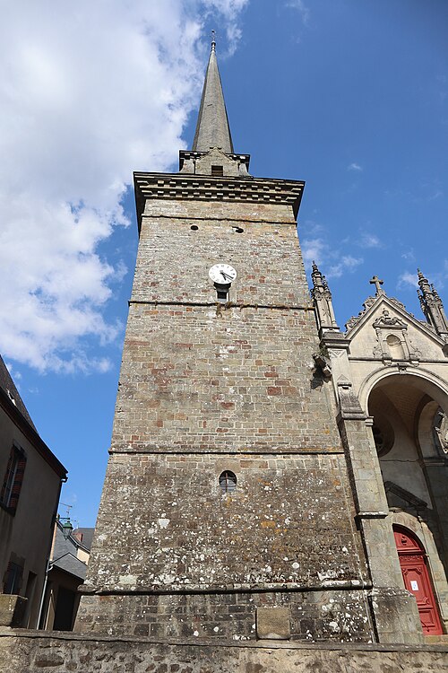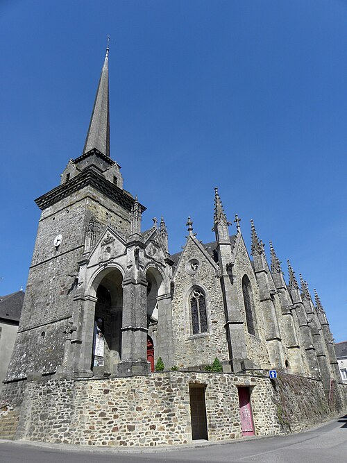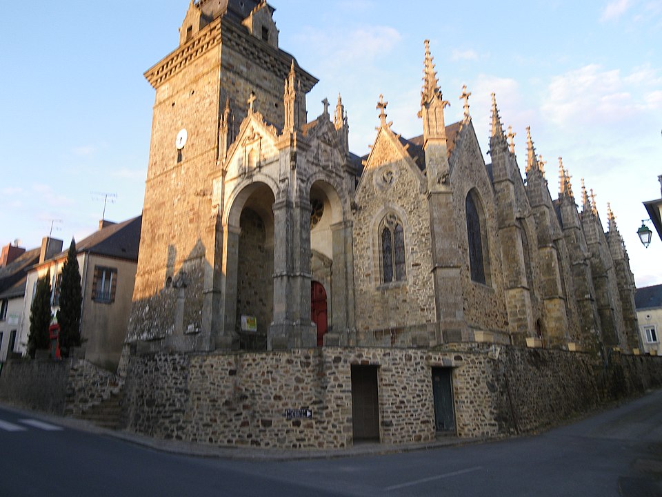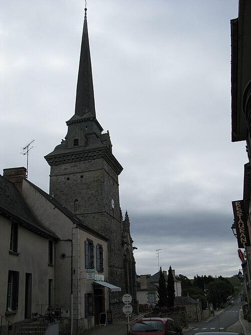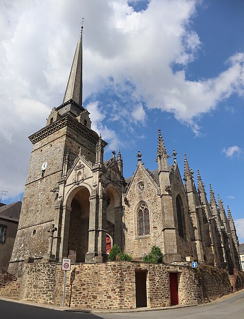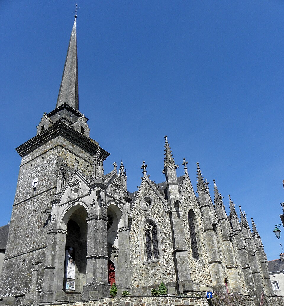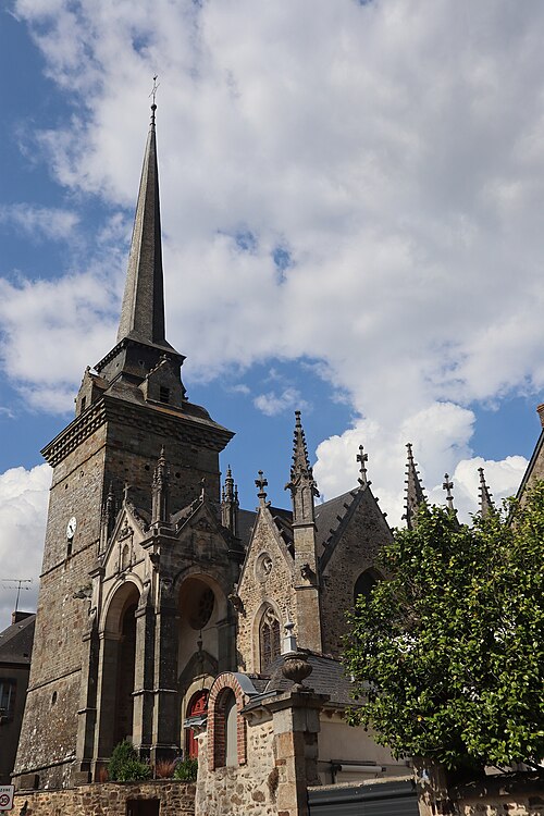 L'église compte un ensemble homogène de onze vitraux, dont les grandes fenêtres ogivales des collatéraux, réalisées par le maître‑verrier Joseph Chauvel en 1863, 1865 et 1866, présentent sur fond de quadrilobes ou de rosaces une niche à dais de style gothique fleuri abritant une figure de saint, chaque vitrail étant signé, daté et portant le nom du bienheureux sur un socle doré. Au nord, d'est en ouest, ces vitraux figurent l'Immaculée Conception, sainte Anne, saint François d'Assise et saint Sulpice ; au sud, du levant au couchant, ils représentent saint Pierre, saint Joseph, saint Jean‑Baptiste et saint Louis. La dernière baie du collatéral méridional est composite : en 1874 Édouard Rathuis, de l'atelier du Carmel du Mans, inséra dans une verrière mécanique de Chauvel une figure de saint Thomas, patron de l'abbé Certenais, recteur de 1843 à 1882. La façade ouest abrite deux autres baies liées à la restauration du grand porche en 1882 : une rosace à huit pétales de facture mécanique éclairant la nef et un vitrail‑tableau en deux lancettes surmontées de mouchettes, réalisé par les ateliers Lecomte et Collin de Rennes, représentant le Baptême de Clovis.
