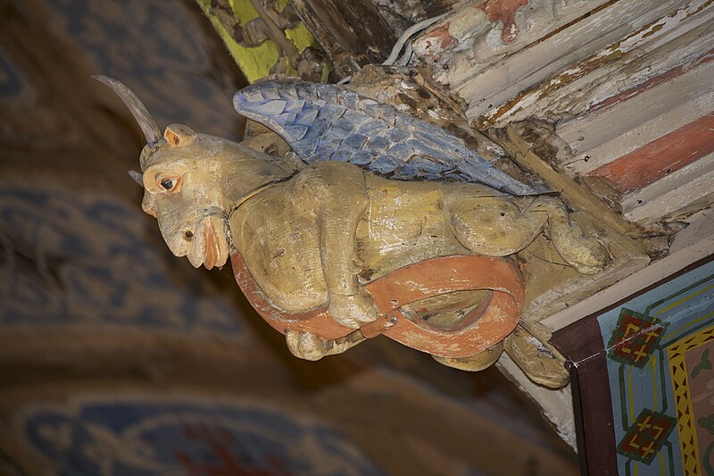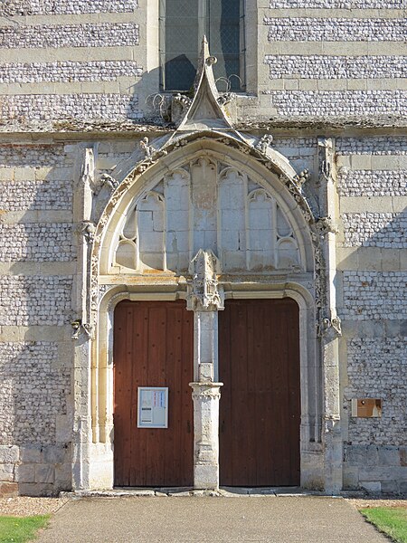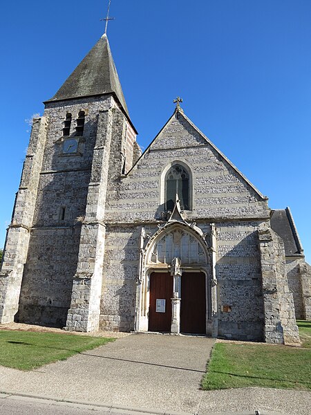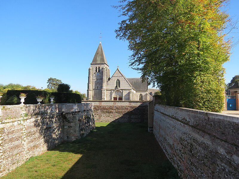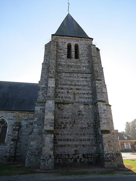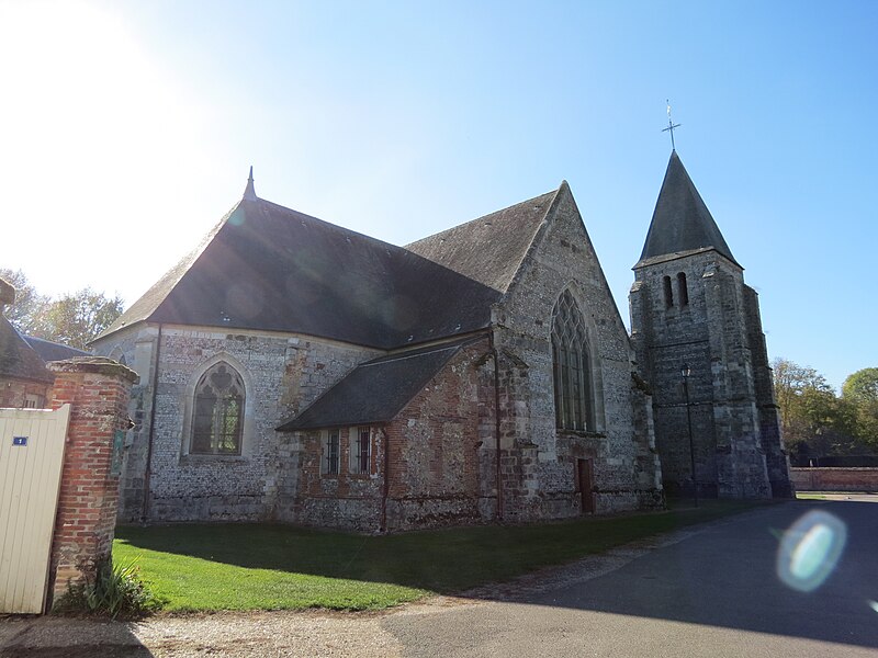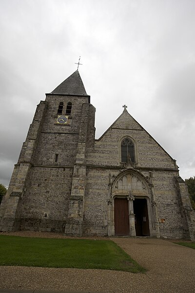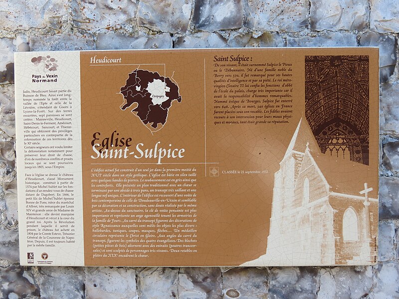 L'église Saint-Sulpice d'Heudicourt a été construite dans la première moitié du XVIe siècle. Elle se rapproche, par sa structure et son décor, de l'église Saint-Aubin de Doudeauville-en-Vexin. La façade est en appareil dit pseudidomos, avec un parement en silex taillé alternant des assises de pierres layées formant chaînage ; le soubassement et les contreforts sont en grès. La couverture d'ardoise repose sur une charpente en bois en forme de coque inversée, comparable au travail d'un charpentier de marine. Le plan intérieur, en croix, comprend une nef sans bas-côtés, un transept et un chœur semi-octogonal. Chaque ferme de la nef et du transept est constituée d'arbalétriers avec des aisseliers cintrés en berceau brisé et s'appuie sur des entraits apparents. Les fermes de noue franchissent la croisée du transept, d'angle à angle, sans entraits. Viollet-le-Duc décrit cette technique, où fermes, pannes et chevrons travaillent ensemble au détriment de l'entrait, comme spécifiquement anglo-normande. Des lambris polychromes couvrent l'intrados des berceaux situés entre les fermes. Les entraits sont ornés, à leurs extrémités, d'engoulants qui englobent les abouts de poutres centenaires. À chaque travée, des statues en encorbellement, peintes de couleurs vives, représentent divers personnages : l'un portant une bouteille, un autre le chapelet, un charron au travail et un donateur. Au-dessus du sanctuaire, la clé de voûte figure un ange agenouillé tenant les armoiries de la famille de Fours. Aux angles de la croisée du transept figurent les quatre évangélistes ; trois d'entre eux sont représentés avec leurs attributs animaux : le taureau pour saint Luc, l'aigle pour saint Jean et le lion pour saint Marc, tandis que saint Matthieu apparaît sous la forme de l'homme ailé. Deux retables en plâtre du XIXe siècle encadrent le chœur. L'édifice est placé sous le vocable de saint Sulpice et l'église ainsi que le terrain y attenant sont classés au titre des monuments historiques depuis le 21 septembre 1932.