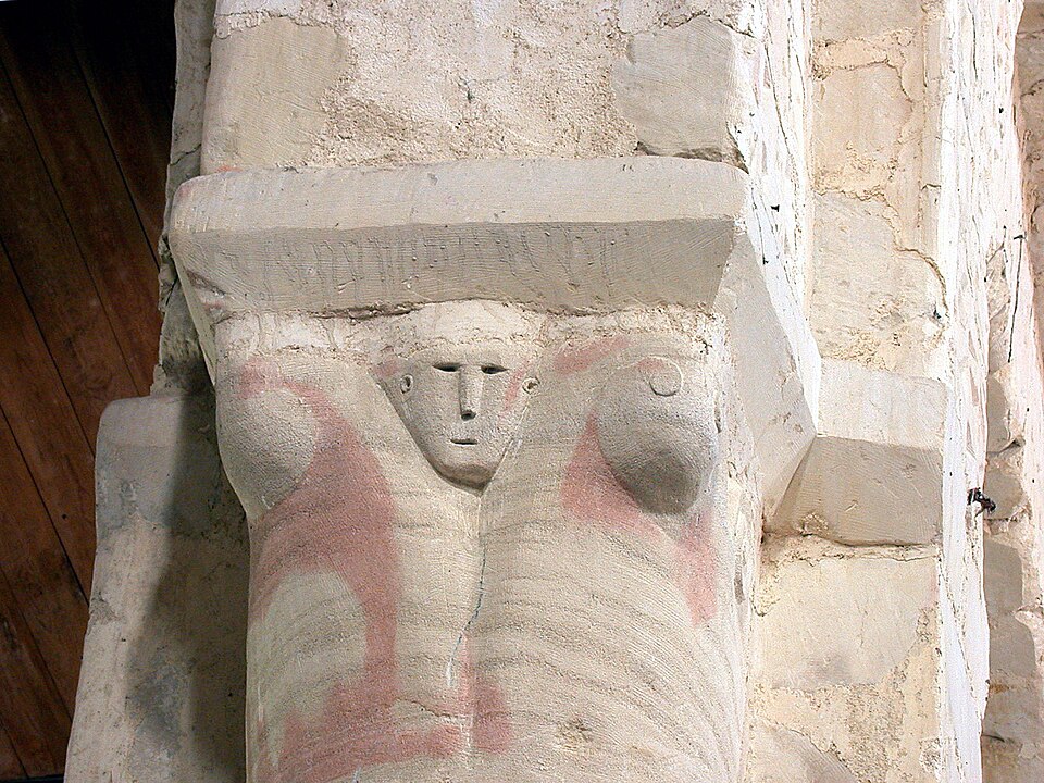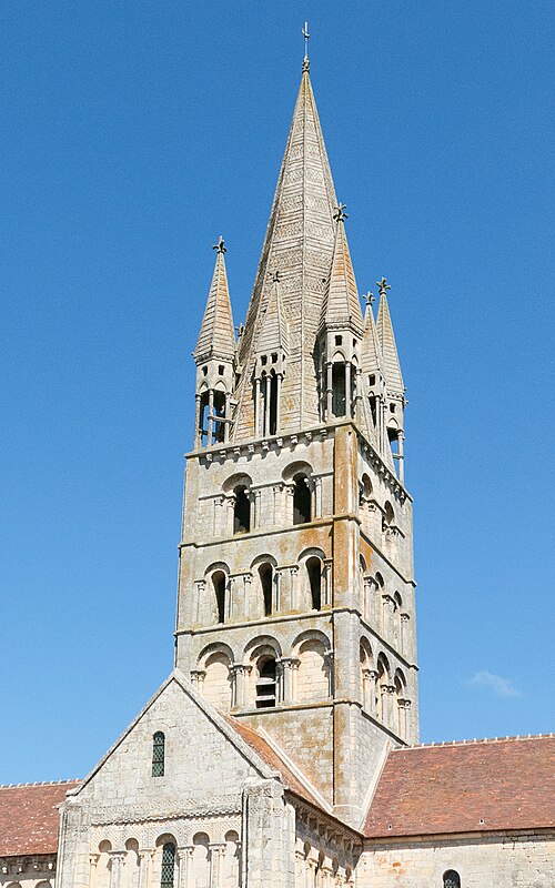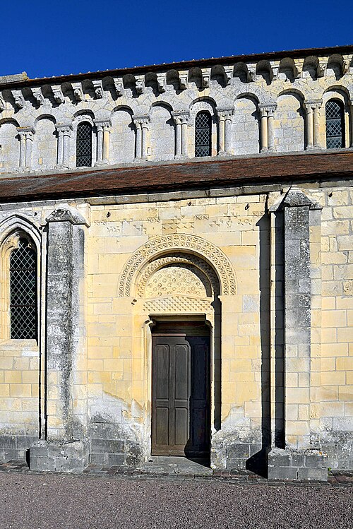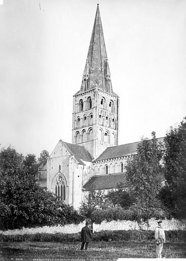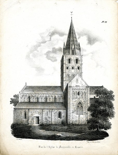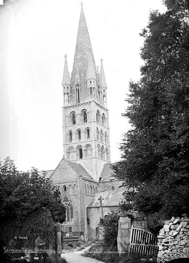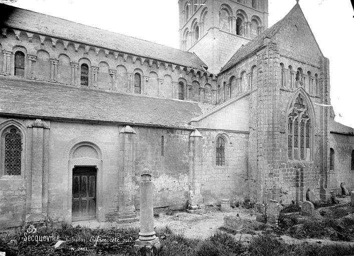 L'église Saint-Sulpice de Secqueville-en-Bessin se dresse dans le hameau de Guerville, à l'ouest de la commune, dans le Calvados en Normandie, et est classée au titre des monuments historiques par la liste de 1840. Elle dépendit de l'église Saint-Étienne de Caen après son acquisition à douze habitants du village, acquisition dont la possession fut contestée par un clerc nommé Herbert, débouté par un arrêt de la cour royale de Caen, puis grevée de droits viagers par Hugues, fils d'Ébrehar. Les religieux de Saint-Étienne de Caen sont à l'origine de son édification remarquable dans cette modeste paroisse. En 1105, Robert Fitz Haimon trouva refuge dans le clocher après avoir tenté sans succès d'assiéger Bayeux; Robert Courteheuse le mit en fuite, mit le feu à la tour et le captura, épisode relaté par Wace dans le Roman de Rou et encore perceptible par de faibles traces sur les piliers de la nef. Il est possible que seule la nef soit antérieure à 1105 et que la tour et le transept aient été reconstruits sous le règne d'Henri I, entre 1106 et 1135; des vestiges de l'abside et des absidioles romanes furent repérés au XIXe siècle. Le chœur a été en partie rebâti au XVIIe siècle, sans doute à l'emplacement d'une construction du XVe siècle dont subsiste le chevet plat, dans une réalisation comparable à celle de Jean de Baillehache pour Saint-Étienne de Caen. Le fond du croisillon sud du transept et la tour furent restaurés au XIXe siècle par Victor Ruprich-Robert, qui respecta les sculptures; pendant les combats de 1944 la tour, soupçonnée d'être un observatoire, reçut plusieurs obus et fut ensuite restaurée à l'identique. L'édifice, lié à l'architecture de Saint-Étienne de Caen et influencé par la cathédrale de Bayeux, présente une ordonnance monumentale : il s'élève au sommet d'une petite colline, comporte quatre travées avec bas-côtés, un transept saillant et un chœur flanqué de collatéraux et terminé par un chevet plat. La nef offre deux niveaux, grandes arcades et fenêtres hautes, la croisée du transept s'ouvre sur quatre arcs et le clocher domine un bâtiment par ailleurs peu élevé. Le décor, proche des tendances autour de 1100, associe motifs géométriques sur les claveaux de la croisée du transept et sur les écoinçons des arcades de la nef, motifs que l'on retrouve dans la cathédrale de Bayeux ainsi qu'à Rochester et Canterbury; les murs gouttereaux de la nef et du transept sont ornés d'arcatures selon le principe d'alternance venu de Saint-Étienne de Caen. La tour reçut au XIIe siècle un clocher comparable au clocher nord de Saint-Étienne de Caen; elle présente trois étages carrés, une corniche à modillons et une flèche octogonale datée du XIIIe siècle. À l'extérieur, la face sud est richement décorée par des arcatures appuyées sur des colonnes géminées, tandis que le croisillon sud pousse ce dispositif ornemental à son extrême. Les chapiteaux à la retombée des grands arcs du côté nord, très plats et archaïques, appartiennent sans doute au XIe siècle; trois d'entre eux montrent des essais de figures humaines avec traces de polychromie, tandis que ceux du sud, plus soignés, incluent des personnages debout encadrés d'oiseaux aux ailes déployées et rappellent certains chapiteaux de la crypte de Bayeux et de la cathédrale de Canterbury. Le décor en faible relief est dominé par un semis de triangles et d'étoiles. Quatre clochetons d'angle disparurent lors de réparations après l'orage du 16 juin 1610 et furent reconstruits lors des travaux de remise en état de la flèche après la seconde guerre mondiale. L'église comporte une verrière au chevet représentant les quatre évangélistes. Au titre des objets mobiliers, cinq éléments furent inscrits en 1977 : la chaire à prêcher (premier quart du XVIIIe siècle), une statue de saint Sulpice évêque en pierre taillée, un Christ en croix, un tableau de la Visitation et un tableau de saint Charles Borromée, ces quatre derniers datant du XVIIe ou du XVIIIe siècle; un chapier tournant est installé dans le collatéral nord du chœur, sans doute en raison d'une sacristie insuffisante. Les dimensions principales sont : longueur 33 m, largeur 14,50 m, longueur du transept 17,50 m, largeur intérieure de la nef 6,30 m et profondeur du chœur 9,50 m. Monument exceptionnel dans une commune rurale, Saint-Sulpice reprend des solutions architecturales propres aux grands sanctuaires, abbatiales et cathédrales, témoignant d'une certaine virtuosité et d'une position peut‑être avant-gardiste.
