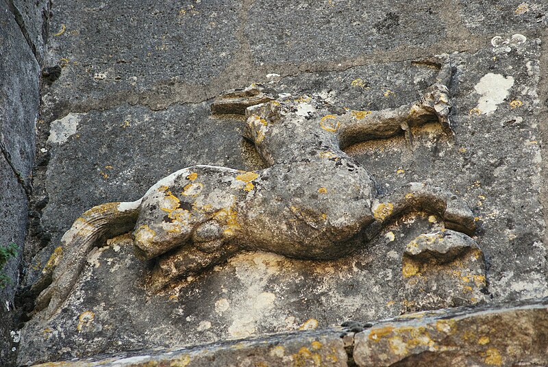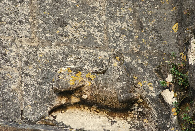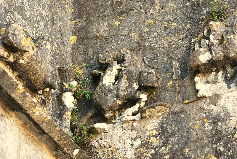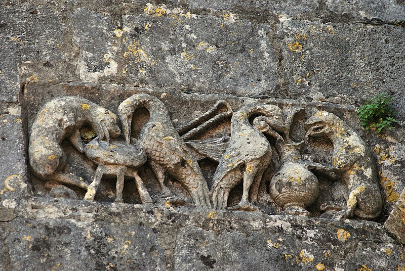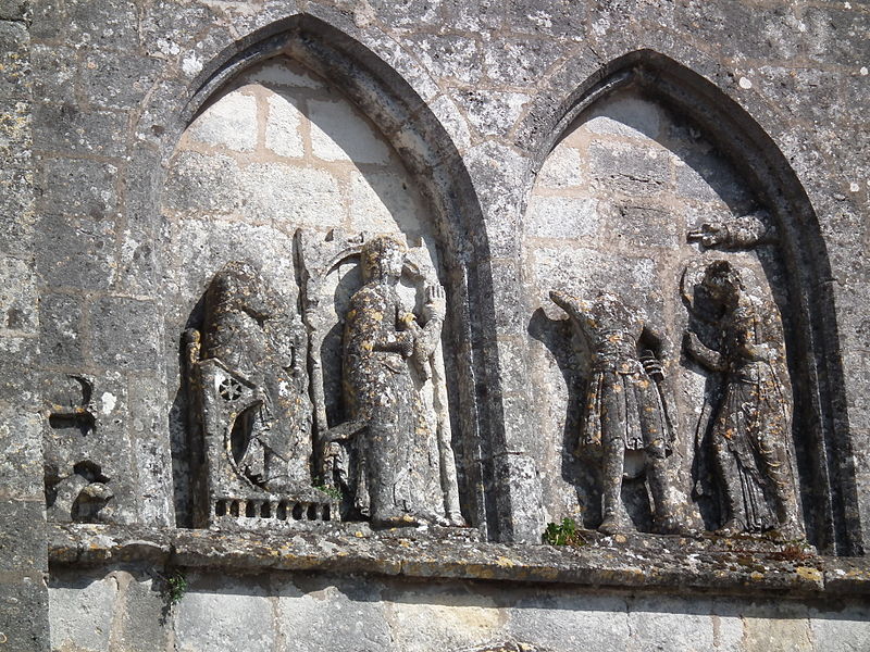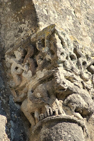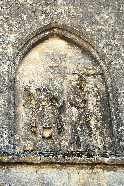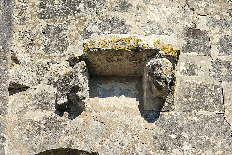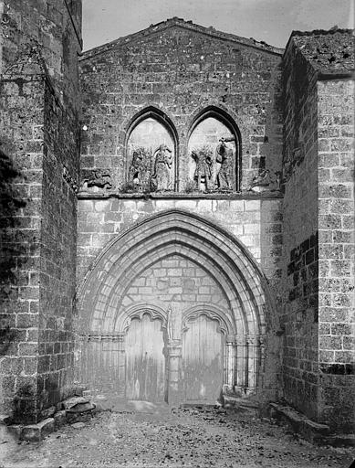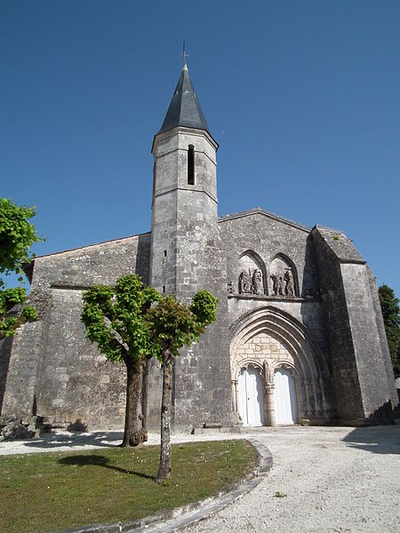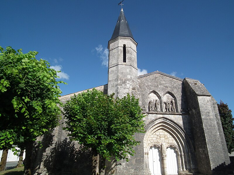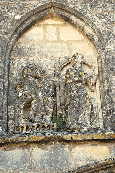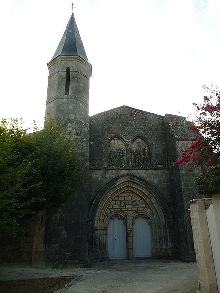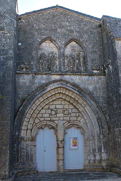 La façade ouest s'ouvre par un portail dont les deux portes, ornées d'arcs à redents, sont encadrées par trois arcs superposés reposant sur des colonnettes. Au‑dessus, deux baies géminées portent la représentation du martyre de saint Symphorien, encadrée — au‑dessus du bandeau horizontal soutenant l'ensemble — par le Sagittaire et sa victime. Sur le contrefort nord‑ouest, le fabliau du renard et de la cigogne est présenté en deux scènes juxtaposées dans un même panneau. Sur le contrefort sud‑ouest, deux scènes sculptées rapportées dans le parement sur une pierre peuvent provenir de l'ancienne église du XIIe siècle.