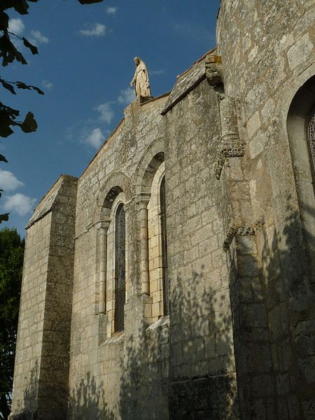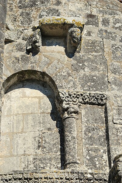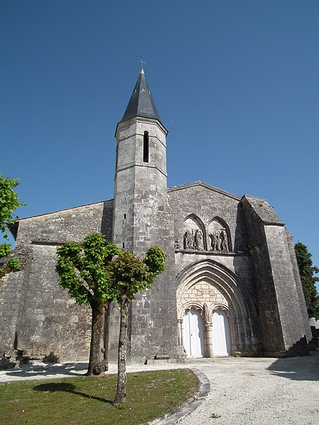 L'église Saint‑Symphorien de Grézac présente un plan à deux nefs. La nef nord conserve une abside du XIIe siècle jusqu'aux amorces d'un transept disparu ; le mur nord et les piliers ont été reconstruits au XVIIIe siècle. Le mur ouest, aligné sur une entrée reconstruite à la fin du XIVe siècle, forme la nef du sud. D'anciennes bases de la façade du XIIe siècle subsistent à l'angle nord.