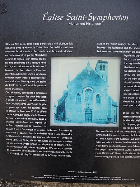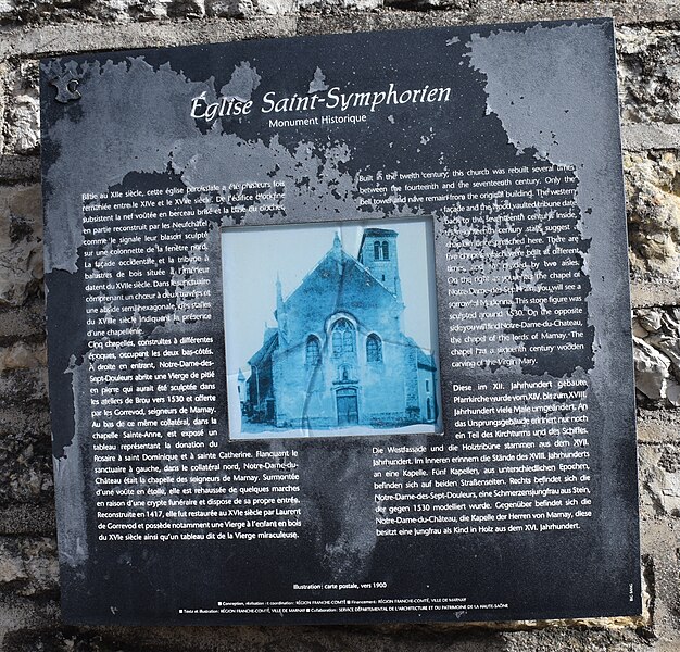 L'église Saint-Symphorien est située à Marnay, en Haute-Saône. La nef et la base du clocher remontent aux XIIe–XIIIe siècles. L'édifice a été remanié à plusieurs reprises entre le XIVe et le XVIIe siècle; la façade et les tribunes sont datées des XVIe–XVIIe siècles. Une ancienne chapelle seigneuriale a été reconstruite en 1417. Le chœur conserve des stalles du XVIIIe siècle. L'église comprend cinq chapelles. La chapelle Notre-Dame-des-Sept-Douleurs abrite une Vierge de pitié en pierre, attribuée possibles à un sculpteur ayant travaillé au monastère de Brou et offerte par la famille Gorrevod, seigneurs de Marnay. La chapelle Notre-Dame-du-Château, ancienne chapelle des seigneurs de Marnay, surplombe une crypte et possède une entrée indépendante. L'intérieur présente la nef, des stations du chemin de croix, une statue polychrome et le maître-autel. L'édifice est inscrit au titre des monuments historiques par arrêté du 15 novembre 1926.