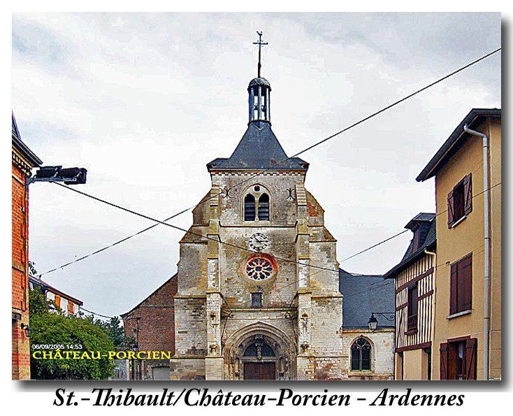 L'église Saint-Thibault se dresse à Château-Porcien, dans les Ardennes, sur une partie du village construite sur une île formée par l'Aisne. Elle est l'ancienne église d'un prieuré fondé en 1143 sous l'archevêque Samson de Mauvoisin. L'édifice présente des éléments des XVe, XVIe et XVIIe siècles ; le clocher-porche est daté de la seconde moitié du XVe siècle. L'élément le plus remarquable est la tour occidentale dont le rez-de-chaussée sert de porche et qui ouvre sur une nef de quatre travées ; ses angles sont renforcés par de puissants contreforts. La tour-porche s'ouvre par un portail surmonté d'une balustrade et d'une rosace ; les voussures de ce portail ont toutefois souffert. À l'intérieur, on relève notamment les fonts baptismaux, l'aigle-lutrin, plusieurs bas-reliefs et lambris, ainsi que divers tableaux, dont deux signés Nicolas Wilbault. Un tableau de Jacques Wilbault, intitulé "Triomphe de la religion après la révolution", a disparu après 1918. L'édifice a été inscrit au titre des monuments historiques en 1971 puis classé en 1984.