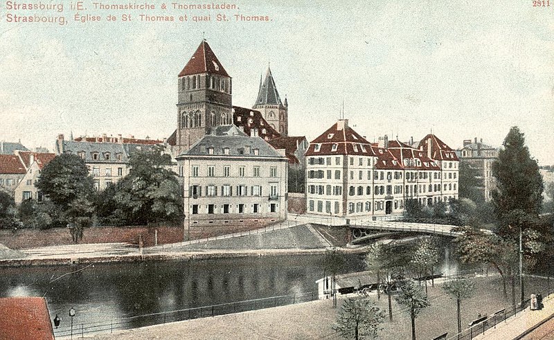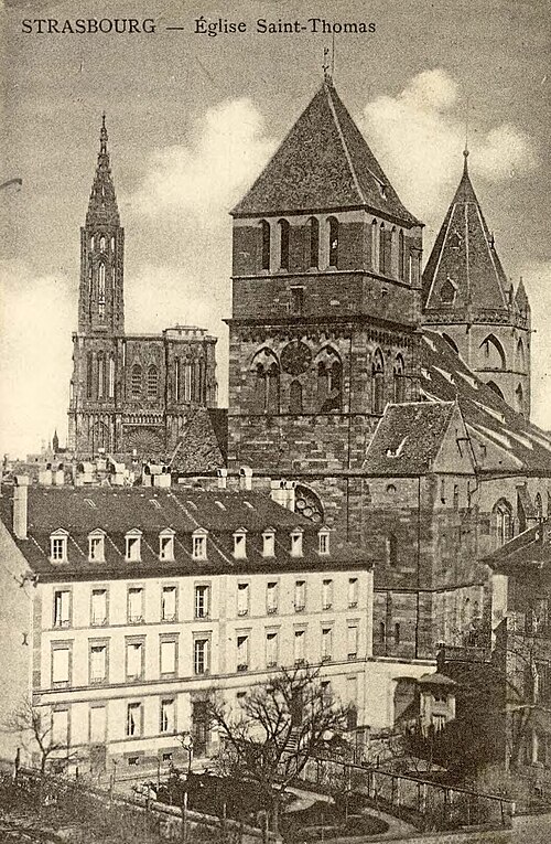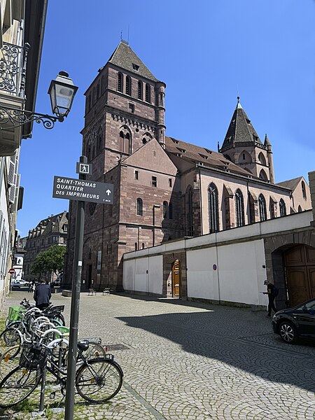 Église Saint-Thomas, située place Saint-Thomas dans le centre historique de Strasbourg, est un édifice majeur du Bas-Rhin, classé au titre des monuments historiques depuis 1862. Considérée comme la « cathédrale du protestantisme en Alsace », elle est le seul exemple régional d'église-halle et l'unique église protestante ayant conservé un chapitre de chanoines. Un lieu de culte dédié à l'apôtre Thomas occupe ce site depuis le VIe siècle et l'évêque Saint Florent y fut inhumé. Au IXe siècle, l'évêque Adeloch fit reconstruire une église et une école, et le chapitre chargé de gérer leurs biens fit sculpter vers 1130 le sarcophage roman de l'évêque. Après des destructions par incendie en 1007 et par la foudre en 1144, une reconstruction importante débuta en 1196, privilégiant une façade fortifiée et une tour-porche aux proportions romanes et aux fenêtres gothiques. Les travaux, interrompus à plusieurs reprises, se poursuivirent jusqu'en 1521 avec l'achèvement de la chapelle des Saints-Évangélistes, conservant un caractère gothique tardif.