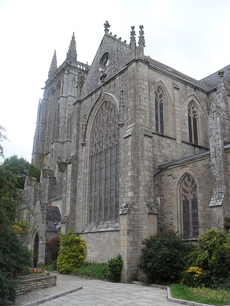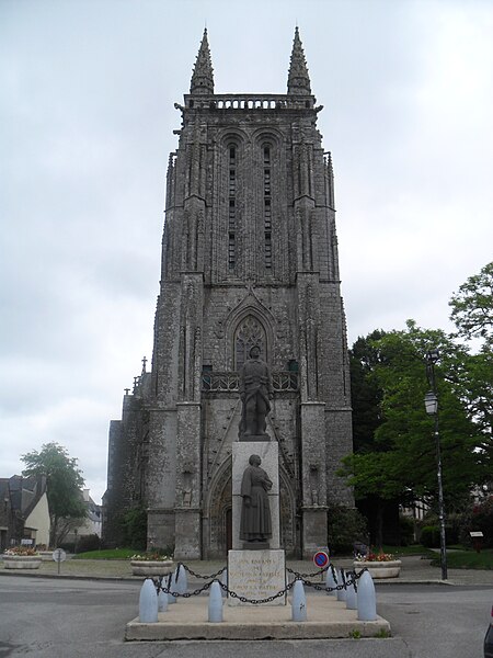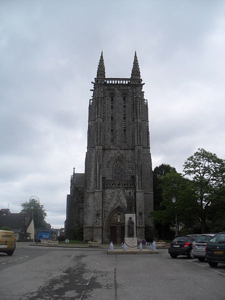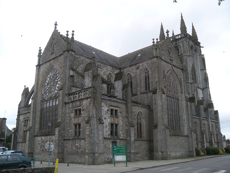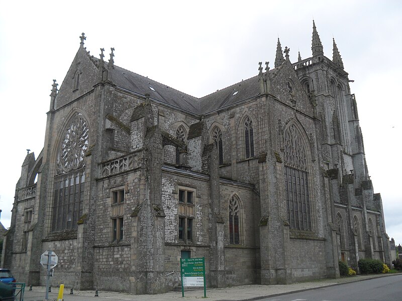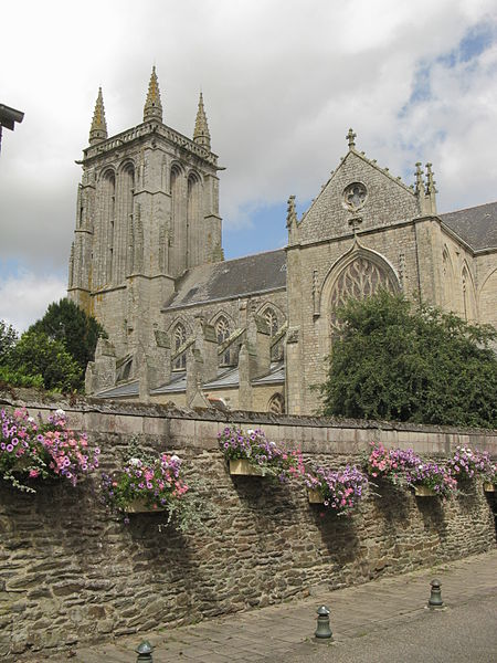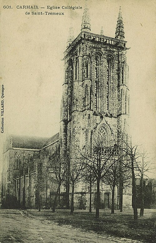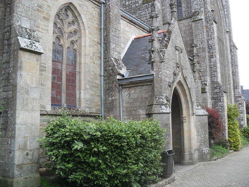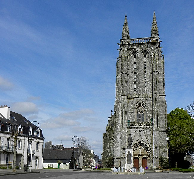 Le clocher est l'unique vestige de l'ancienne église. Le beffroi, qui forme le dernier étage de la tour carrée, présente de longues ouvertures. Les dates 1529-1535 semblent indiquer la période des travaux ; elles sont attestées par une inscription et des marques de tâcheron. Dans le tympan de la porte double, à la base du clocher, se trouve la statue du saint. Un double gâble couronne le portail et s'amortit dans une galerie correspondant au premier étage de la tour. La collégiale, établie vers 1371, a été détruite. En 1887, l'architecte Le Guerranic a procédé à une reconstruction totale de l'édifice, à l'exception du clocher-porche, attribué à l'atelier de la chapelle Saint-Herbot en Plonévez-du-Faou.