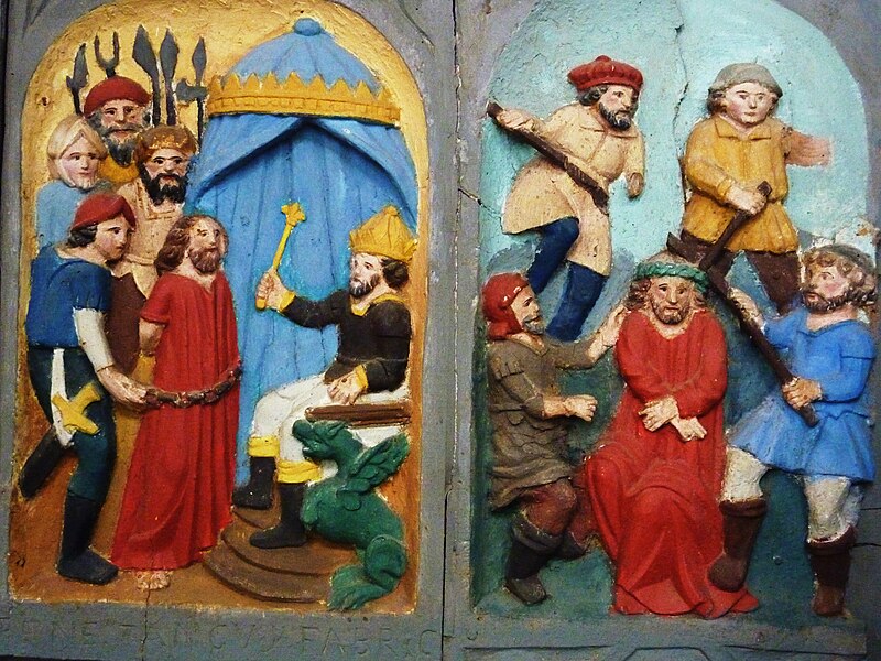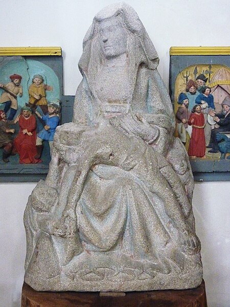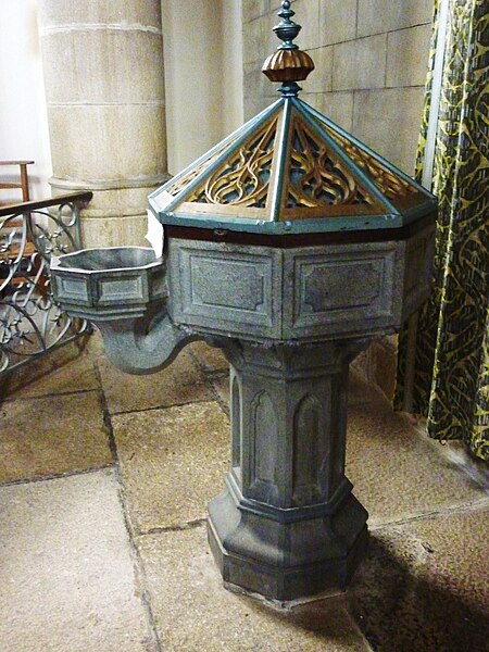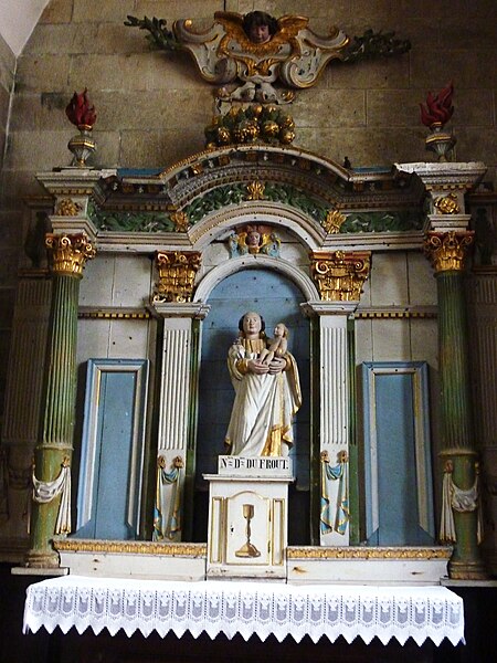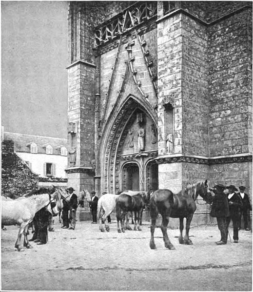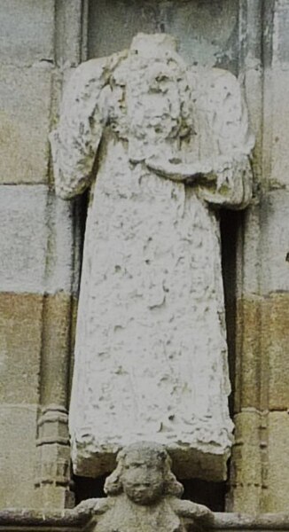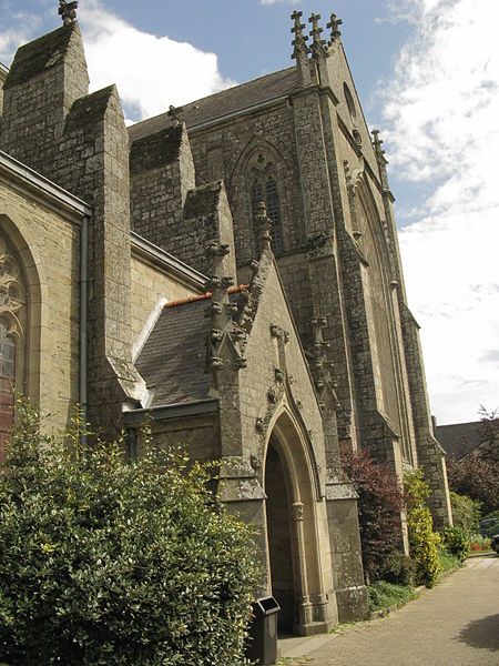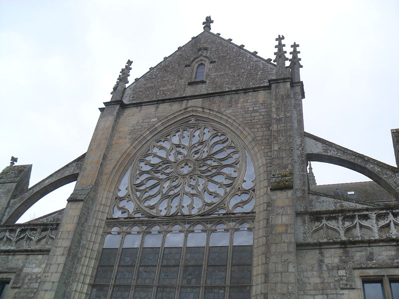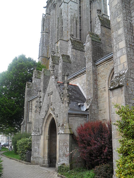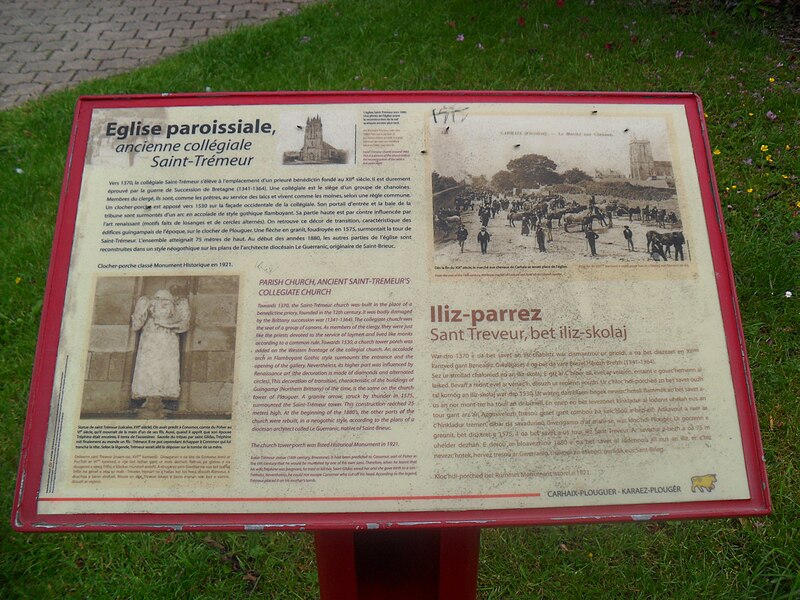 Le clocher est l'unique vestige de l'ancienne église. Le beffroi, qui forme le dernier étage de la tour carrée, présente de longues ouvertures. Les dates 1529-1535 semblent indiquer la période des travaux ; elles sont attestées par une inscription et des marques de tâcheron. Dans le tympan de la porte double, à la base du clocher, se trouve la statue du saint. Un double gâble couronne le portail et s'amortit dans une galerie correspondant au premier étage de la tour. La collégiale, établie vers 1371, a été détruite. En 1887, l'architecte Le Guerranic a procédé à une reconstruction totale de l'édifice, à l'exception du clocher-porche, attribué à l'atelier de la chapelle Saint-Herbot en Plonévez-du-Faou.