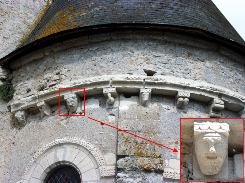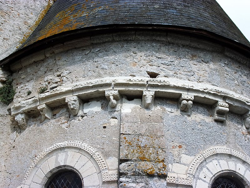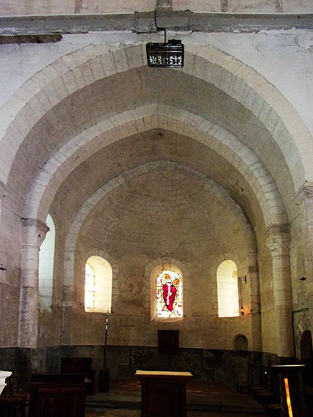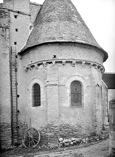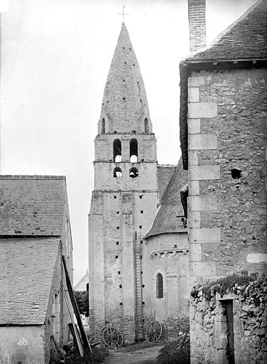Le chœur, non séparé de la nef par un transept, comprend deux courtes travées couvertes d'une voûte en berceau brisé et se termine par une abside semi‑circulaire voûtée en cul‑de‑four éclairée par trois baies en plein cintre. Le clocher, latéral et de base carrée, est inséré sur le côté sud des travées du chœur ; il repose sur de faibles contreforts plaqués qui s'amortissent en hauteur, et sa maçonnerie montre encore les trous de boulin des échafaudages. Le beffroi comporte deux étages en léger retrait, chacun percé sur chaque face de deux baies en plein cintre munies d'abat‑sons, et il est couronné par une flèche octogonale en pierre à pans brisés, analogue à celle de quelques autres clochers de la vallée de l'Indre.