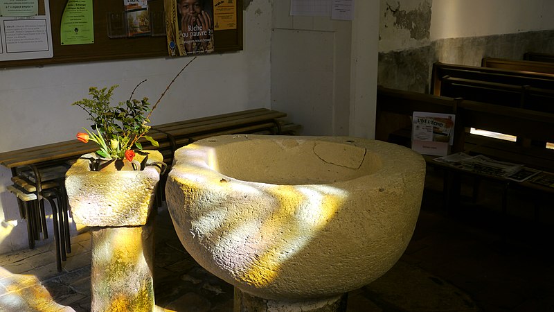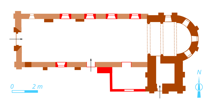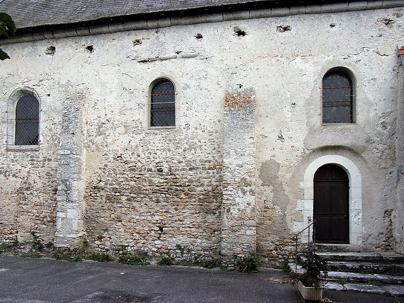 La nef, formée de quatre travées, est marquée à l'extérieur côté sud par des contreforts plaqués et côté nord par deux contreforts intérieurs ; chaque travée comporte une baie au nord et au sud. Le portail occidental en plein cintre, surmonté d'une baie similaire, est encadré par deux contreforts. Lors d'une reprise, une porte et sa baie de la première travée sud ont été murées au profit d'une ouverture dans la troisième travée ; la quatrième travée a été prolongée vers le sud par une sacristie moderne flanquée d'un contrefort puissant. Les murs, d'épaisseur modérée (0,90 m), sont couverts d'ardoises.