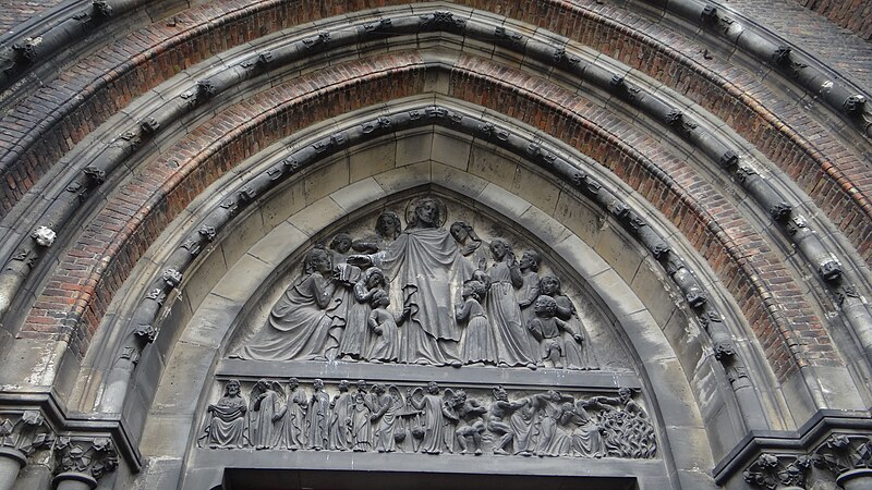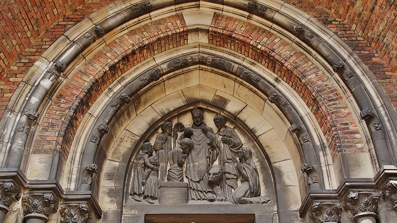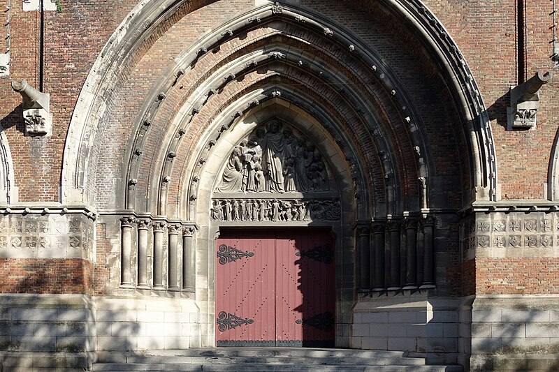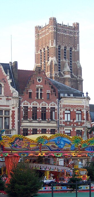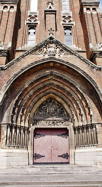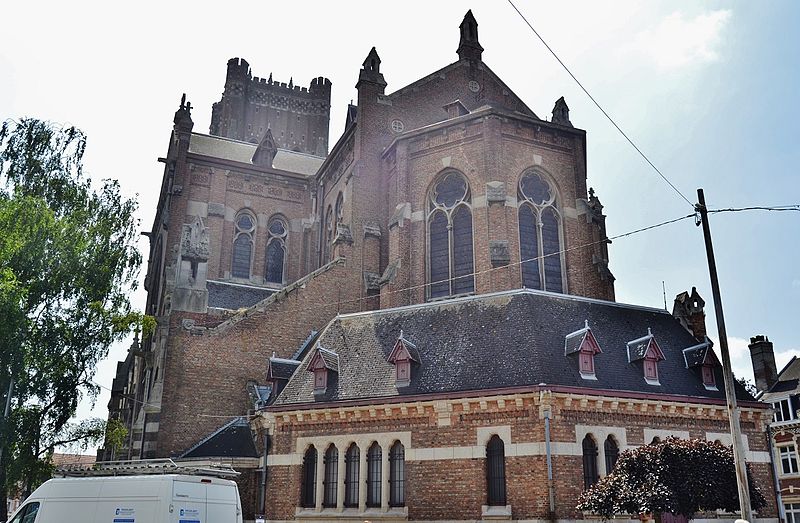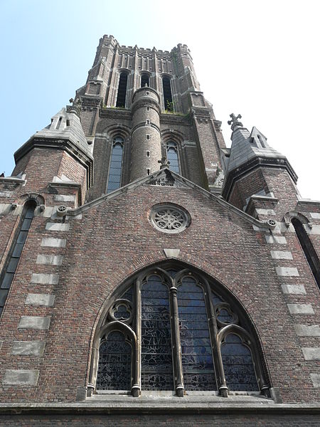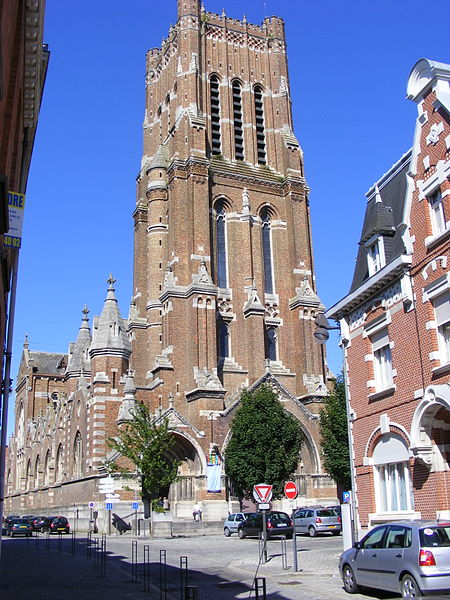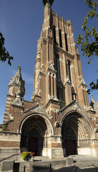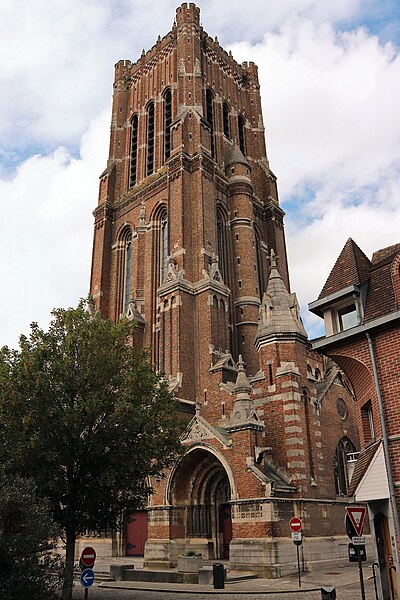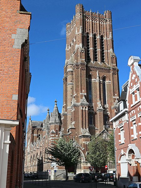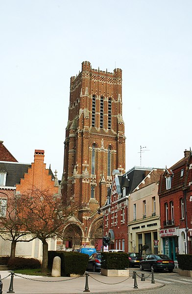 L'édifice reconstruit adopte un style néogothique régionaliste, dit néoflamand, et s'inspire des églises gothiques en brique de Flandre. Il est construit en brique, béton armé et pierre, et intègre des citations du gothique classique français ainsi que des techniques modernes, notamment des charpentes métalliques qui structurent les voûtes. La façade est dominée par une tour massive haute de 68 mètres qui surplombe trois porches en arc brisé ; cette tour s'inspire de celle de l'ancienne église détruite et de tours d'autres églises de la région, comme celles d'Aire-sur-la-Lys, Dunkerque ou Ypres.