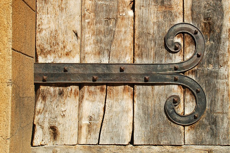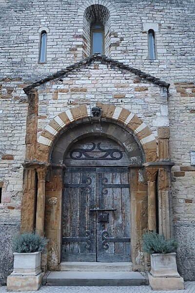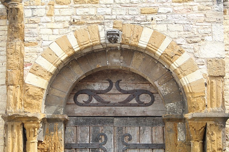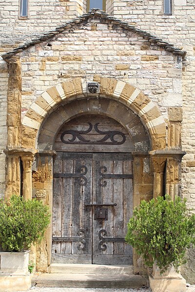 La façade occidentale, soutenue par deux contreforts latéraux courts mais puissants, affiche une polychromie due à l'association de pierre blanche et de grès ferrugineux. Le portail roman, logé sous un avant‑corps (protiro), comporte une porte en bois massif ornée de pentures et s'appuie sur des pilastres cannelés et des colonnes aux chapiteaux sculptés de motifs floraux stylisés. Les piédroits, pilastres et colonnes sont en grès ferrugineux ; l'arc cintré au‑dessus du portail présente une alternance de claveaux blancs et bruns, interrompue par une clé d'arc en pierre grise. L'avant‑corps, couvert de lauzes, est coiffé d'un triplet de baies dont les deux fenêtres latérales, très fines, sont surmontées chacune d'un arc monolithe. La façade nord, fortement dégradée, conserve des vestiges d'arcatures romanes.