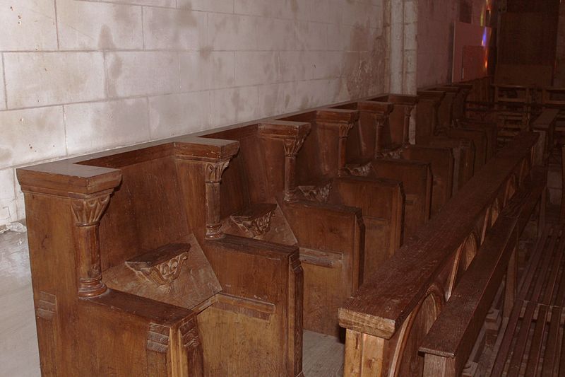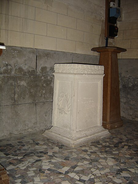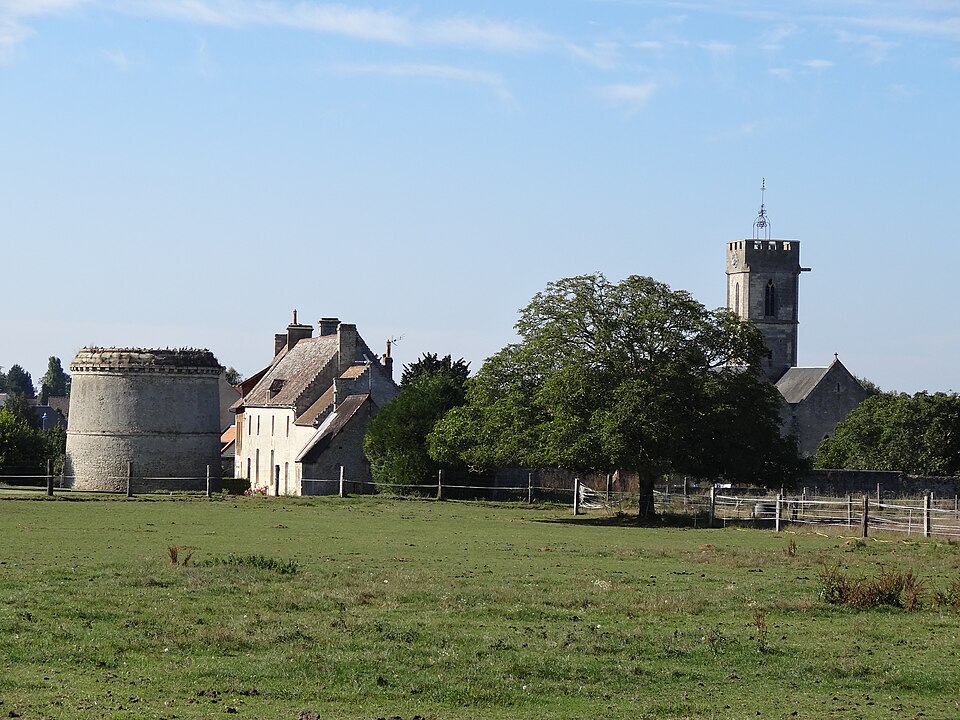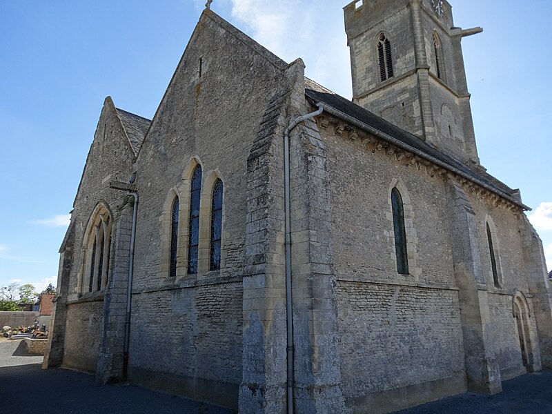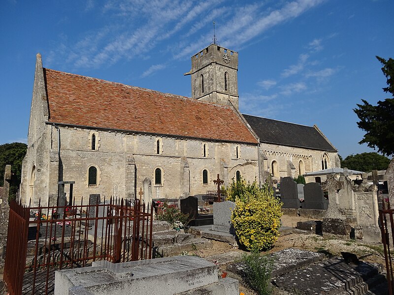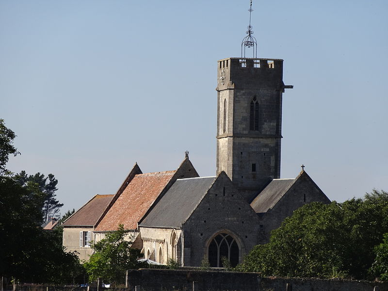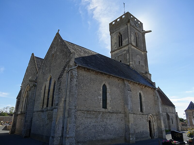 La tour-clocher, accolée à la façade nord, compte trois niveaux dont la partie inférieure est du XIIe siècle et la supérieure du XVe; seul le troisième niveau possède de hautes fenêtres étroites munies d'abat-sons. La tour est couronnée d'un parapet crénelé protégeant une plate-forme surmontée d'une girouette en fer forgé, tandis que deux grandes gargouilles côté nord assurent l'évacuation des eaux. La nef et le chœur sont séparés par un arc en plein cintre à double rouleau, dont une archivolte porte des bâtons brisés et l'autre des tores; ces archivoltes reposent sur des colonnes aux chapiteaux sculptés de moulures perlées, de palmettes ou de godrons. La première travée du chœur date du XIIe siècle; les voûtes du reste du chevet ont sans doute été reprises lors de la construction de la chapelle Notre-Dame-des-Vœux au XIIIe siècle, qui communique par deux arcades en arc brisé. Lors des réparations après les dégâts de juin 1944, le mur aveugle du chevet fut percé d'une grande fenêtre à meneaux et le tableau du vieux retable représentant une nativité a été placé sur le mur droit de la nef. Les fonts baptismaux du XVIIIe siècle, initialement prévus à l'entrée de la nef, ont été déposés dans la chapelle dans les années 1980. Tous les vitraux, détruits en 1944, ont été remplacés par des créations du maître-verrier Jacques Michel, représentant des scènes des évangiles et de la Bible, ainsi que saint Vigor.