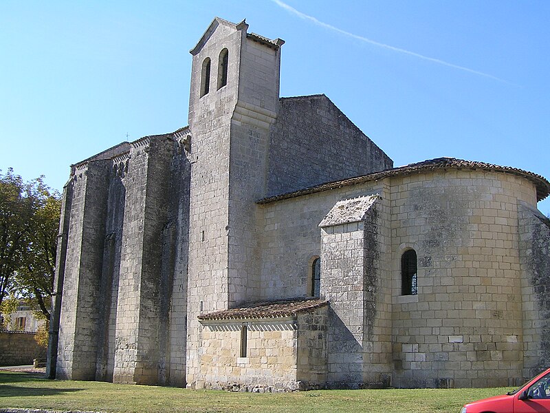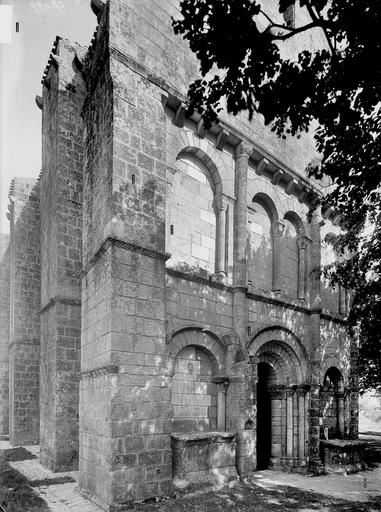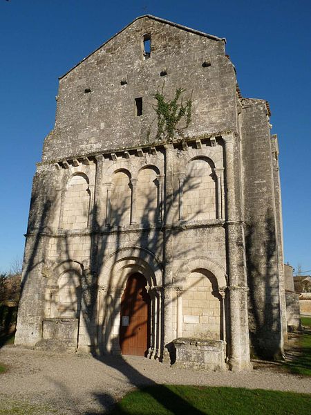 La façade occidentale, élevée sur deux niveaux et surmontée d'un pignon obtus, est divisée en trois parties séparées par deux longues colonnes. Le portail principal est encadré d'arcatures aveugles et s'orne de chapiteaux sculptés, dont les motifs végétaux, animaux et des visages humains. Au premier niveau, quatre arcatures aveugles reposent sur une corniche à damier ; devant certaines d'entre elles subsistent les traces d'anciens autels. Les murs latéraux sont renforcés par de forts contreforts couronnés de corbeaux qui portaient autrefois les créneaux de défense.
