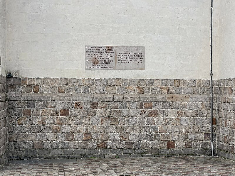 L'église Saint-Vincent est un édifice catholique situé à Marcq-en-Barœul, dans le département du Nord. Elle se trouve au n° 14 de la place du Général-de-Gaulle, à l'angle de la rue Albert-Bailly et de l'avenue Foch, dans le centre-ville. L'église initiale date du XIIe siècle et a été complétée au début du XVIe siècle, ce qui en fait le plus ancien bâtiment de la commune. Au fil des siècles, le quartier du Bourg s'est développé autour d'elle, formant le cœur historique de Marcq-en-Barœul. Après avoir souffert pendant la Révolution, elle a été abandonnée quelques années puis restaurée sous l'Empire et enrichie d'œuvres provenant de la collégiale Saint-Pierre de Lille alors détruite. La croissance de la population a conduit à une extension en 1865 : les bas-côtés de la nef ont été élargis et surélevés, transformant l'édifice en hallekerk (église-halle). Endommagée pendant la Première Guerre mondiale, notamment par un affaissement du sol et l'effondrement partiel de la corniche, elle a été restaurée après l'Armistice. Le mobilier comprend quatre confessionnaux en bois sculpté et des stalles représentant quatorze fondateurs d'ordres religieux. L'architecture présente un chevet, une tour-clocher et des vitraux, dont l'un représente l'Assomption de la Vierge et un autre est dédié à saint Vincent. Deux tableaux, L'adoration des bergers et Les saintes femmes au tombeau, sont l'œuvre du peintre Pharaon de Winter. La tour-clocher est inscrite au titre des monuments historiques par arrêté du 3 décembre 1987 et appartient à la commune.