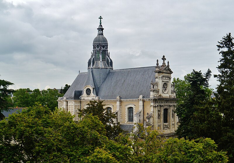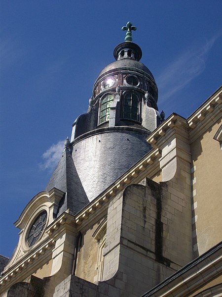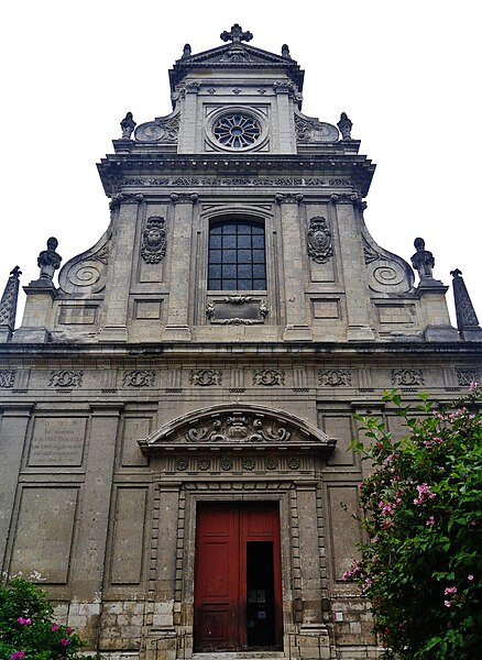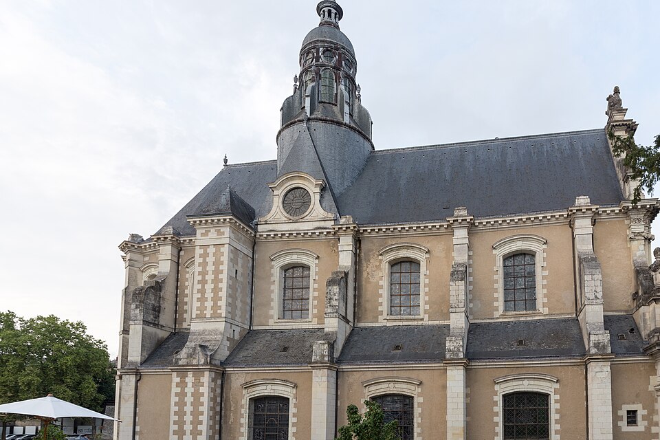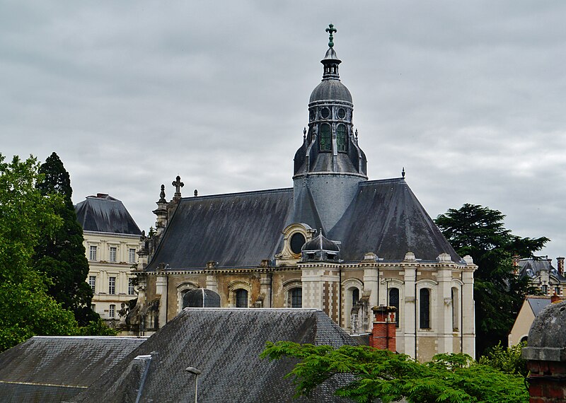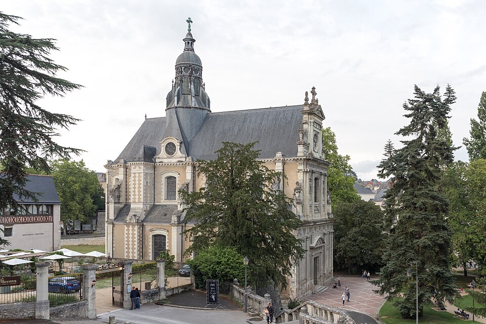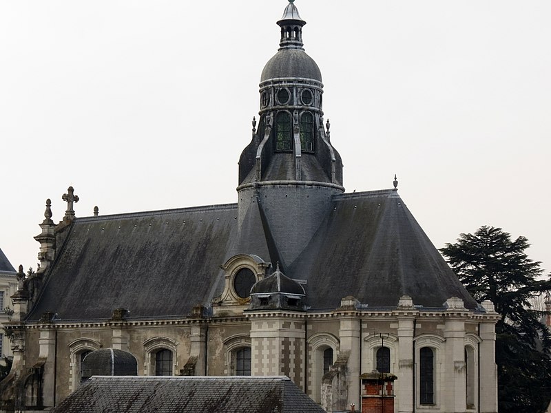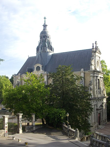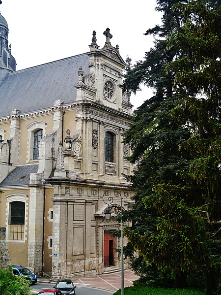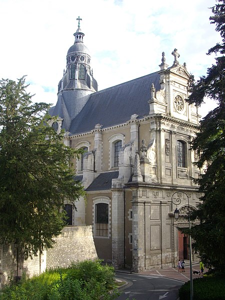 L'église Saint-Vincent-de-Paul, anciennement chapelle Saint-Louis du collège des Jésuites, se situe à Blois (Loir-et-Cher). La fondation d'un premier collège remonte à 1581 ; les jésuites prennent la direction de l'établissement au début des années 1620 et acquièrent les terrains destinés à la construction de la chapelle dans les années 1620. La construction de l'église fut marquée par de longues interruptions : certains documents indiquent un début des travaux en 1626, d'autres situent une reprise décisive en 1634. Les plans sont attribués par certains à François Mansard, tandis que des dessins conservés à Quimper laissent penser qu'un architecte jésuite, le père Martilange (Étienne Martellange), a également participé au projet ; Charles Turmel dirigea la reprise des travaux en 1634 et adapta plusieurs éléments du projet initial, notamment l'élévation de la façade, la nef et le plan des chapelles latérales. En 1655, le parti de couvrement évolua : la nef fut recouverte d'un lambris et le dôme fut déplacé d'une travée. La décoration intérieure, particulièrement celle du chœur et de la tribune d'orgue, fut réalisée à partir de 1674 grâce au financement d'Anne‑Marie de Montpensier, qui fit placer dans le chœur un grand retable et deux cénotaphes, dont l'un contient le cœur de Gaston d'Orléans. Jusqu'au XVIIIe siècle l'édifice servit de chapelle au collège ; après l'expulsion des jésuites, les bâtiments du collège furent désaffectés et le parvis transformé en Place Royale. Pendant la Révolution la chapelle fut consacrée Temple de la Liberté, livrée au vandalisme, puis utilisée comme magasin à fourrage, tandis que les bâtiments du collège furent affectés au bureau de bienfaisance. L'édifice redevint un lieu de culte au début du XIXe siècle et fut rendu au culte en 1826‑1827, devenant église paroissiale sous le vocable de Saint‑Vincent‑de‑Paul ; une dénomination de Notre‑Dame‑de‑l'Immaculée‑Conception est encore mentionnée pour 1856 dans certaines sources. Une restauration dirigée par Jules de La Morandière débuta en 1847, modifiant certains détails de façade, reprenant le couvrement de la nef et de la coupole et remaniant la charpente de la lanterne ; à cette période l'église reçut des vitraux de l'atelier Lavergne, dont une verrière subsiste. Dans les années 1880, le grand tableau du retable, disparu pendant la Révolution, fut remplacé par une niche ovale éclairée zénithalement et abritant une statue de l'Immaculée‑Conception. Après 1945 les bâtiments du collège furent largement démolis lors de transformations administratives et postales ; le corps sud subsista mais fut profondément remanié, et deux lucarnes furent déposées au dépôt lapidaire du cimetière Saint‑Saturnin. Classée aux monuments historiques en 1917, l'église présente des dimensions modestes, une façade rythmée par trois ordres classiques superposés et, à l'intérieur, une ordonnance de type dorique. Le chœur, richement décoré, et la tribune d'orgue conservent un décor en stuc imitant le marbre ; la façade porte encore des motifs monarchiques et l'édifice comprend une nef à travées flanquée de chapelles, une abside à pans et divers monuments funéraires liés à la famille de Gaston d'Orléans.