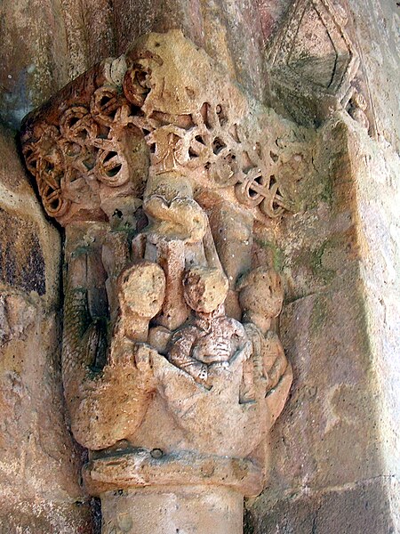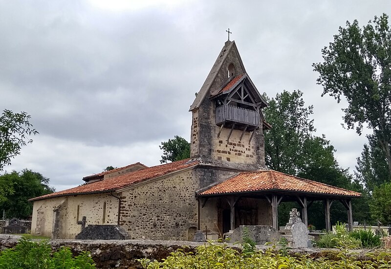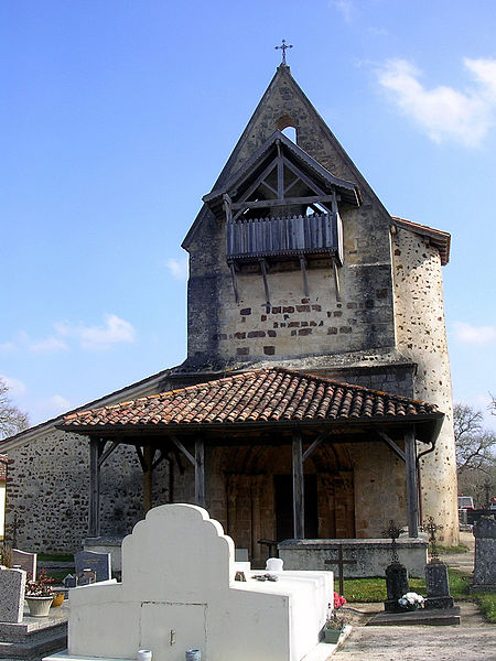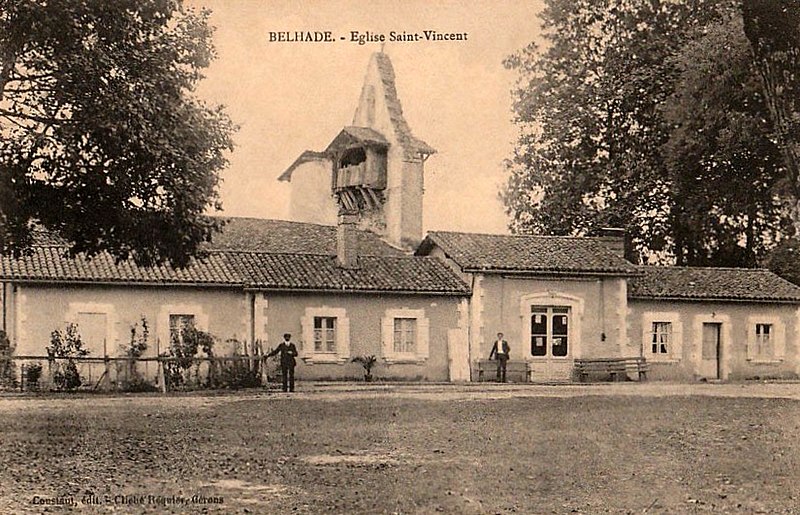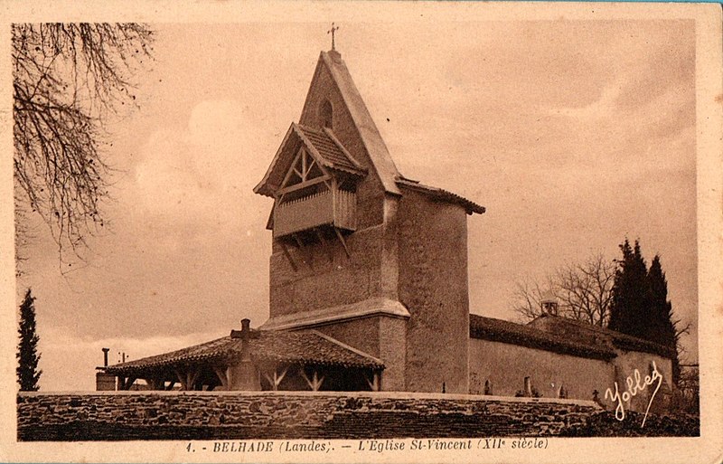 L'église Saint-Vincent-de-Xaintes, située à Belhade dans les Landes, est inscrite au titre des monuments historiques par arrêté du 30 juillet 1968. De type roman, elle présente une haute abside, une nef basse et un clocher-mur formant la façade, accolé d'une tourelle ronde d'escalier. La nef se compose d'une seule travée couverte d'une voûte surbaissée ; au nord, un bas-côté, qui était à l'origine une chapelle seigneuriale, a été prolongé par une travée moderne. L'arc triomphal à deux rouleaux ouvre sur un chœur polygonal voûté par de grands arcs d'ogives reliés par un gros pendentif, dont les retombées s'appuient sur des culots sculptés de figures humaines, animales et de feuillage. Le portail roman, bâti en pierres rouges et protégé par un avant-porche, présente un tympan orné d'un chrisme et trois archivoltes formées d'un gros tore ; deux d'entre elles reposent sur des colonnes munies de chapiteaux sculptés, aujourd'hui relativement mutilés et représentant la tentation et le mal. La construction primitive — abside et nef — remonte au XIe siècle, tandis que le clocher-mur et le portail occidental datent du milieu du XIIe siècle. À la fin du XIVe et au début du XVe siècle, des contreforts extérieurs ont été élevés et des baies gothiques à remplages percées ; au XVe siècle, une chapelle rectangulaire voûtée d'ogives quadripartites a été ajoutée au nord-est de la nef puis prolongée vers l'ouest jusqu'à l'aplomb du clocher-mur. Le voûtement du sanctuaire et l'ouverture des baies à remplage sont datés du XIVe siècle, et la nef a été remaniée au XIXe siècle avec l'aménagement d'une tribune. La restauration de la petite chapelle en 1997 a mis au jour, sous plusieurs couches d'enduit, la peinture d'un personnage aux mains jointes dont s'échappe un phylactère portant les restes d'une inscription ; le visage souriant et le vêtement, vraisemblablement un surcot, permettent de dater cette peinture de la fin du XVe siècle et d'identifier le personnage comme le mécène du peintre. La clé de voûte de la chapelle porte l'écu de la famille de Lane, qui régna sur la seigneurie de Belhade pendant six générations, de 1415 à 1592. Parmi les autres décors, on relève une tête d'ange peinte au plafond de la chapelle et de nombreux rinceaux et motifs simples, majoritairement de couleur ocre, exécutés à main levée. Le porche en bois a subi de multiples réparations et son origine ne peut être précisée. En contrebas de l'église coule la source ou fontaine Sainte-Anne, jadis réputée dans le val de la Leyre pour ses vertus lactogènes et très fréquentée par les femmes qui venaient s'y laver les seins. La façade, le chevet, les chapiteaux et le chrisme figurent parmi les éléments remarquables de l'édifice et sont fréquemment documentés.