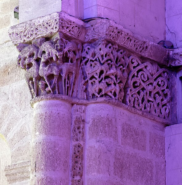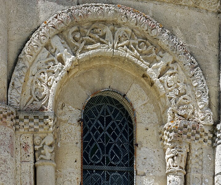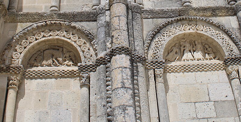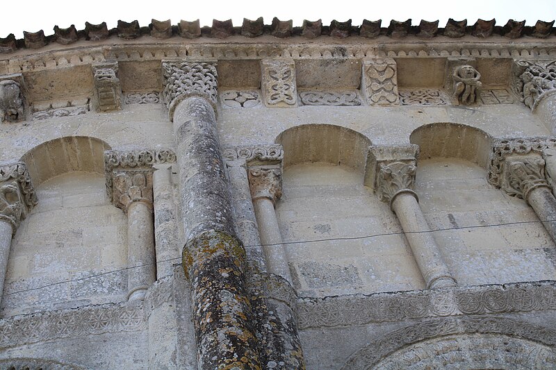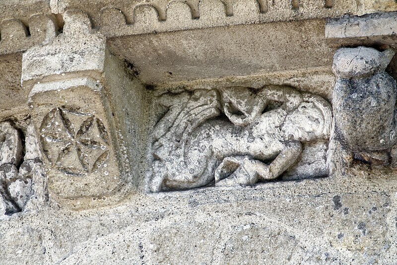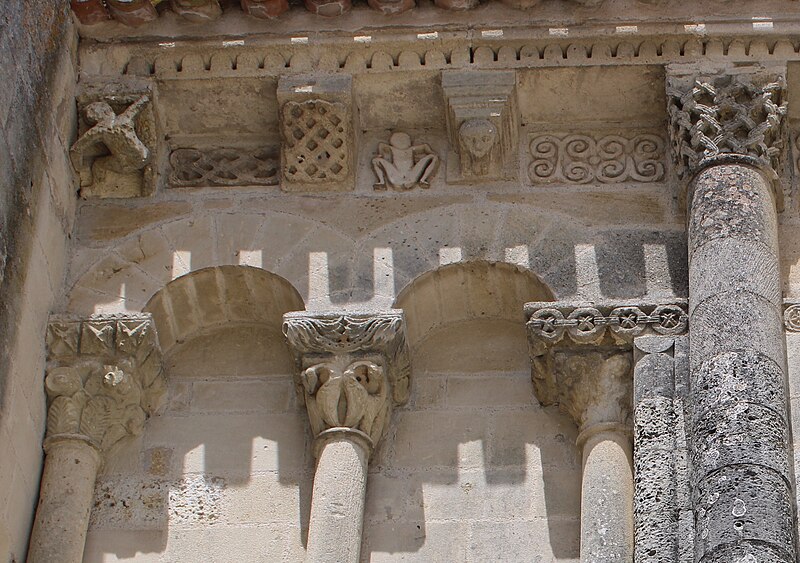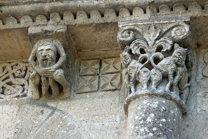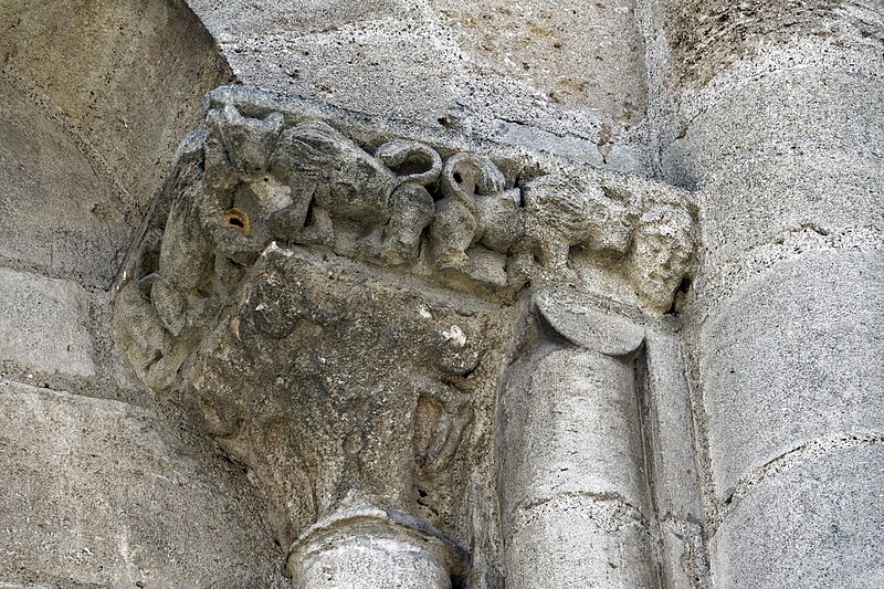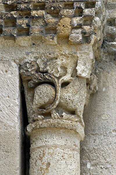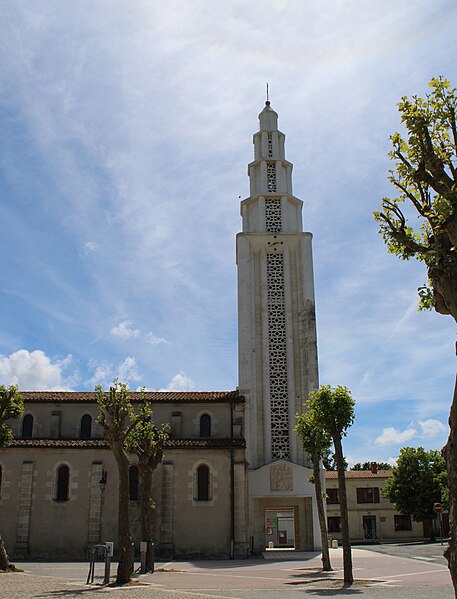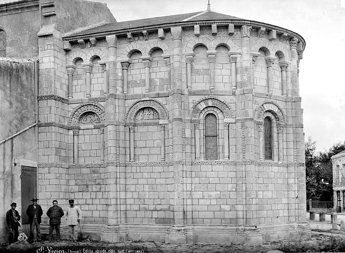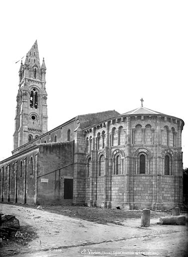 L'église Saint-Vivien, située au centre du bourg de Saint-Vivien-de-Médoc en Gironde, conserve des éléments remontant au XIIe siècle. La partie romane a été classée en 1862 et l'ensemble de l'édifice inscrit en 2008. L'édifice associe une abside romane, une nef élargie au XIXe siècle avec bas-côtés et un clocher reconstruit au XXe siècle. Selon la tradition locale, l'église s'élèverait sur l'emplacement d'un lieu de culte paléochrétien et d'un ancien site païen, mais aucune trace de ces phases antérieures n'a été retrouvée. De l'église romane du XIIe siècle subsistent principalement l'abside et les chapiteaux de l'arc triomphal ; l'abside a été démontée puis remontée lors des travaux de 1880. La nef a été agrandie et reconstruite sous la direction de l'architecte Édouard Bonnore au XIXe siècle, qui a notamment ajouté deux bas-côtés. L'édifice a été fortifié et a subi un incendie lors des conflits religieux, puis a connu un état de délabrement pendant la Révolution, nécessitant des campagnes de restauration au XIXe siècle. En 1877 la foudre endommagea gravement le clocher et fragilisa l'abside ; les travaux conduits par Bonnore aboutirent à la reconstruction et au remontage des éléments sculptés, achevés en 1882. Pendant la Seconde Guerre mondiale le clocher fut détruit et l'église endommagée ; le lambris du plafond et la voûte du chœur, détruits à cette période, ont été refaits dans les années 1960. Le clocher actuel, réalisé par l'architecte André Larcher dans les années 1950, est une tour carrée en béton ornée de claustras et de bas-reliefs dus au sculpteur Joseph Rivière. Il comprend quatre niveaux polygonaux formant une flèche et des baies percées de motifs circulaires ; la corrosion des armatures a toutefois provoqué des fissures qui exigent une restauration. Le chevet roman s'organise en neuf pans séparés par des colonnes engagées et présente trois registres : un registre médian d'arcades et de baies en plein cintre, un registre supérieur d'arcatures géminées et de fenêtres aveugles, et une corniche moulurée à modillons alternant avec des métopes sculptées. La décoration sculptée comprend des frises de billettes, de rinceaux et de fleurs à six pétales inscrites dans des cercles, ainsi que de nombreux modillons, métopes et chapiteaux dont certains historiés. Les pans du chœur, notamment les pans 1 et 2 au sud et 8 et 9 au nord, comportent des baies aveugles ornées de tympans et de chapiteaux richement sculptés ; deux tympans méridionaux se distinguent par des bas-reliefs figurant des personnages et des musiciens. Le tympan du pan 1 représente trois personnages, dont un musicien jouant du psaltérion, tandis que le tympan du pan 2 montre quatre personnages autour d'un objet sphérique dont l'interprétation reste discutée. Les autres pans du chevet offrent une variété d'iconographies romanes : animaux et créatures fantastiques, figures humaines, scènes bibliques comme la chute d'Adam et Ève, et compositions de rinceaux et d'entrelacs, certains chapiteaux ayant été restaurés au XIXe siècle. Les chapiteaux de l'arc triomphal comportent notamment une Pesée des âmes où saint Michel tient la balance tandis que des diables s'efforcent de fausser le jugement, et l'ensemble sculpté présente aussi des animaux superposés typiques de la sculpture romane du Sud-Ouest. À l'intérieur, la nef est séparée des bas-côtés par cinq arcades en plein cintre à doubles tores sculptés de feuillages, rubans et perles ; les piliers reçoivent des colonnes engagées à chapiteaux végétaux et un bandeau de rinceaux court au-dessus des arcades. Nef et bas-côtés sont couverts de lambris et éclairés par des fenêtres en plein cintre ; dans la première travée du chœur, deux portes donnent accès aux sacristies et sont surmontées de médaillons sculptés aux armes épiscopales et papales. Le sanctuaire comporte deux travées aveugles formant le chœur et conserve plusieurs chapiteaux romans malgré les restaurations du XIXe siècle. Les fonts baptismaux se situent dans le bas-côté nord et un monument aux morts occupe le bas-côté sud ; la porte d'accès est surmontée d'une tribune d'orgue accessible par un escalier en bois. L'orgue actuel a été construit en 1983 par Bernard Chevrier et inauguré le 18 juin 1983 par Louis Robillard.
