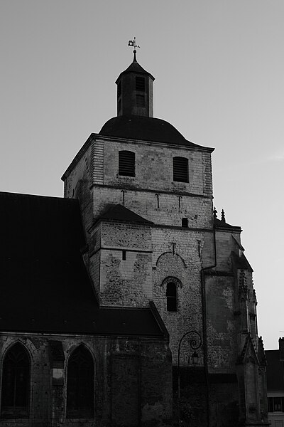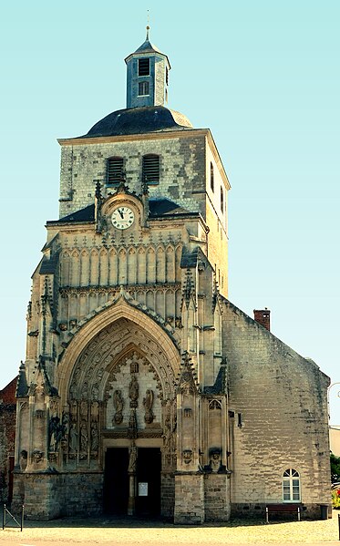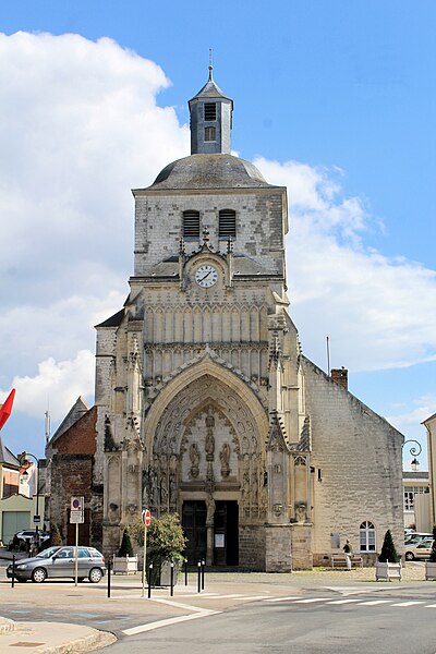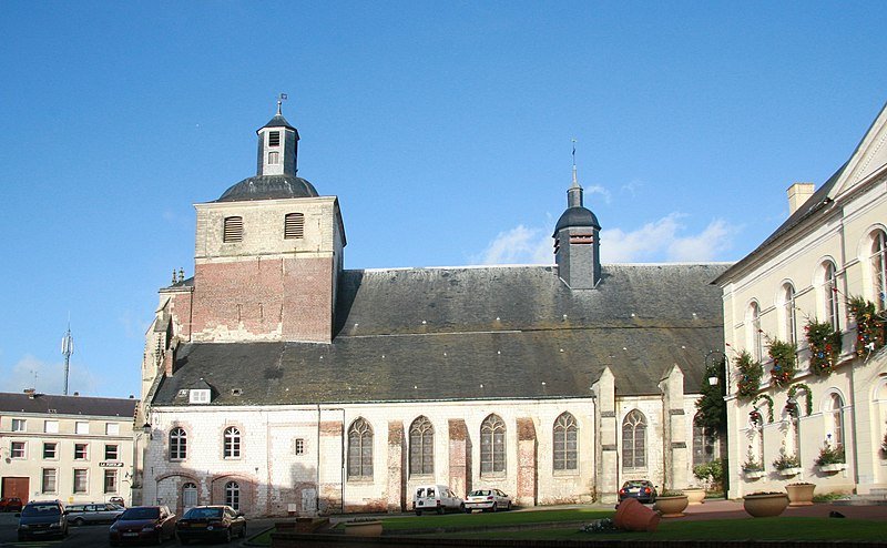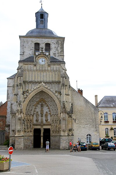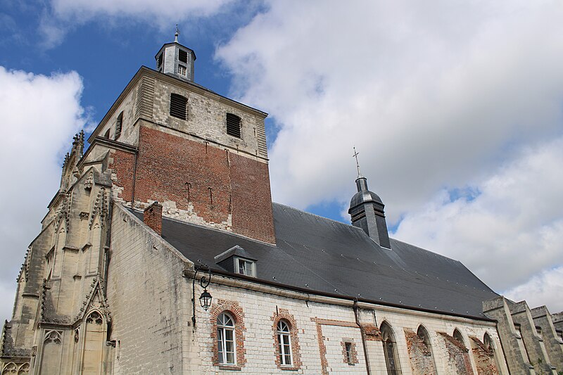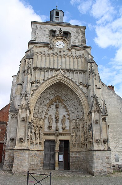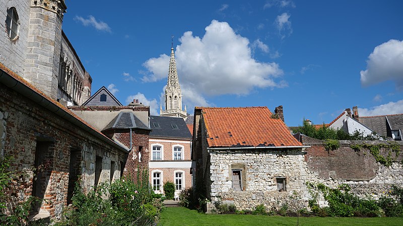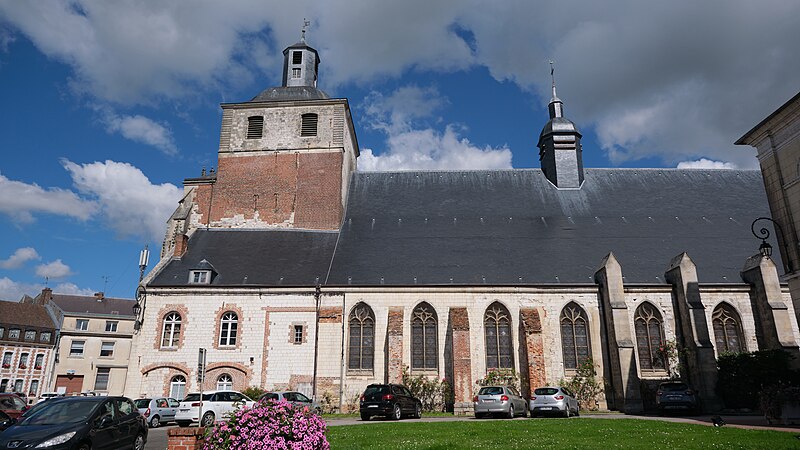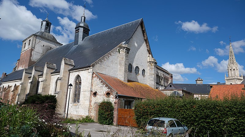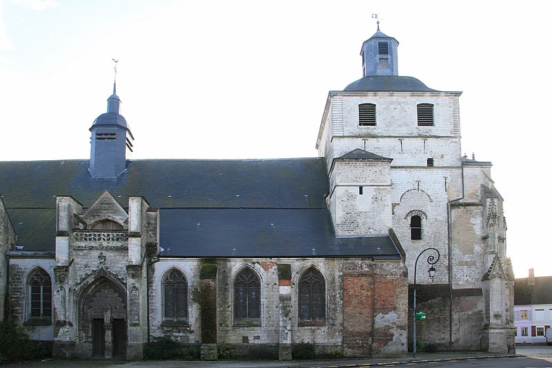 L’église Saint-Saulve est une église catholique située à Montreuil-sur-Mer, dans le département du Pas-de-Calais (région Hauts-de-France), et elle est classée au titre des monuments historiques depuis 1910. À l’origine abbatiale, sa construction remonte au XIe siècle ; elle comprenait un clocher-porche encadré par deux tours, une nef avec collatéraux, un transept flanqué de quatre chapelles, un chœur à déambulatoire ouvert sur trois chapelles rayonnantes et deux tours surplombant les bas-côtés orientaux du transept. L’édifice a été remanié aux XIIIe et XVIe siècles après un incendie qui provoqua l’effondrement des voûtes, et une chapelle dédiée à Notre-Dame fut ajoutée au bas-côté nord au XVe siècle. Les catastrophes de 1467 et 1537 ont profondément modifié le plan et l’élévation : ne subsistent du plan primitif que le clocher-porche, la base de la tourelle gauche, la nef avec ses bas-côtés et la chapelle Notre-Dame. Depuis le parking situé à l’arrière de la mairie, on aperçoit les vestiges du chœur et des chapelles rayonnantes. La nef compte huit travées, les trois dernières étant aujourd’hui occupées par le chœur, et seul le bas-côté nord a résisté à l’incendie de 1537. Le collatéral sud a été reconstruit entre 1596 et 1631, comme l’indiquent les armes de l’abbé Godefroy de La Rue sur une clé de voûte ; ses deux dernières travées ont été élevées en 1819 puis voûtées en 1869. Après 1537, l’élévation s’est réduite à deux niveaux : de grandes arcades reposant sur des piliers octogonaux et un triforium remanié vers 1480, à l’exception de la dernière travée nord qui date du XIIIe siècle. La voûte ornée de liernes et de tiercerons, exécutée au milieu du XVIe siècle, a été reprise environ cinq mètres plus bas que la précédente, et la disparition des fenêtres hautes a assombri l’édifice, désormais éclairé par les fenêtres géminées des collatéraux et trois oculi au-dessus du maître-autel. L’église conserve l’un des plus riches trésors d’église du nord de la France : le trésor de l’abbaye Saint-Saulve ayant été détruit lors de l’autodafé de 1793, la collection actuelle provient essentiellement de l’abbaye Sainte-Austreberthe et comporte quelques éléments du XIXe siècle. La plus ancienne pièce est la crosse pastorale attribuée à sainte Austreberthe, abbesse de Pavilly : son manche en bois, daté de la fin du VIIe siècle, fut richement orné au XIIe siècle. On y trouve également de beaux reliquaires d’émail ou d’argent doré ornés de cabochons et de pierres semi-précieuses, principalement visibles lors de visites guidées, ainsi que plusieurs reliquaires en argent repoussé du milieu du XVIIe siècle présentés à l’extrémité du collatéral nord, témoins de l’ancienne richesse de l’abbaye bénédictine Sainte-Austreberthe.