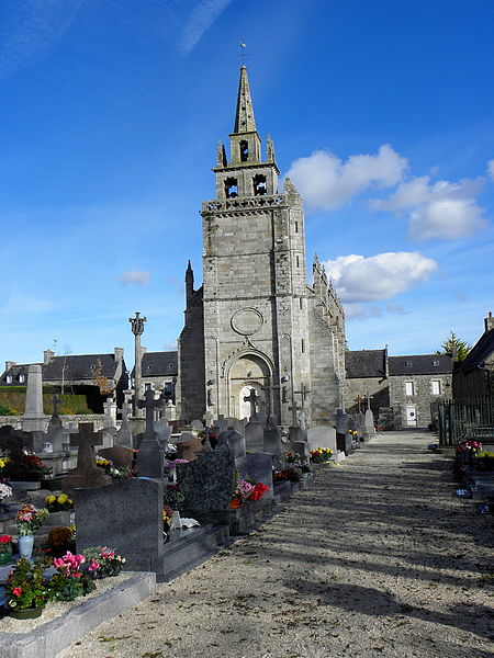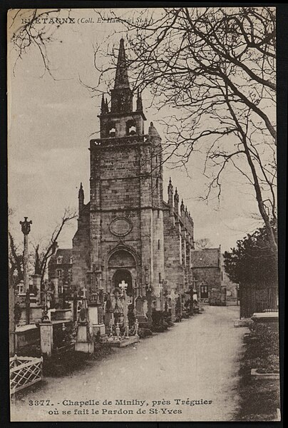 Ancienne chapelle du manoir de Kermartin, l'église Saint-Yves présente une nef unique de cinq travées voûtées en croisée d'ogives. La façade occidentale constitue le soubassement du clocher et le porche se caractérise par des meneaux occupant la partie haute de l'arcade. L'extrémité ouest fut remaniée au début du XIXe siècle : la façade fut entièrement refaite en 1819 en réutilisant des éléments de l'ancien clocher, notamment des balustrades et des pinacles. En 1418, la petite tour reçut une flèche et le sanctuaire fut séparé de la nef par une grille de bois sculpté ; certains éléments de ce clocher de 1418 ont été remployés dans la construction du clocher actuel. La chapelle primitive fut fondée par Yves Hélory de Kermartin sur un terrain dépendant de sa maison familiale, d'abord placée sous les vocables de Notre-Dame et de Saint-Tugdual, puis, après sa canonisation, sous celui de Saint-Yves. En 1293, Yves Hélory de Kermartin fit bâtir, sur ses fonds personnels, une chapelle qu'il dota du statut de chapellenie, dotée d'un patrimoine foncier indépendant. Les chapelains logeaient dans une maison qui leur était dédiée, surnommée la « maison des chapelains » ou chapellenie de Saint-Yves. L'oratoire primitif s'est peu à peu élargi pour devenir une église, mais de l'édifice dû à Saint-Yves il ne reste aucune trace visible ; cependant, dans le bas du côté nord de la nef actuelle subsisterait une partie du mur primitif. La chapelle actuelle est datable du milieu du XVe siècle, comme l'attestent les armoiries sur les clés de voûte, l'analyse des décors et la mise en œuvre. Devant devenir le siège d'une nouvelle paroisse au début du XIXe siècle, l'édifice fut agrandi vers l'ouest par l'adjonction d'une travée entre 1819 et 1824, travaux accompagnés de la reconstruction de la façade ouest et du clocher. Une sacristie fut construite en 1853 contre la travée de la porte de la chapellenie, côté sud. Les pinacles des contreforts et le garde-corps à la base du toit datent de 1889. De nouveaux vitraux et du mobilier complètent l'ensemble ; le maître-autel a été réalisé par Jean Larchantec de Morlaix en 1872.