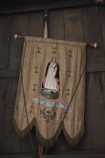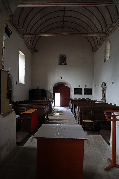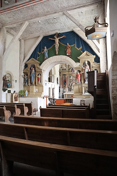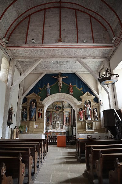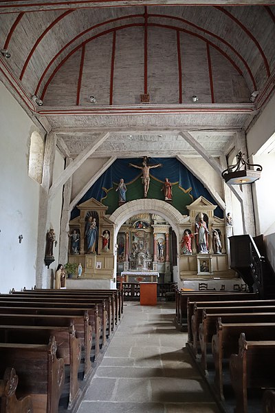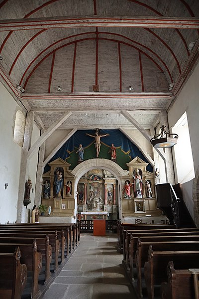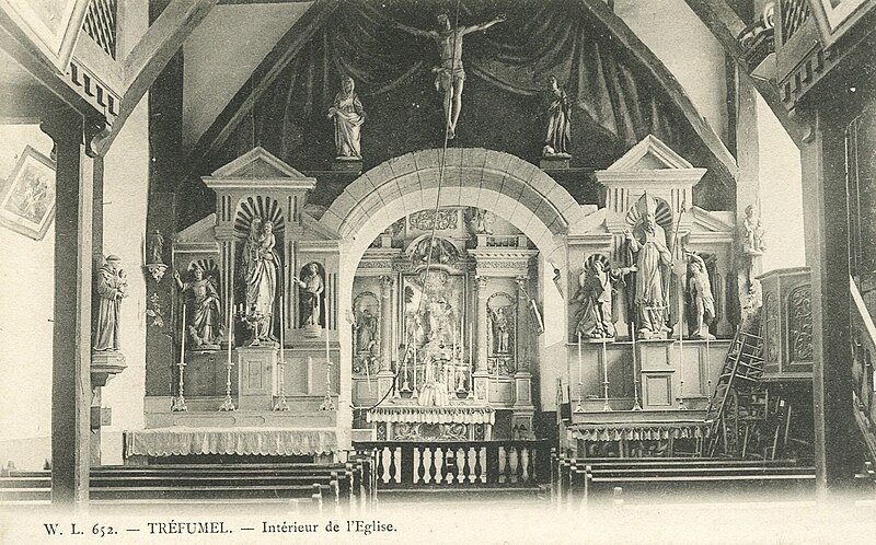 L'église Sainte-Agnès de Tréfumel, dans les Côtes‑d'Armor, conserve le volume initial d'une nef lambrissée et d'un chœur rectangulaire, en grande partie datés des XIe‑XIIe siècles ; l'édifice est inscrit à l'Inventaire supplémentaire des monuments historiques depuis 1964. La nef unique, accessible par un porche latéral sud, est prolongée à l'est par un chœur plus étroit à chevet plat, séparé de la nef par un arc diaphragme. Le plan, sans contreforts et avec clocher de charpente à l'extrémité de la nef, rappelle plusieurs églises romanes de Haute‑Bretagne; une porte nord, dite « porte des moines », donne directement accès au chœur. Au XIVe siècle la façade sud a été remaniée : un porche a été ajouté et une fenêtre à deux lancettes percée dans la partie est de la nef ; c'est aussi à cette époque qu'une arcade a été ouverte dans la partie haute du mur nord du chœur pour créer une chapelle seigneuriale en étage. Les travaux des XVe et XVIe siècles semblent avoir concerné le portail ouest, la reconstruction du porche sud et la refonte de la charpente, qui prit alors une pente plus forte. La sacristie actuelle, reconstruite en 1660 contre le mur nord du chœur à l'emplacement de l'ancienne, comporte un étage formant tribune et communique avec le chœur par une porte inscrite de la date 1660. Une grande fenêtre rectangulaire a probablement été ouverte dans le chœur à la même époque. Les restaurations de 1866 ont entraîné l'ouverture de nouvelles baies rectangulaires au mur sud et l'installation d'une vaste tribune en bois au bas de la nef pour accroître la capacité d'accueil. Une seconde campagne de restauration vers 1950 a conduit à l'enlèvement des enduits intérieurs; l'enclos paroissial a été fortement réduit après la Seconde Guerre mondiale au profit de la circulation automobile, ce qui a isolé l'église dans la voirie; une reconsidération de son environnement a été récemment décidée par le conseil municipal. L'édifice est construit principalement en granite brun doré et en calcaire coquillier des faluns, employés différemment selon les élévations : l'extérieur présente des lits alternés et des assises mixtes, alors que les parements intérieurs sont entièrement en calcaire. La surélévation des trois pignons, liée au renouvellement de la charpente au XVe siècle, est visible, et la sacristie reconstruite en 1660 est entièrement en calcaire des faluns. Le porche actuel, qui repose sur une structure charpentée proche de celle de la nef, conserve des indices d'aménagements en appentis et de planchers anciennement soutenus par des poutres et boulins ; cette organisation permet d'envisager, comme le veut la tradition locale, un usage supérieur isolé similaire à des ossuaires ou tribunes seigneuriales. À l'intérieur, le clocher de charpente est ancré par de grands poteaux à la jonction de la nef et du chœur, et l'arc diaphragme a été repris lors d'importants travaux du XVIIe siècle; la mouluration ajoutée se raccorde aux retables latéraux en pierre et au groupe de la Crucifixion attribué à la même période. La porte de la sacristie est encadrée de pilastres et flanquée de pinacles réemployés, tandis que l'arcade en tiers point qui ouvre la tribune sur le chœur, de mouluration à larges redents, remonte à la seconde moitié du XIVe siècle ; cette tribune, qualifiée parfois de « tribune des chantres », correspond en réalité à une tribune seigneuriale liée aux familles locales. La charpente de la nef, lambrissée, présente des chevrons‑fermes et des couvre‑joints simples avec clefs pendantes en forme de balustre, caractéristiques d'une réfection de la fin du XVIe ou du début du XVIIe siècle ; dans la partie du clocher, l'absence de traces de clous atteste de la contemporanéité du beffroi et de la charpente de la nef. La charpente du chœur, en arc brisé et accessible depuis la sacristie, comporte des fermes moulurées tous les deux éléments et est partiellement masquée par un hourdis de terre probablement mis en place lors d'une remise en état ancienne. Le mobilier forme un ensemble cohérent datable de la seconde moitié du XVIIe et du début du XVIIIe siècle : deux petits retables en calcaire adossés à l'arc triomphal sont vraisemblablement contemporains de la sacristie de 1660, les fonts présentent une niche‑retable en bois datée de 1679 avec un groupe du Baptême du Christ, et le maître‑autel en bois, attribué au sculpteur Edouard Piel d'après des dessins de François de la Morissais, date du début du XVIIIe siècle. On trouve aussi une bannière datée de 1778 et signée L'Epine (Jean Loup), plusieurs statues polychromes dont une Education de la Vierge du XVIe siècle, ainsi que des dalles funéraires du XVe siècle, dont celle de la famille Hingant du Hac apposée près de l'ancienne porte nord et une dalle retaillée figurant les armes de Coëtquen et Beaumanoir.