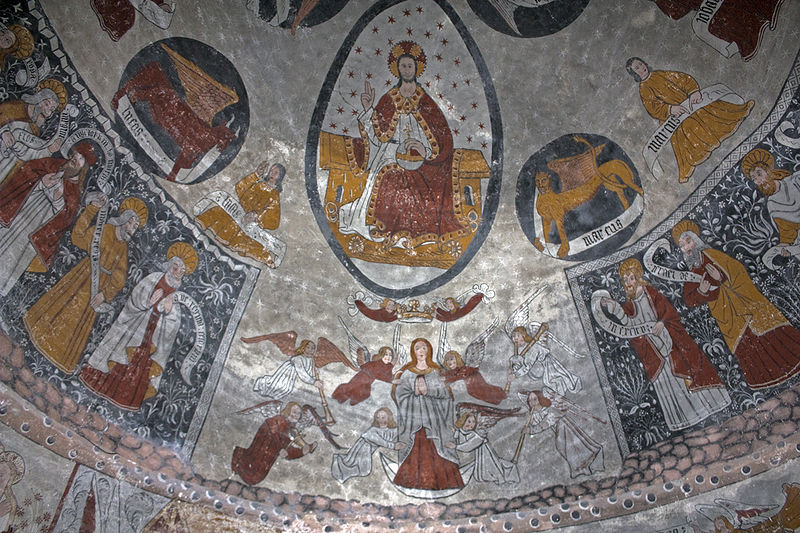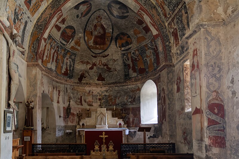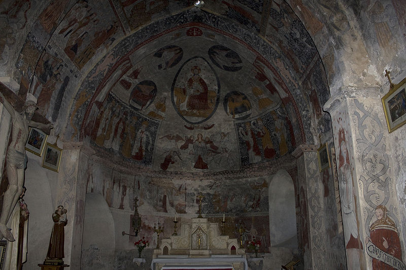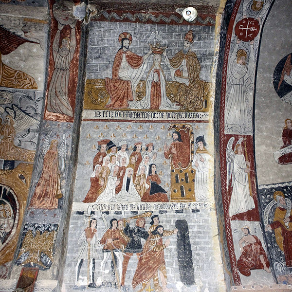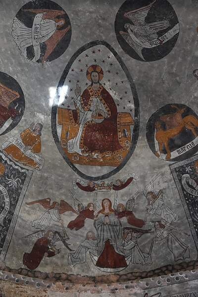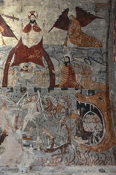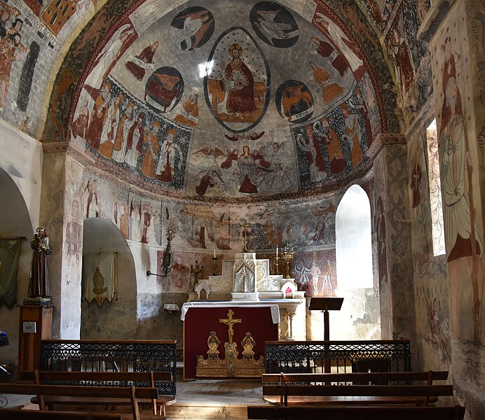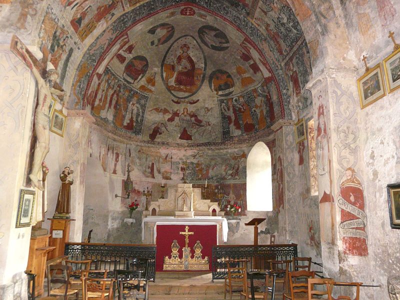 Les peintures murales, redécouvertes en 1873 sous un badigeon, sont réalisées sur un enduit rustique et, bien que d'inspiration médiévale, sont généralement datées de la seconde moitié du XVe siècle ; leur palette réduite et la sûreté du trait témoignent d'une grande habileté. Dans l'abside, au-dessus de l'autel, figure l'Assomption de la Vierge entourée des symboles des quatre évangélistes et de groupes de personnages auréolés portant des phylactères ; plus bas sont représentées la Nativité et l'Adoration des bergers ainsi que des scènes de la Passion, notamment la flagellation. La voûte sud de la première travée illustre la création et la chute d'Adam et Ève en trois tableaux, montrant la formation d'Ève, la tentation et l'expulsion du Paradis, avec des éléments symboliques comme l'Arbre de la Connaissance, le serpent et un château fort en arrière-plan. La voûte nord de la première travée montre le couronnement de la Vierge et, en dessous, le prêche et l'arrestation de saint Jean-Baptiste. La voûte sud de la deuxième travée représente la Nouvelle Jérusalem en trois zones successives évoquant le ciel et le purgatoire, avec des figures d'apôtres, de vierges portant la palme et des personnages tenant des textes de l'office des morts. La voûte nord de la deuxième travée offre la scène la plus détaillée, le Jugement dernier, divisé en trois registres : le ciel étoilé avec des anges sonnant la trompette, le monde terrestre centré sur le Christ en majesté, et la pesée des âmes par saint Michel suivie de la condamnation des damnés et de l'appel des élus. Sur les contreforts sont peints des anges, un grand saint Christophe et divers personnages invitant à l'écoute de la parole du Christ.